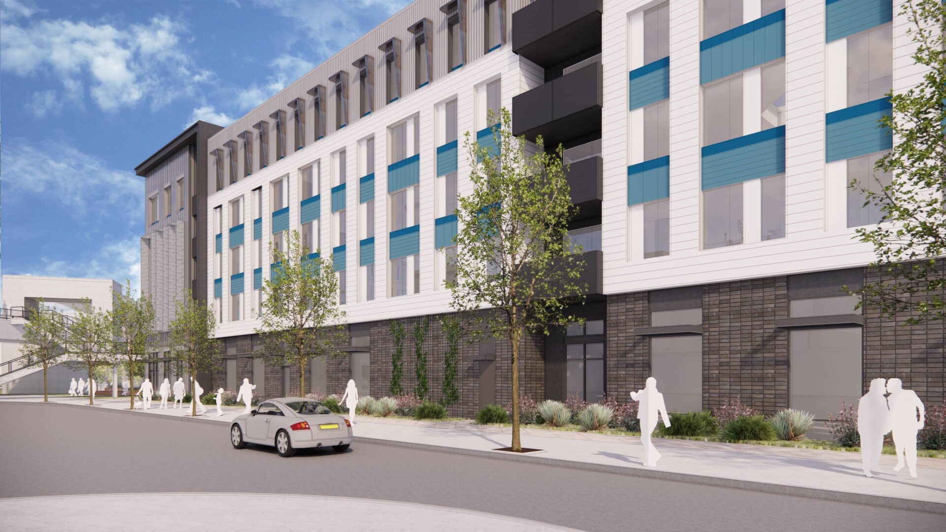 The development benefits from integrated sustainable features that meet our client’s goal for AHSC funding. Our site plan minimizes paved areas to create opportunities for landscaping and protected pedestrian access. Amenities orient away from southern solar exposure to limit stress on mechanical cooling systems, and the building uses architectural screening and shade devices to further reduce its impact. The integration of the BART plaza and the central living street with limited vehicular access, creates both formal and informal opportunities for residents to engage, gather, and develop community.