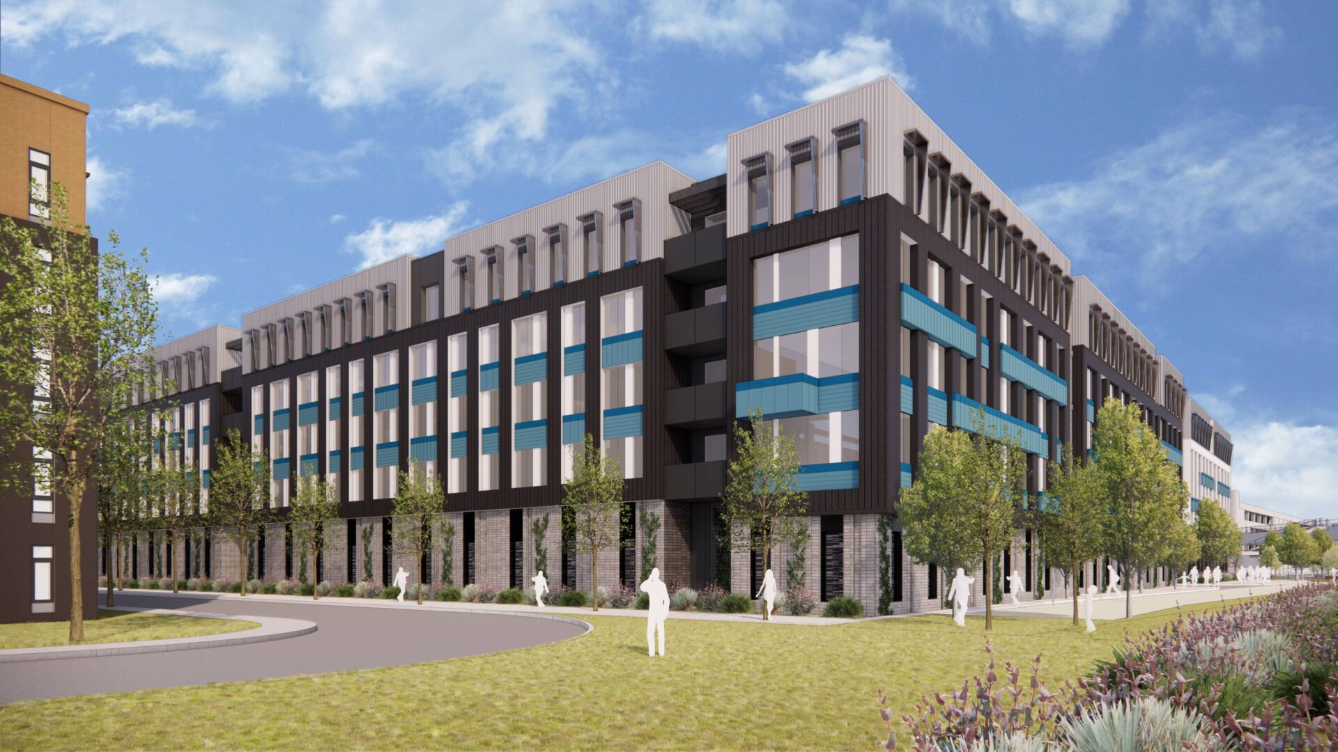 Site layout, facade character and building design comply with the Downtown Dublin Specific Plan and TOD objectives. The five-story building creates a range of units for all family sizes, specifically addressing the affordability challenge in downtown Dublin. A contemporary, industrial-inspired style matches the finish to the overall character of the neighborhood. The building is expressed with a podium to house amenities and parking, a uniform residential midsection, and accented forms along the top, while priority corners serve as tower expressions.