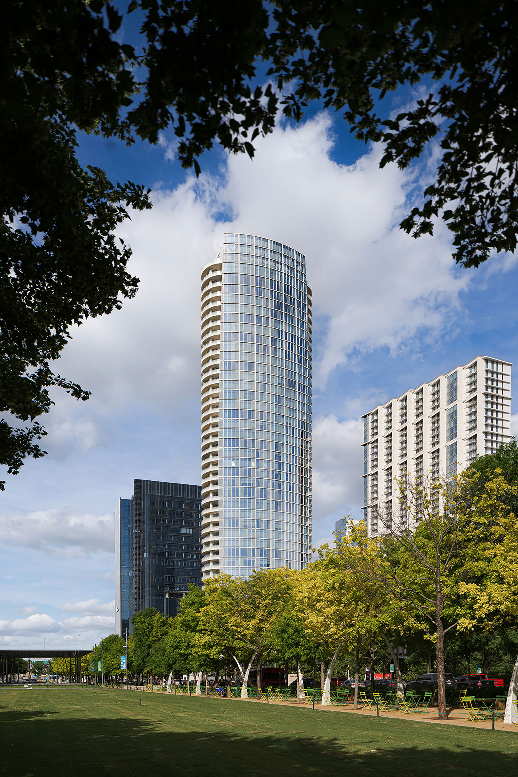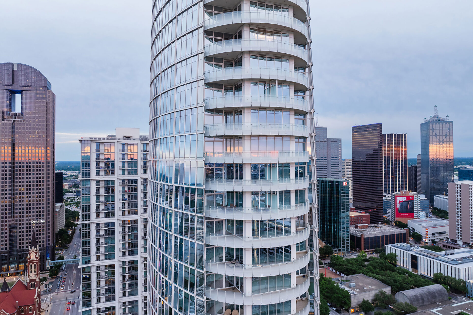A sleek, striking glass facade complements the tower’s graceful form and serves both a functional and aesthetic purpose. The building’s exterior is clad in a sophisticated glass curtain wall system that provides panoramic views of the Dallas skyline and the nearby Dallas Arts District, from which the tower draws its inspiration. Its oval shape marries form and function; a unique silhouette that increases residential balcony space and improves resident views.