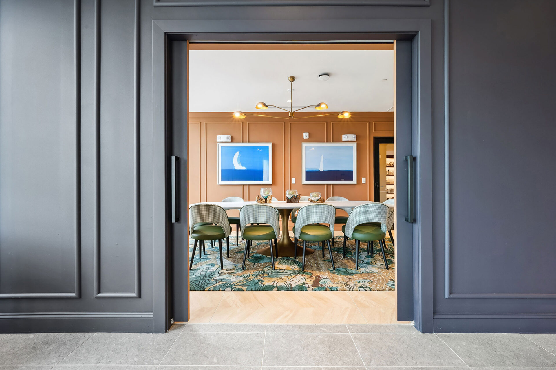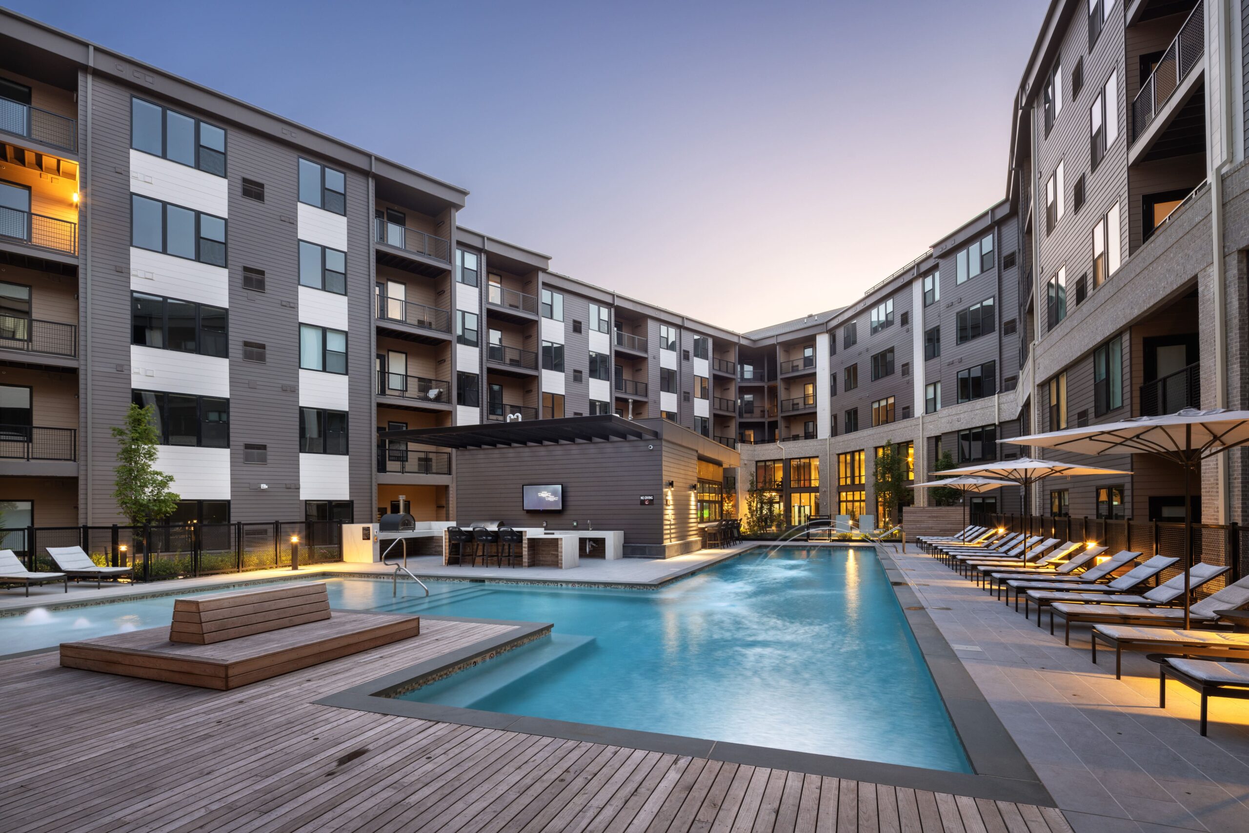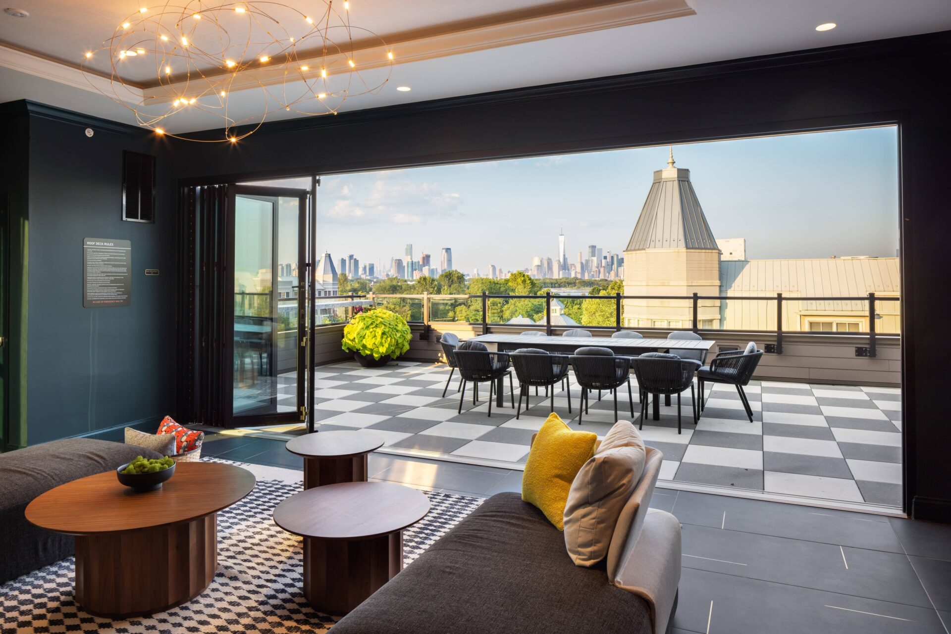 These sophisticated Manhattan inspired residences sit at the crossroads of a suburban and coastal location 20 minutes from downtown Manhattan facing the Hudson River in Jersey City, NJ. The contemporary architecture takes its cue from midcentury modern design. Horizontal rhythms encompass contrasting architectural grids. Creams and dark grays highlight the dramatic contrast of volumes, while the wood accents establish the tactile warmth and texture of the façade. Each end of the community maximizes views from the units with the extended layout while creating open and enclosed courtyards where the indoor and outdoor amenity spaces sit. Part of the north top floor overlooks the city and contains both public and private open roof decks with spectacular views of the Statue of Liberty and downtown Manhattan. A majority of the units lean towards a larger square footage, allowing spacious living units for residents. The community aims to meet the needs of the population moving out of Manhattan, delivering all elements of an urban community within a unique geographical location. A large, dedicated amenity space contains co-working and work from home spaces, a demonstration kitchen with a private dining area, and multiple fitness areas for yoga, barre, personal training and general fitness. Additional amenities include a commuter lounge, pet washing and grooming station, package delivery and storage concierge, game room, rooftop bar and children’s play area complete with a rock wall. The community’s urban architectural character, combined with the convenience of a coastal and suburban environment, is a highly appealing living option for those searching for an active lifestyle.