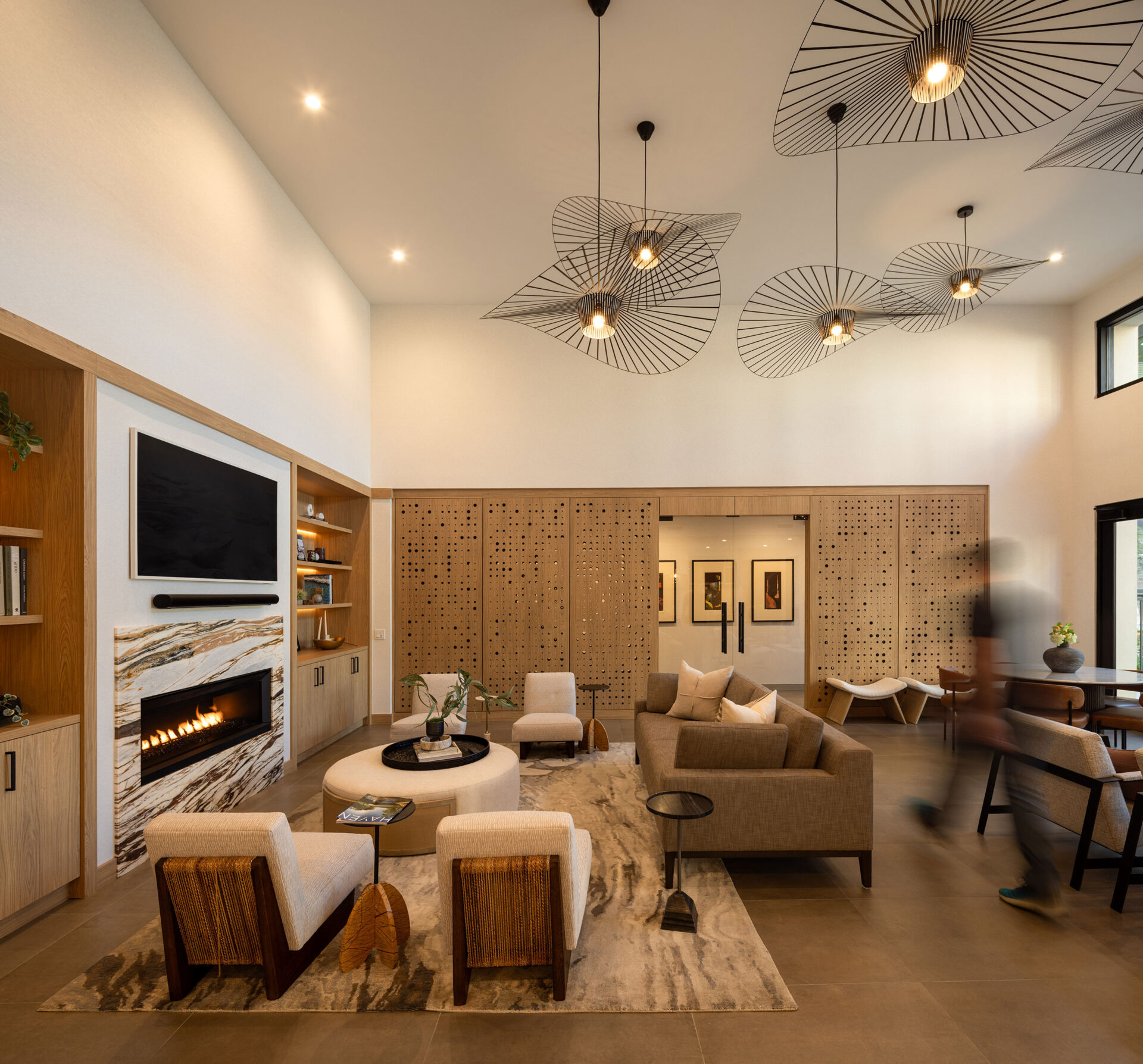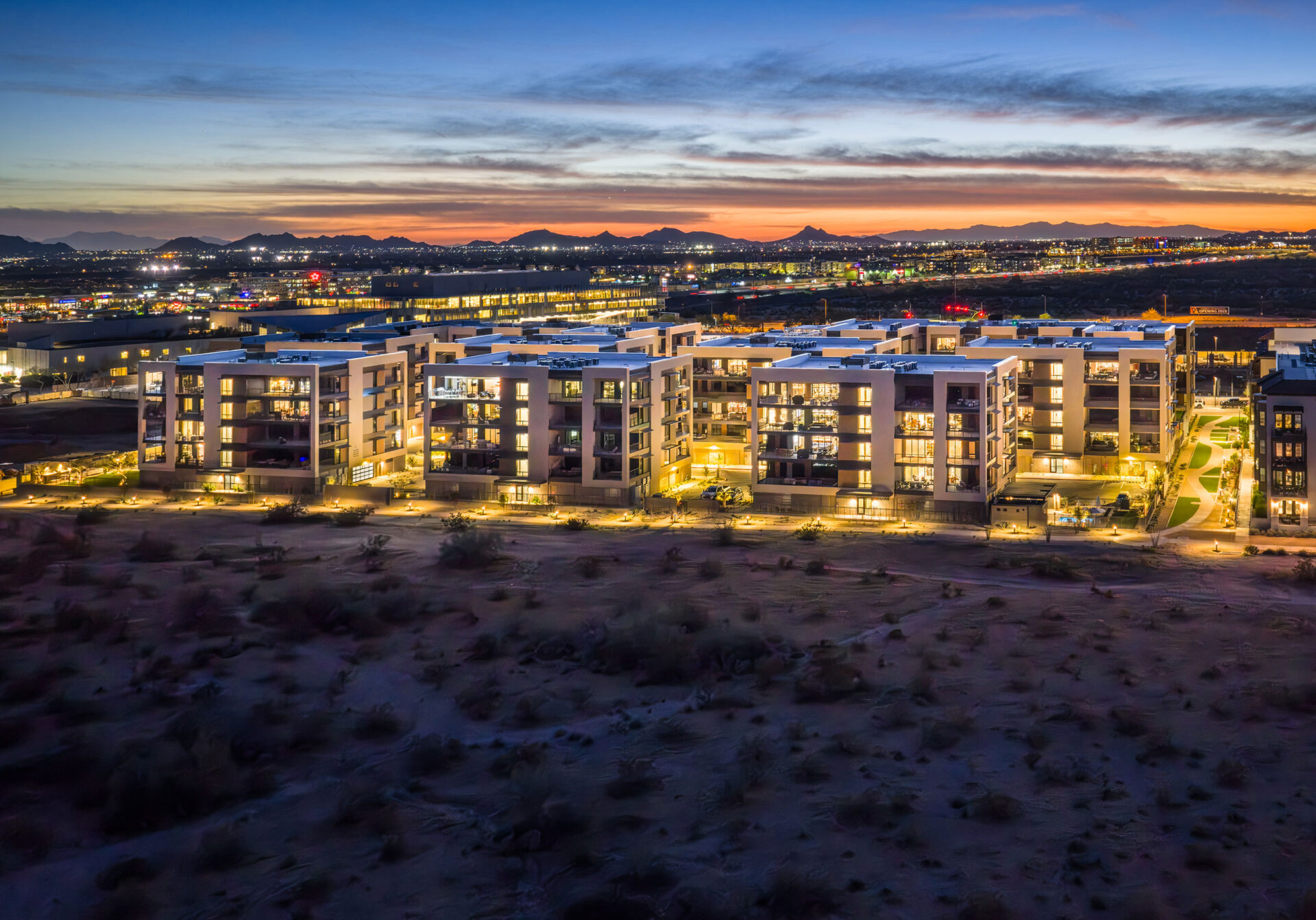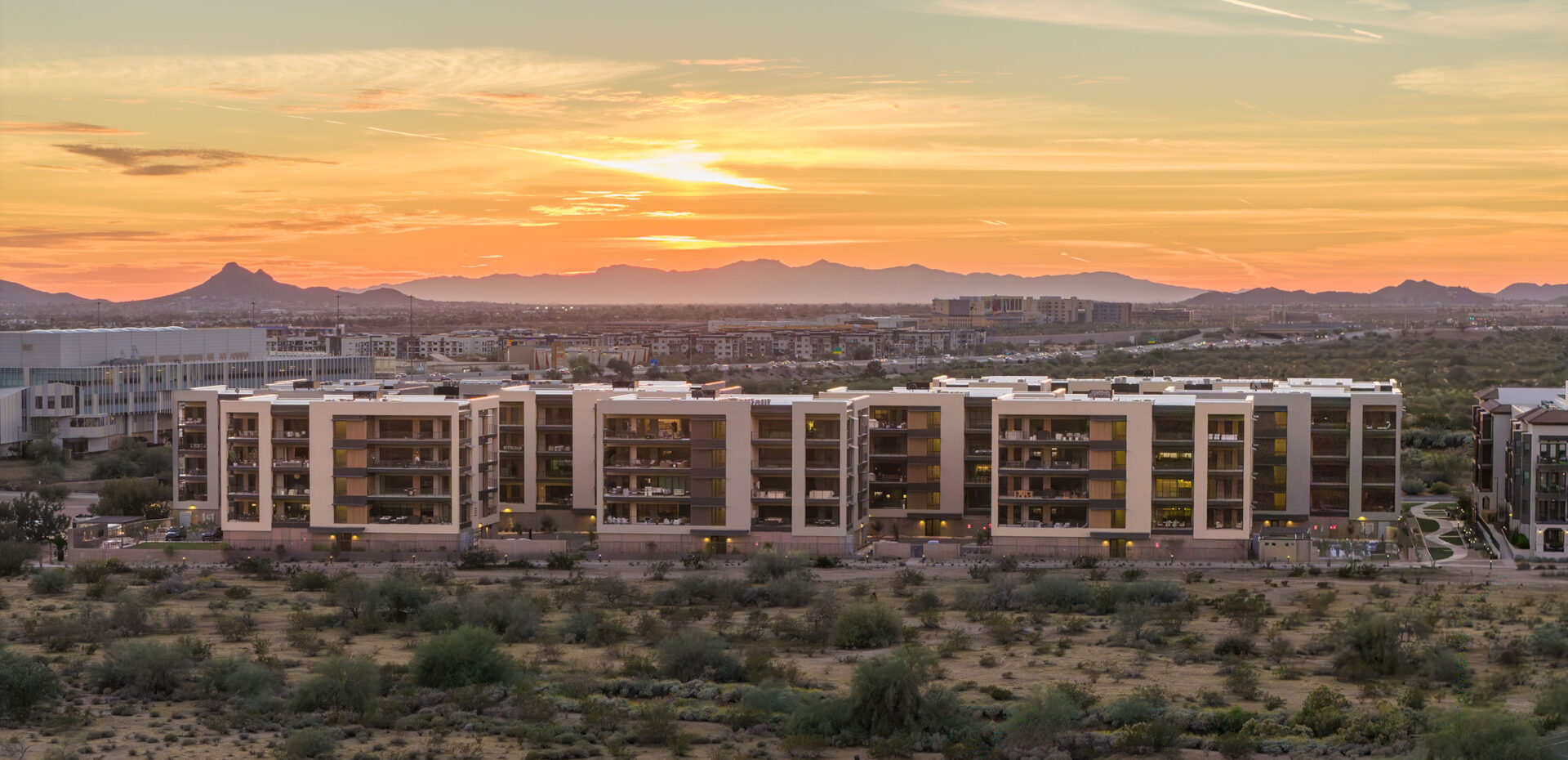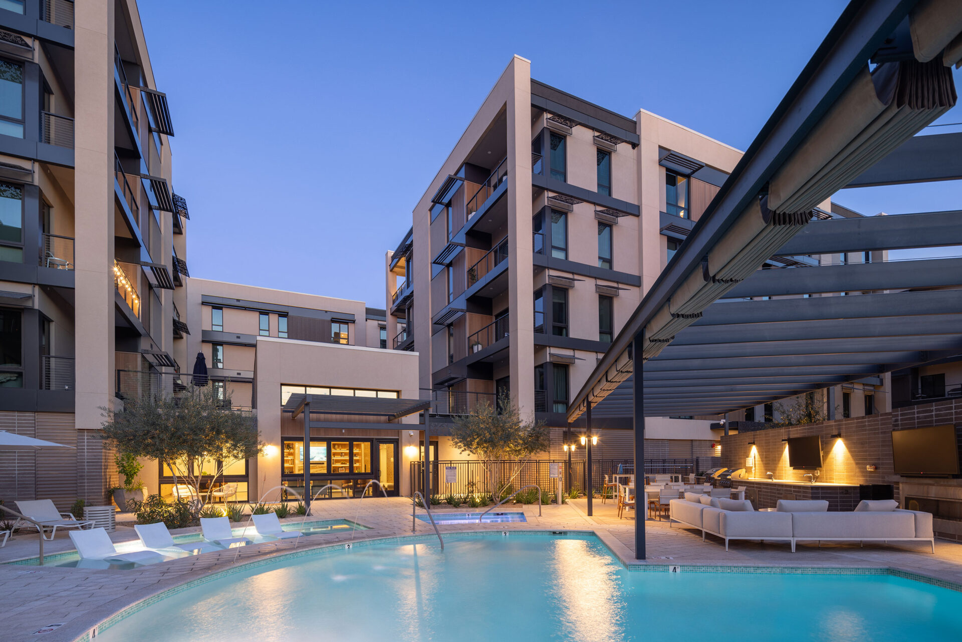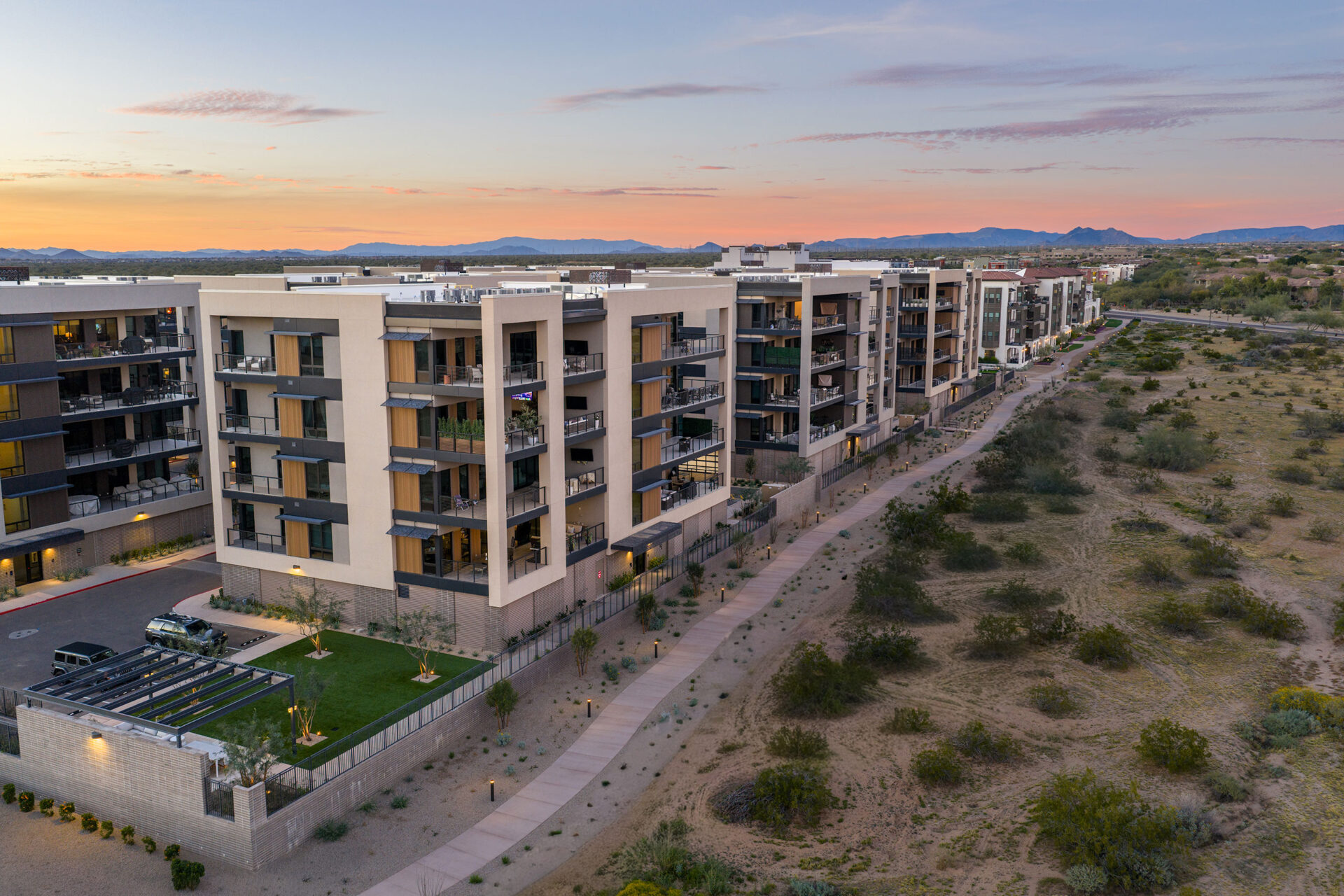 Portico, a collection of one- to three-bedroom condominiums, brings an air of contemporary luxury to North Scottsdale, Arizona. Designing Portico with the surrounding landscape in mind, the architects maintained mountain views throughout the site by creating breaks between the buildings and utilizing wide streets to offer more breathing room among the structures. The urban canyon effect was eliminated by an open and closed façade strategy where only windows are placed on one side of the structure and expansive, mountain-facing terraces sit on the other side. Each building steps as needed to combat the 12-inch slope seen steadily across the entire site. The architectural language of Portico speaks to a classic modern design — sharp, clean lines accented by a combination of industrial materials like black steel beams, perforated metal, rich wood panels and cool gray and white stucco. In addition to the luxurious atmosphere enhanced by radiant landscaping, residents enjoy a clubhouse, fitness area, pool, amenity kitchen, pocket parks and grill stations that offer a balance between indoor and outdoor lifestyle.