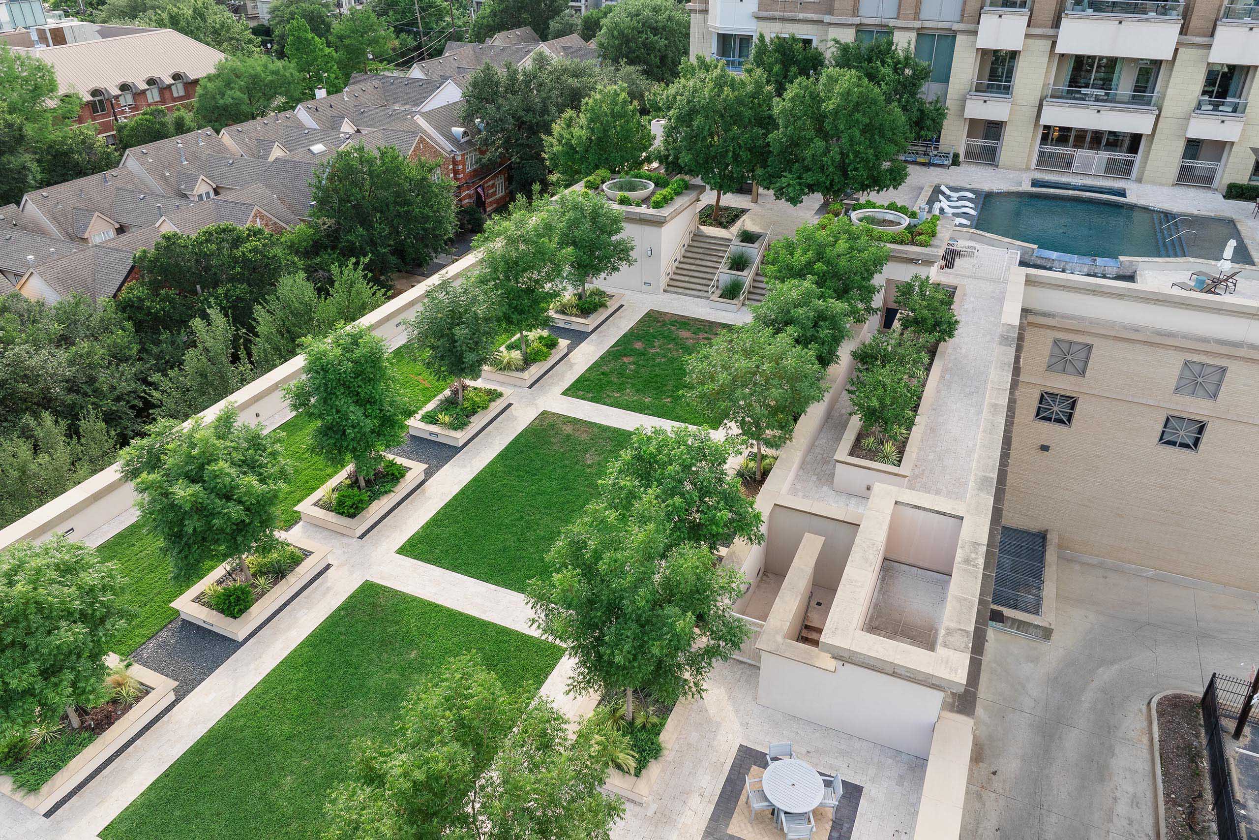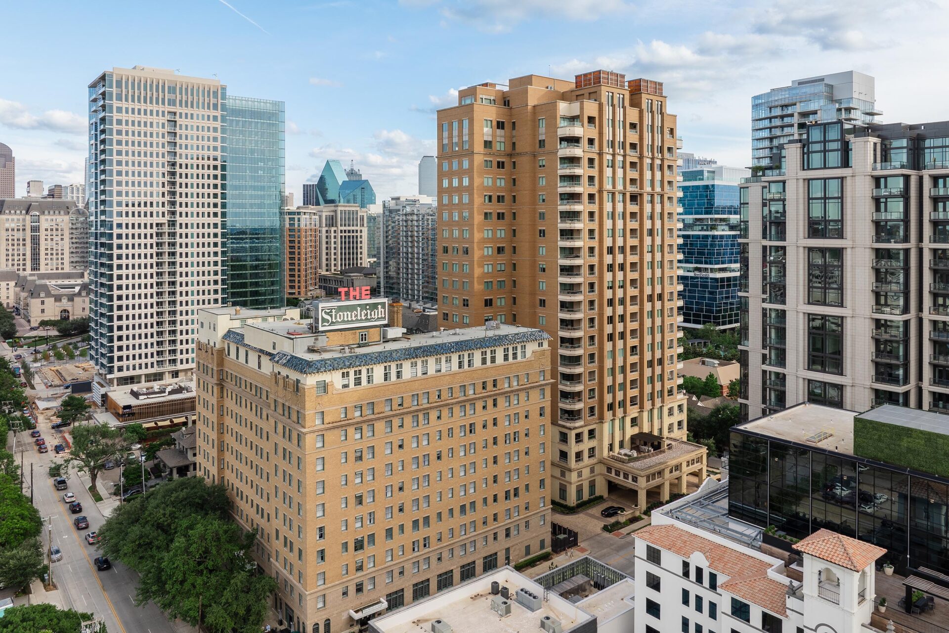 A hospitality influence lends to a sheltering arrival sequence and port cochere. Design aesthetics are intended to reflect the history and respectability of the hotel next door, in a series of collaborative design decisions that benefit the hotel, the client and the unit owners. Punch windows give Stoneleigh a refined urban flair, and shared branding and amenities with the hotel extend of the luxury and exclusivity of both. Large and deep balconies are built into the footprint, making them more a part of the home than cantilevered balconies. Staging of interstitial floors keeps residents happy during unit build outs, and exclusive amenities include a private dining room with catering kitchen, a raised and landscaped courtyard, pool and spa amenities as well as walking access to the Katy Trail.