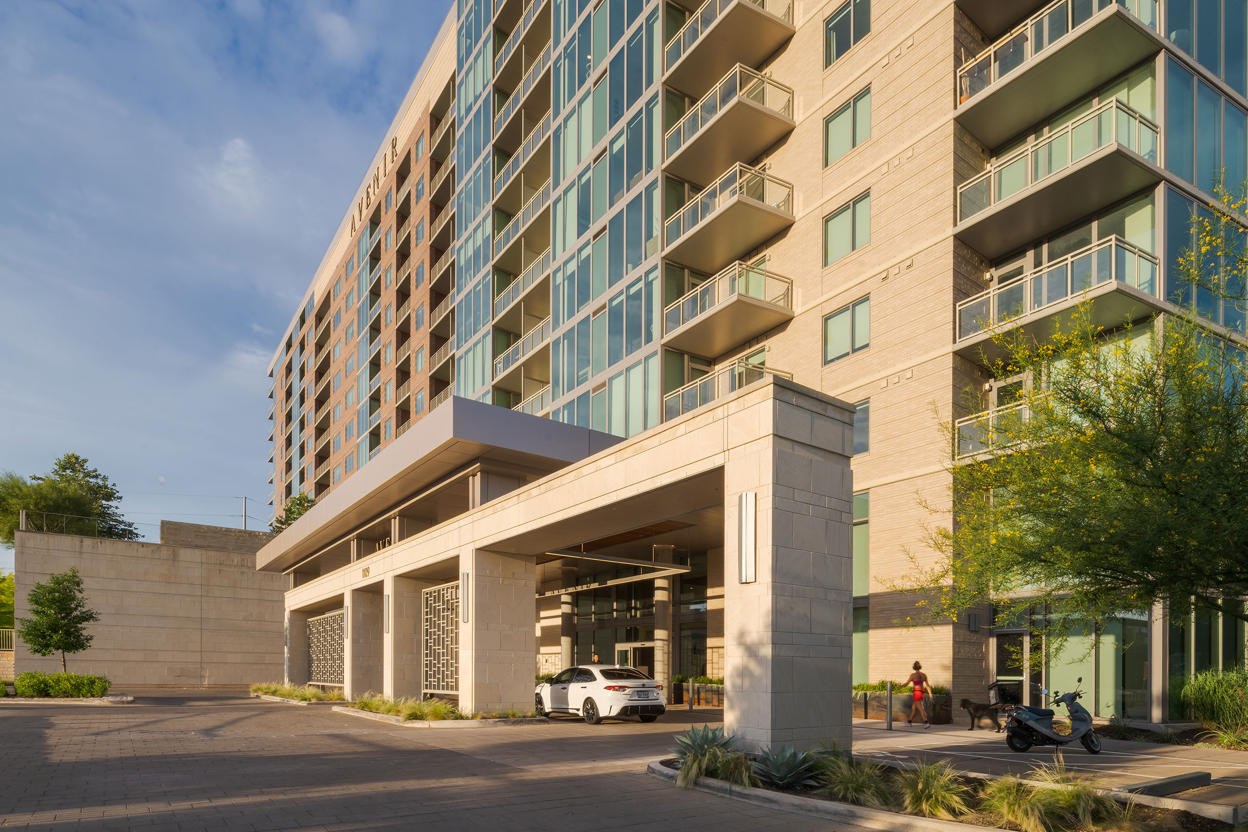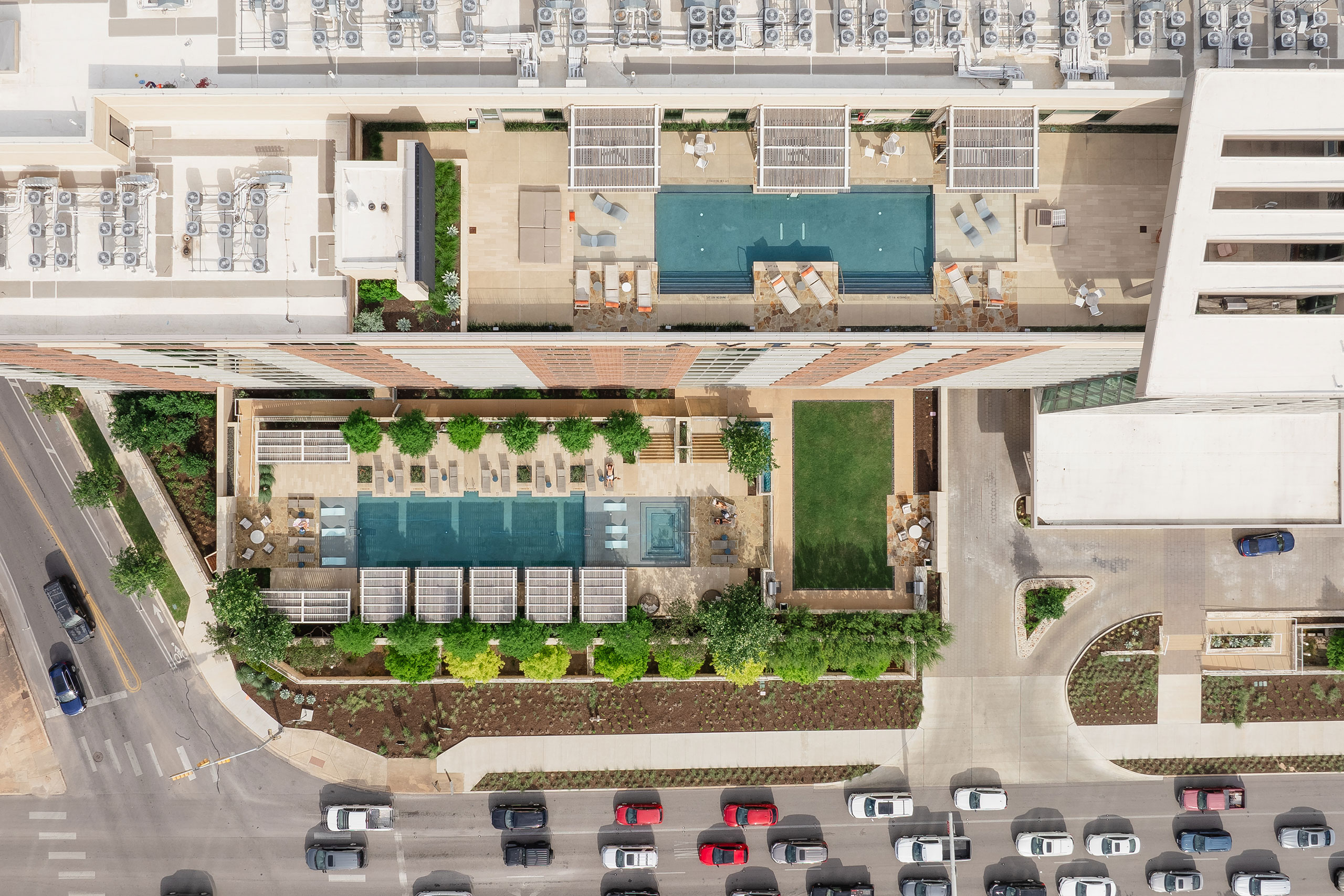 Avenir is one of the tallest buildings in this part of Austin and the building’s height makes highway adjacence an amenity with resident views guaranteed by the capitol view corridor, and the design works with zoning requirements that make the building a gateway to the city. With most parking below grade, a grand motor court anchors the base of the tower, and liner units screen the garage along Branch Street and respond to the adjacent lower scale residential neighborhood. The premium amenities program includes two pools, a halfcourt gym and rooftop club space with a jumbotron in addition to the expected programming for luxury development.