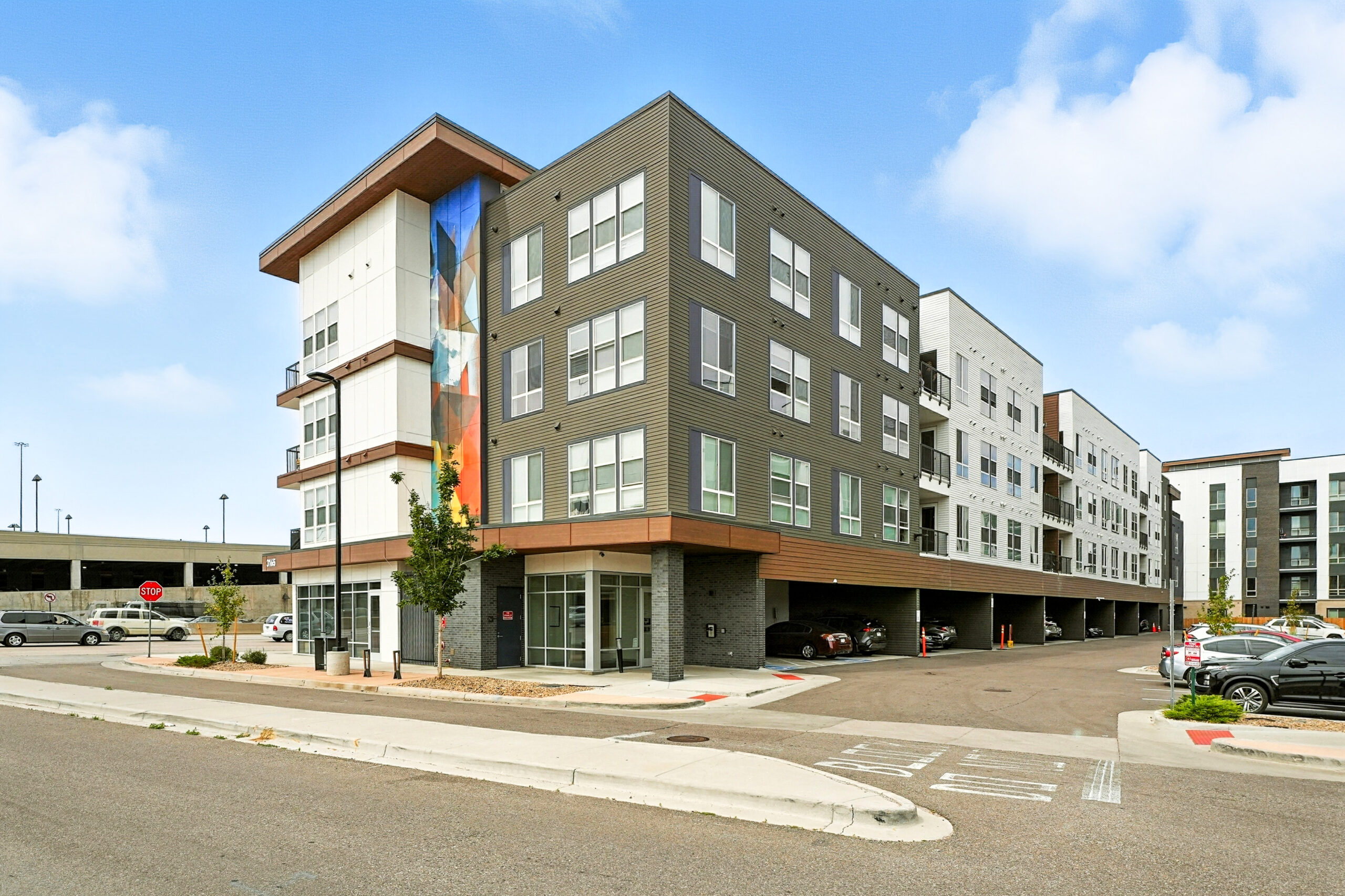 KTGY’s designers maximized occupancy on this site with an efficient bar-shaped building mass. The overall design and aesthetic are urban contemporary, with wood accents, contrasting colors and sparks of personality. Amenity spaces are highlighted at the two ends of the building, with ground floor glazing and murals aligned to the neighborhood’s aesthetic. A spacious rooftop amenity deck offers views of the Front Range, completing the image of an integrated, active and creative community catered to a wide range of Coloradans.