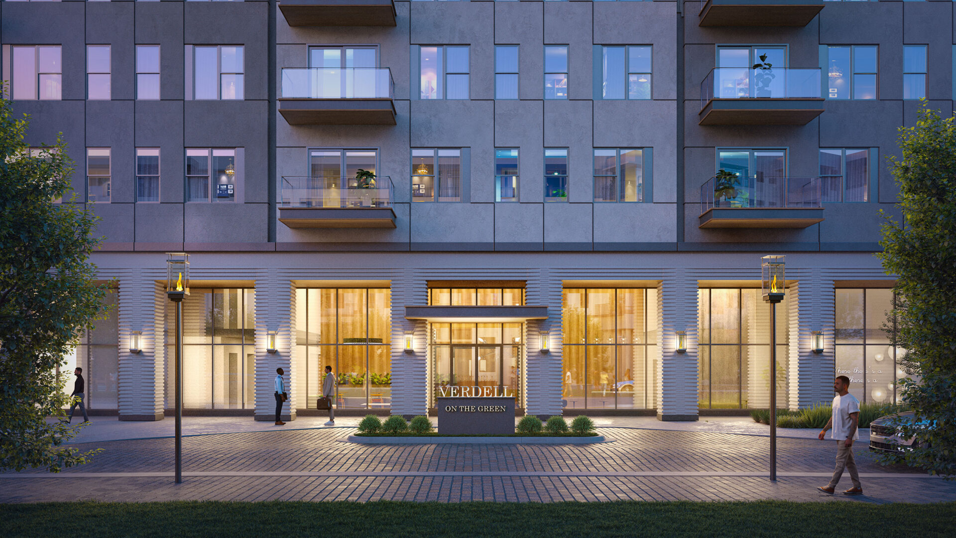 Verdell on the Green is a medium density building that provides active frontage to the village green and massing that breaks the scale of the building down for the pedestrian. It has three basic parts: an activated base featuring the lobby and retail, the body, and then a set back seventh floor. Equal volumes of the building are broken into micro communities by subtle color and texture changes that delineate the building horizontally. The designers create a statement corner using a wood brow that extends around the corner volume. The ground floor design includes a textured masonry facade with corbelling on the corner and gas lights to dramatize these details. Between the facade treatment and massing, the design of Verdell characterizes it with small-town charm, enhances it with modern amenities and creates a balance between the site’s heritage and this contemporary transformation.