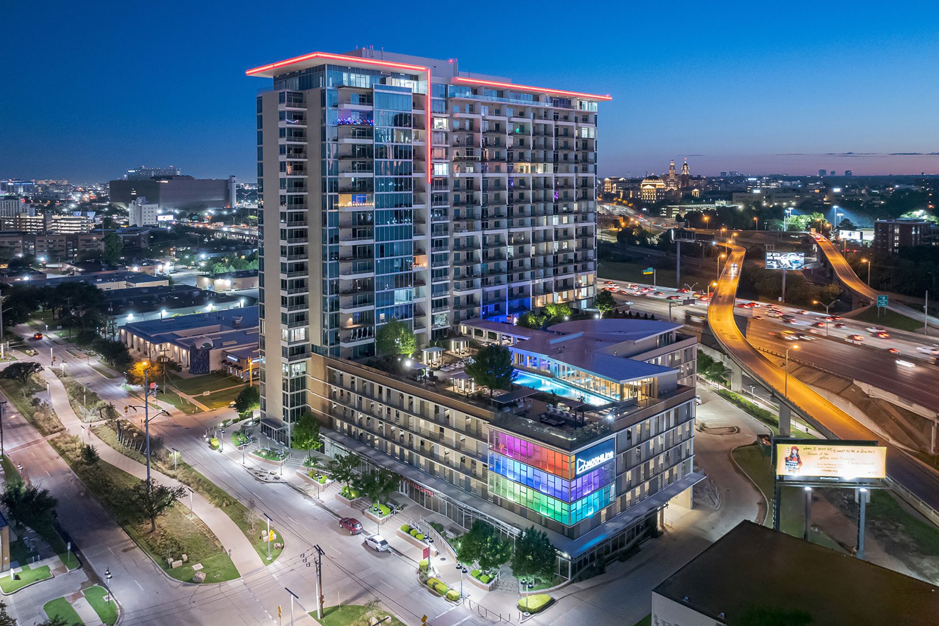 I-35E, on one side of the site, presented an initial problem that the designers solved with the choice to give the building a triangular shape on its square site. This shape acts as a prow to cut the effect of traffic, as does the decision to house residences only on floors seven and above. The residential tower orients along with the quieter side of the site and corners are highlighted with large expanses of glass that emphasize views of the Dallas skyline. The facade is broken up with different vertical elements, balconies, metal fins, stucco and glass, with significant design moves highlighted by the facade lighting. Luxury amenities build community connection, with an oversized pool deck and outbuildings. These outbuildings house a demonstration kitchen and exercise space in a breezy indoor/outdoor configuration with landscaping and a covered walkway connecting to the tower.