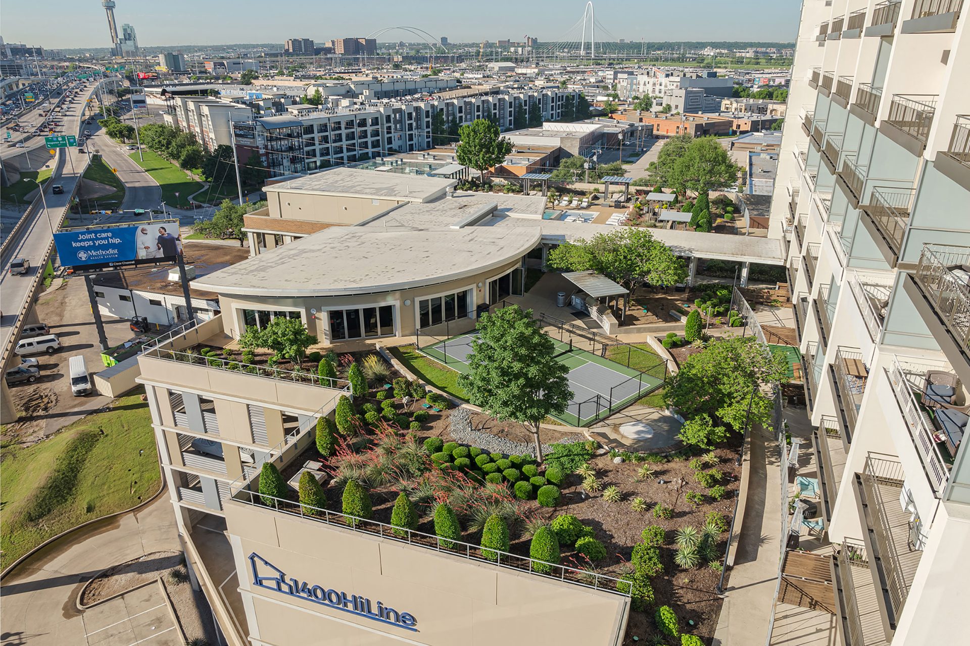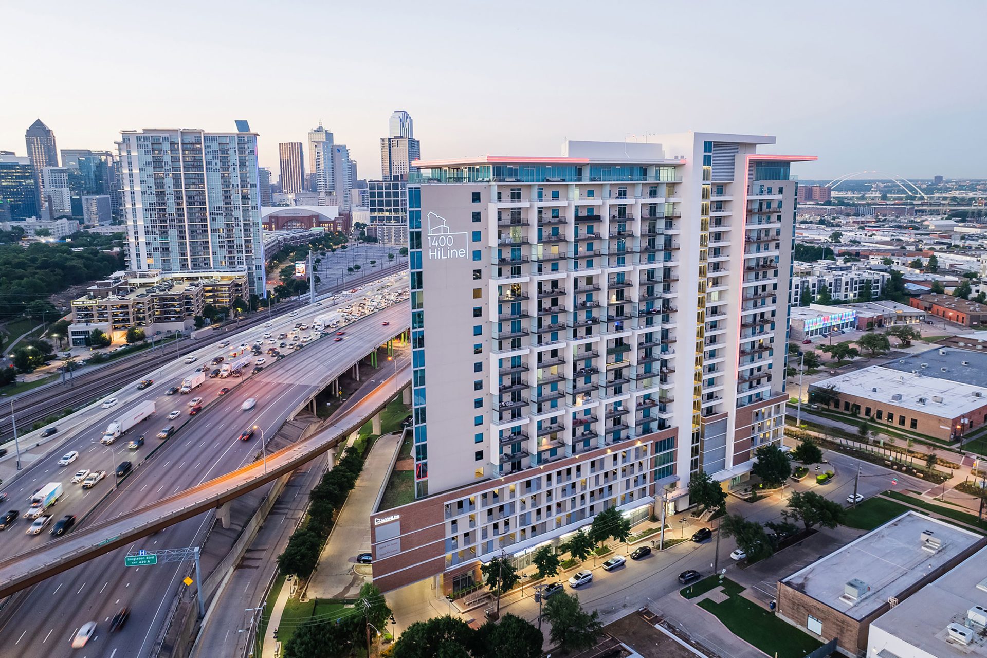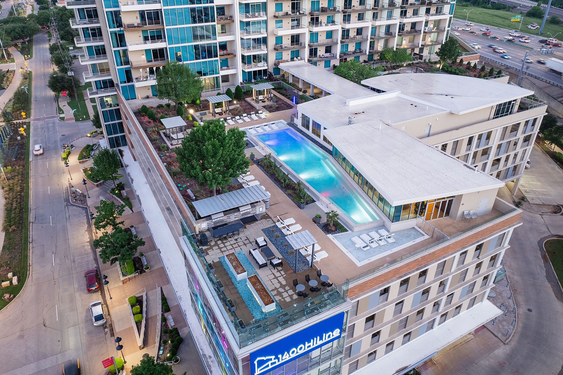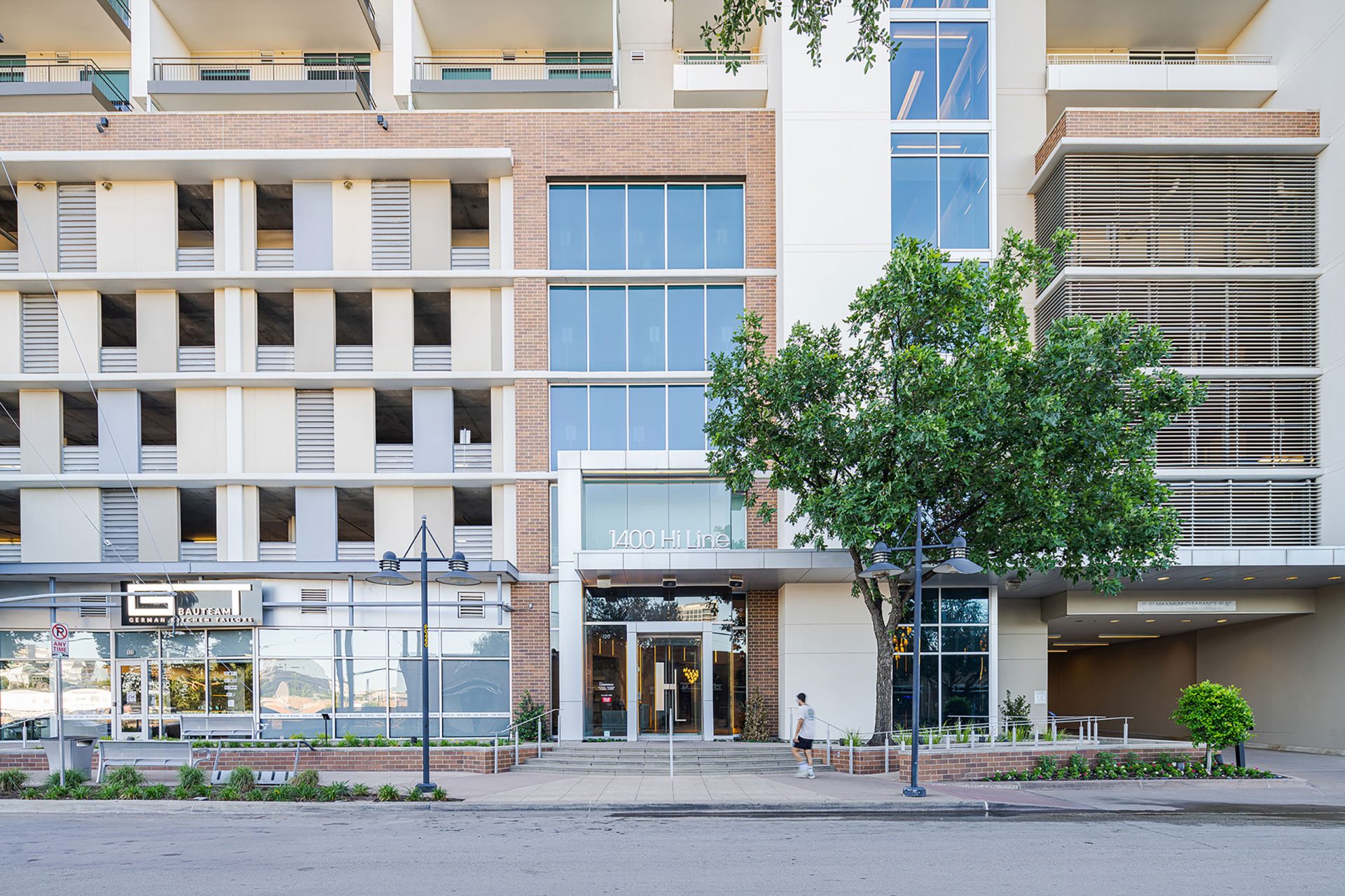 1400 Hi-Line is a luxury Dallas, Texas high rise designed with a neighborhood feel in mind within an urban center. Located down the street from Victory Park, this area is popular with high-end showrooms and design offices. A transparent ground floor meets this strollable neighborhood with an additional block of retail and cafe space, anchoring it in the street scene. Parking integrated in the building’s base keeps cars off the street, and a wide range of luxury units and premium amenity spaces make the building an oasis for Dallas’s professional set, providing an urban home with a connection to the ever-desirable Katy Trail.