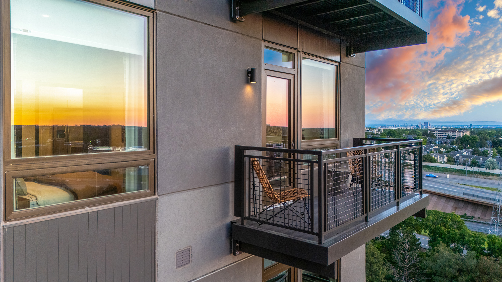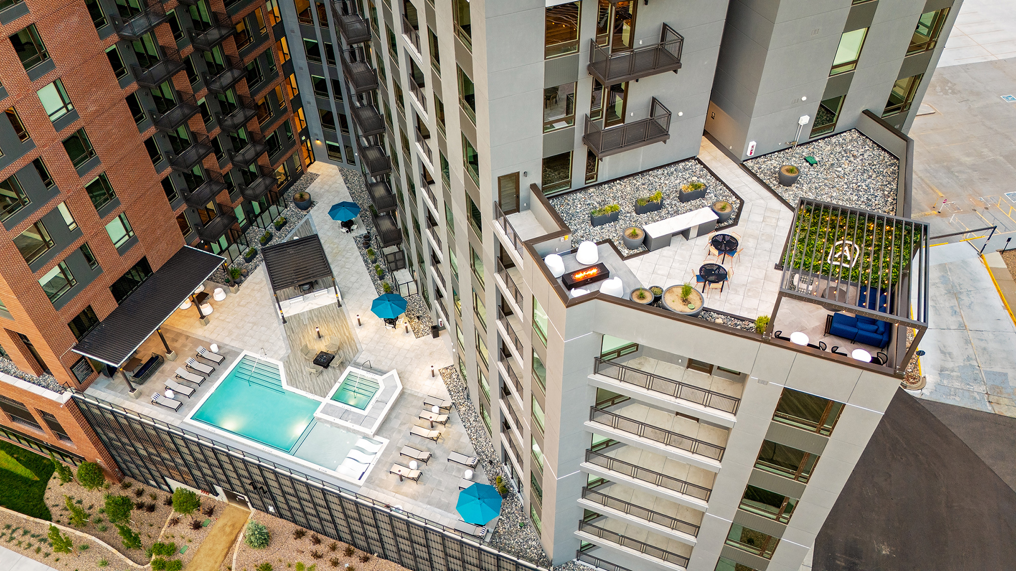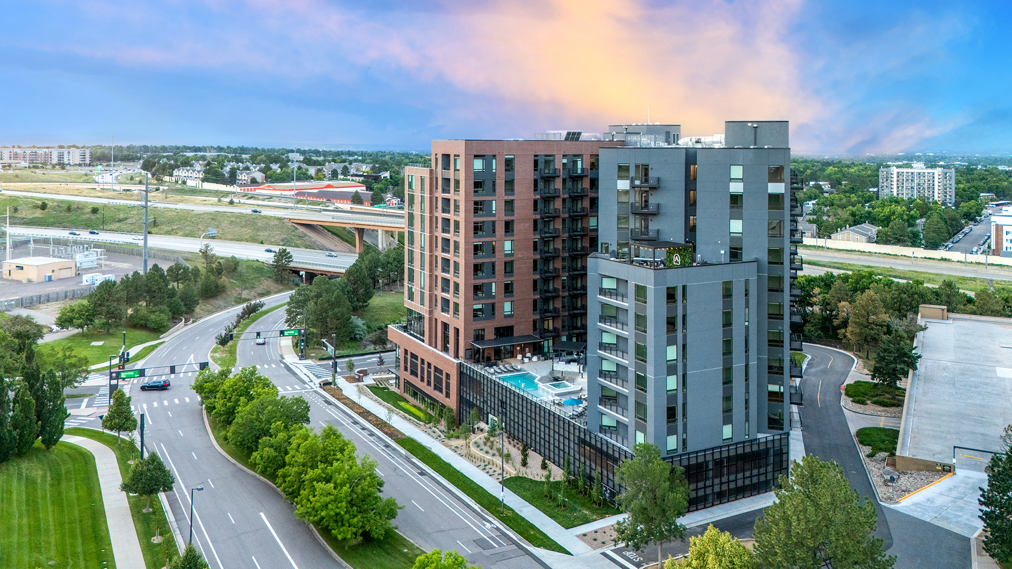 Araceli is a modern apartment community leveraging light-gauge steel construction to deliver beautifully designed residences within a highly walkable neighborhood with direct access to a suburban office center in Denver, CO. This new development provides rental opportunities for the young professional looking to live in a suburban area with urban style and amenities. The building is designed with a simple yet elegant façade fronting a highly visible intersection of two major highways. The triangular-shaped site, with a nearly 17-foot change in grade, influenced the shape of the building, while its location within a complex dominated by office towers influenced the aesthetic. Architects circumvented a zoning code that dictated a 12-story height limitation by using the sloping site to create a basement level, resulting in an approved building appears as 13-stories from the west and 12-stories from the east. Navigating the shape, architects designed a building that unfolds as two wings. The west wing displays a strong grid-like façade created by red brick and contrasting gray metal. The grid creates a sophisticated repetition and breaks the massing into a more residential scale. The east wing is enveloped in the same gray metal found on the west wing alternating with various sized windows and balconies in orderly stacks. A high level of detailing and glazing sets apart the southwest corner where amenity uses are located. This corner provides idyllic views of the mountains and downtown Denver from the clubhouse, fitness center and penthouse level residences. Nestled into the center of the v-shaped design created by the two wings, architects created a retreat with a pool deck that provides grills, fireplaces as well as covered and exposed seating all surrounded by planters and greenery. Additional residential amenity spaces include a ninth-floor outdoor space in the east wing, and a 12th floor indoor amenity space with a small kitchen and gathering area adjacent to a small outdoor deck, in the west wing of the building. This luxurious space is envisioned to be rented out by residents for private parties. All of the one to three bedroom+den units are designed for the young entrepreneur, remote worker, or distance learner and provide a built-in desk or office space. Araceli is ideally located with easy access to two major highways, a dedicated bike trail, adjacency to the bus route and 15-minute walk to the light rail station.