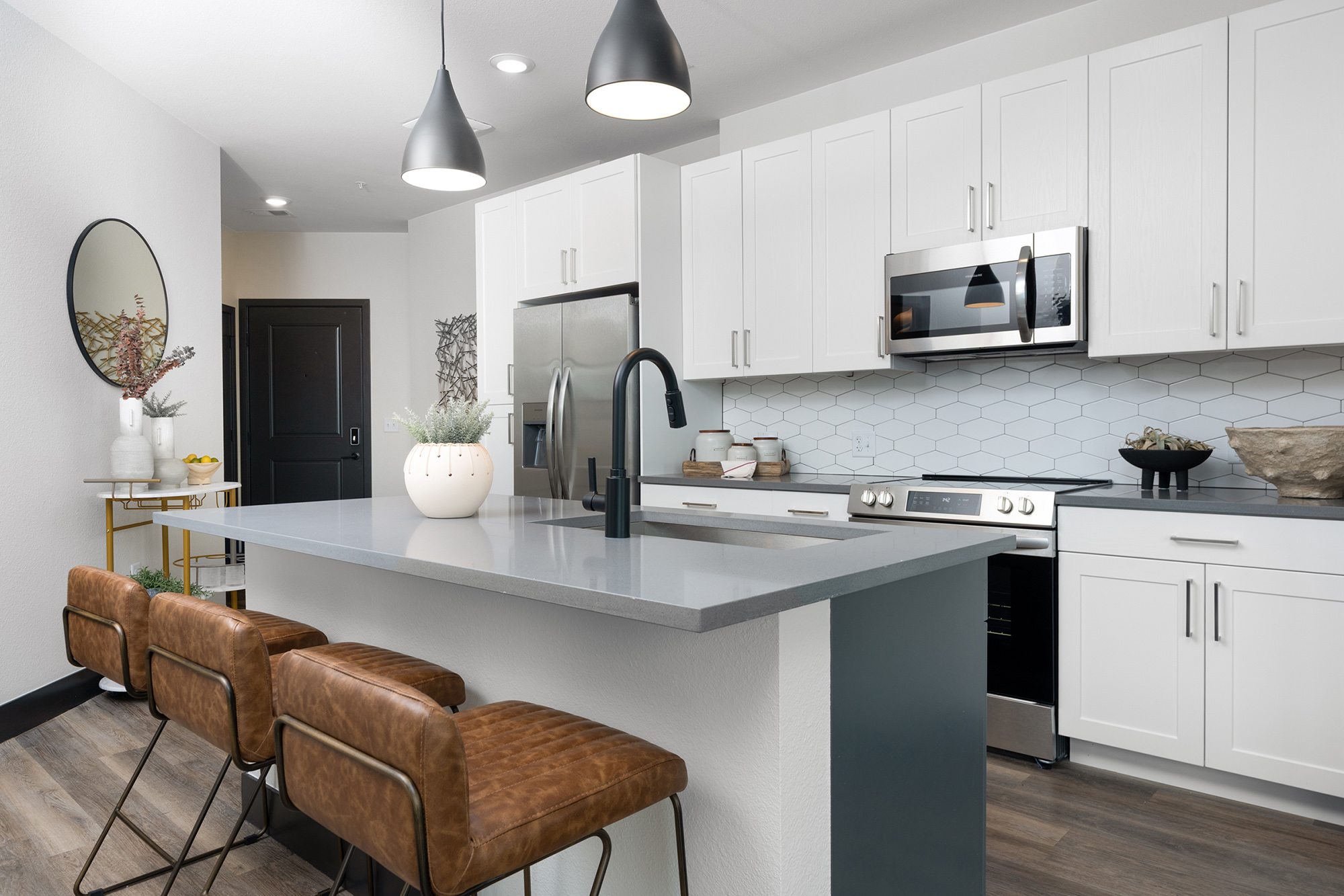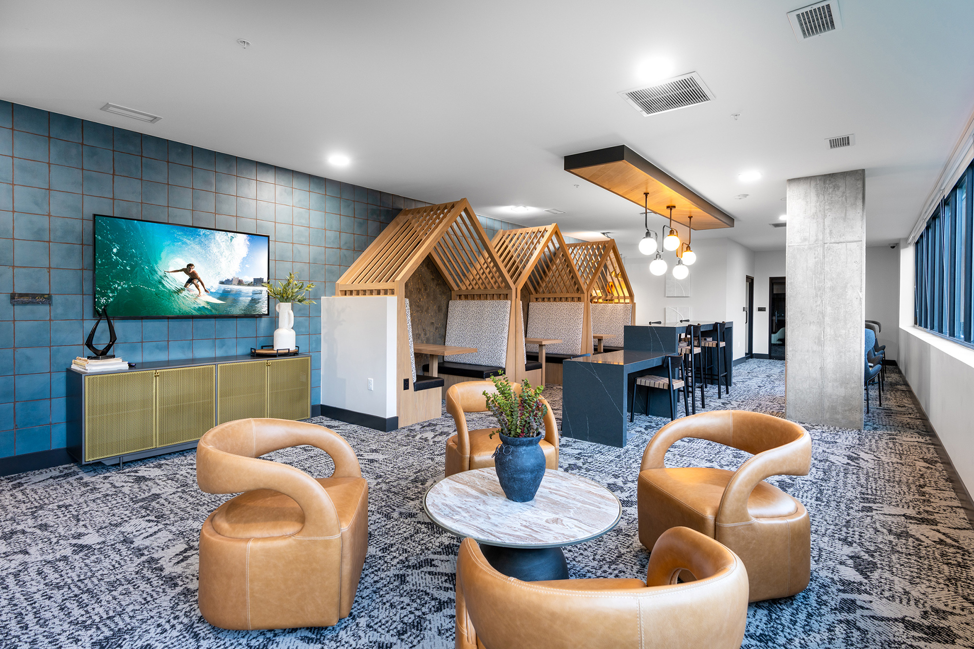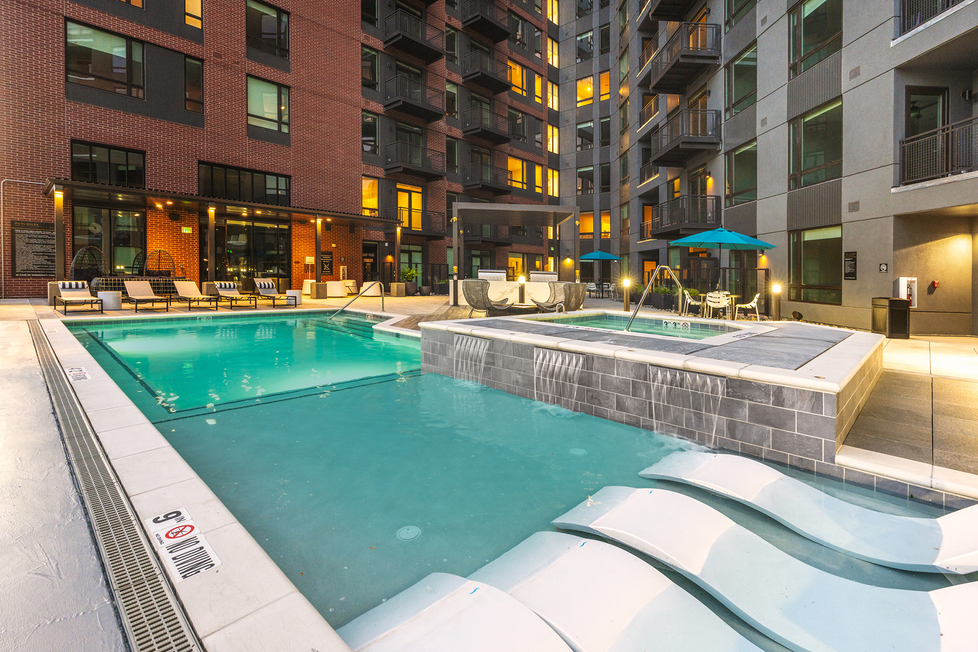 Araceli is a modern apartment community leveraging light-gauge steel construction to deliver beautifully designed residences within a highly walkable neighborhood with direct access to a suburban office center in Denver, CO. This new development provides rental opportunities for the young professional looking to live in a suburban area with urban style and amenities. The building is designed with a simple yet elegant façade fronting a highly visible intersection of two major highways. The triangular-shaped site, with a nearly 17-foot change in grade, influenced the shape of the building, while its location within a complex dominated by office towers influenced the aesthetic. Architects circumvented a zoning code that dictated a 12-story height limitation by using the sloping site to create a basement level, resulting in an approved building appears as 13-stories from the west and 12-stories from the east. Navigating the shape, architects designed a building that unfolds as two wings. The west wing displays a strong grid-like façade created by red brick and contrasting gray metal. The grid creates a sophisticated repetition and breaks the massing into a more residential scale. The east wing is enveloped in the same gray metal found on the west wing alternating with various sized windows and balconies in orderly stacks. A high level of detailing and glazing sets apart the southwest corner where amenity uses are located. This corner provides idyllic views of the mountains and downtown Denver from the clubhouse, fitness center and penthouse level residences. Nestled into the center of the v-shaped design created by the two wings, architects created a retreat with a pool deck that provides grills, fireplaces as well as covered and exposed seating all surrounded by planters and greenery. Additional residential amenity spaces include a ninth-floor outdoor space in the east wing, and a 12th floor indoor amenity space with a small kitchen and gathering area adjacent to a small outdoor deck, in the west wing of the building. This luxurious space is envisioned to be rented out by residents for private parties. All of the one to three bedroom+den units are designed for the young entrepreneur, remote worker, or distance learner and provide a built-in desk or office space. Araceli is ideally located with easy access to two major highways, a dedicated bike trail, adjacency to the bus route and 15-minute walk to the light rail station.