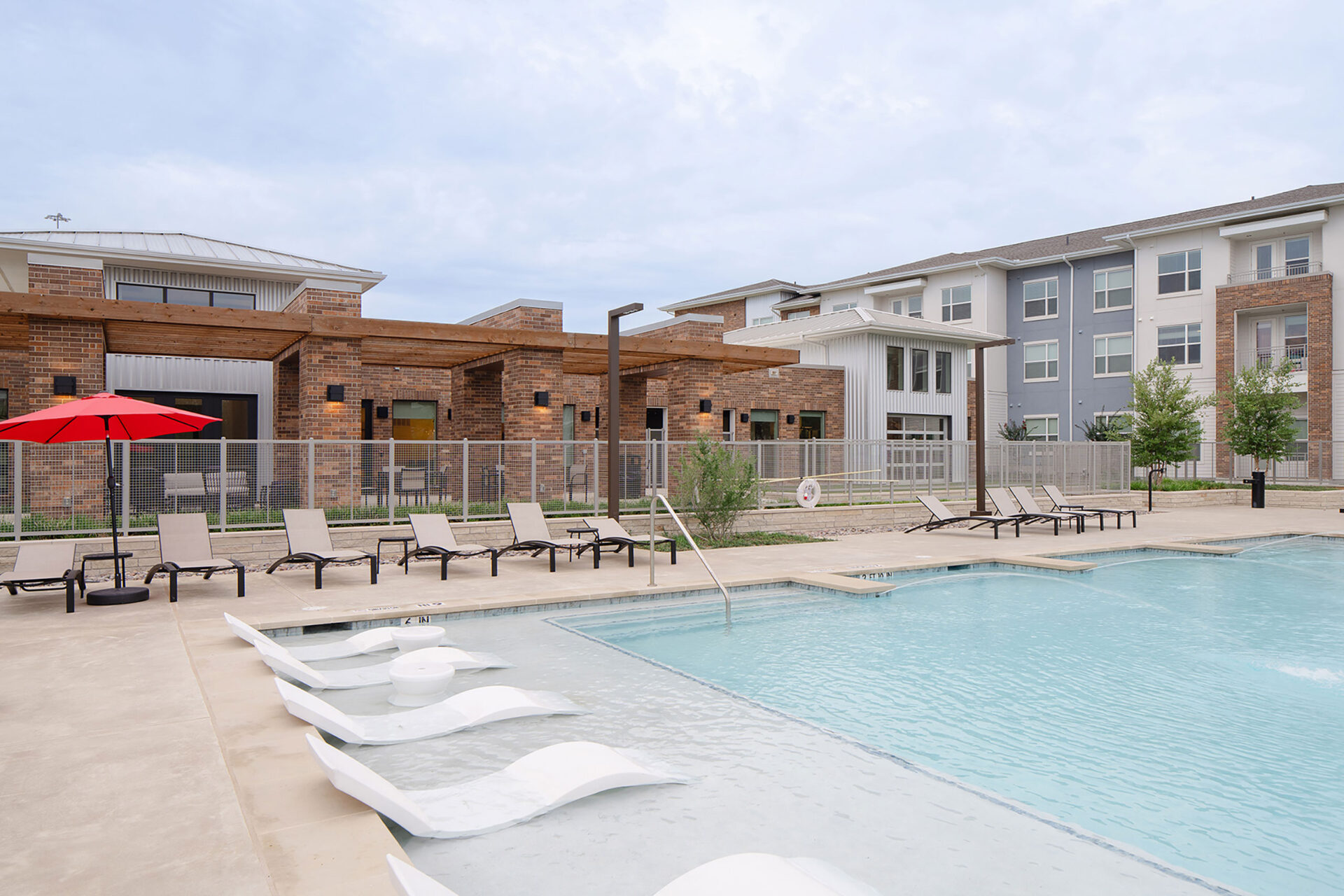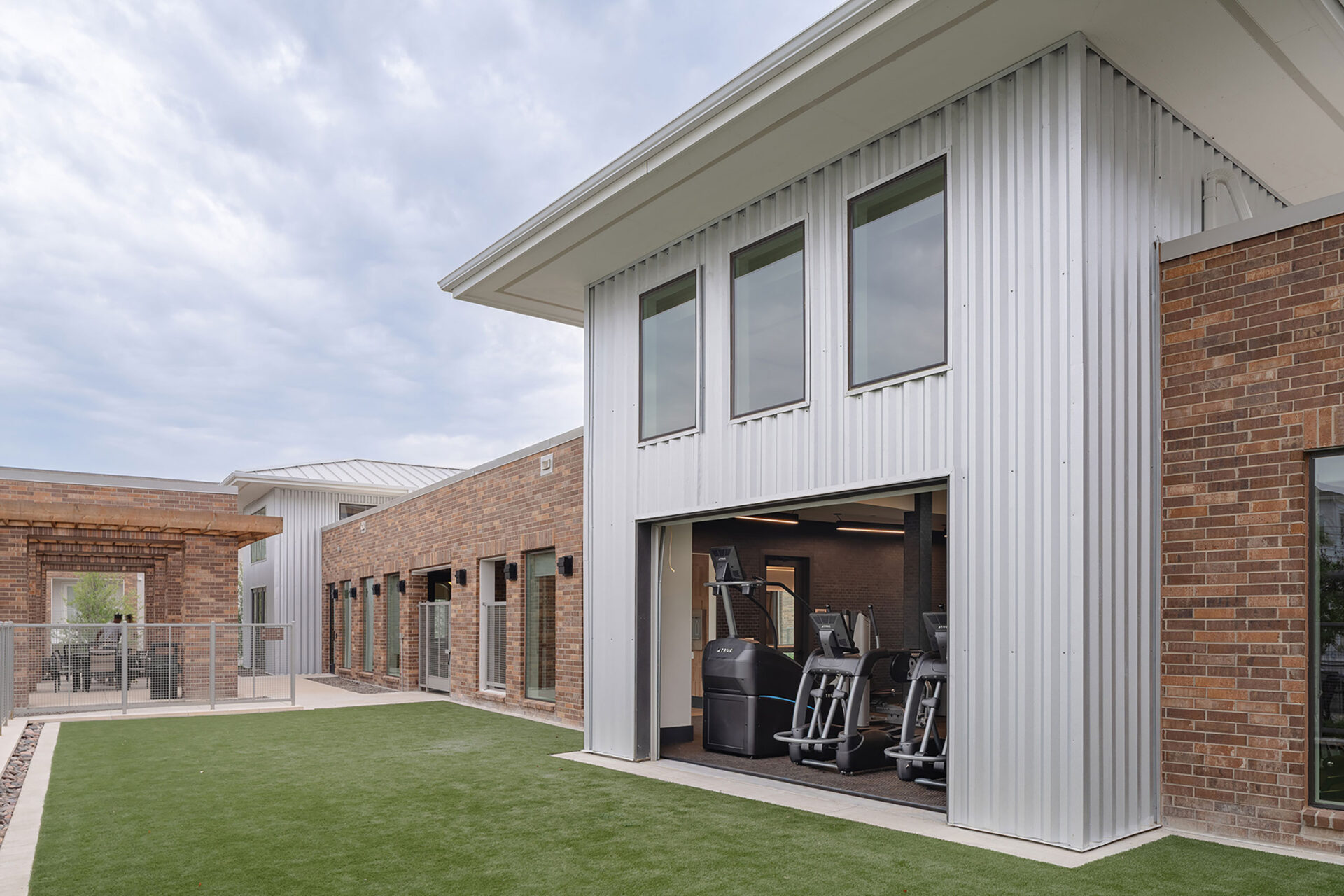Our designers utilize brick, stone, corrugated metal and heavy timber to invoke Texas vernacular and create a comfortable but exciting look for the complex. The buildings and amenities orient around the creek and wooded areas, which also serve as a natural solution for drainage. A pedestrian bridge crosses the central-running creek and connects the site’s two halves. Buildings and units are oriented to capitalize on the views. Open spaces and amenities give the community a sense of identity and three-story buildings give the neighborhood an approachable scale. Trellises and colonnades bring the street fronting buildings into compliance while further enhancing outdoor space.