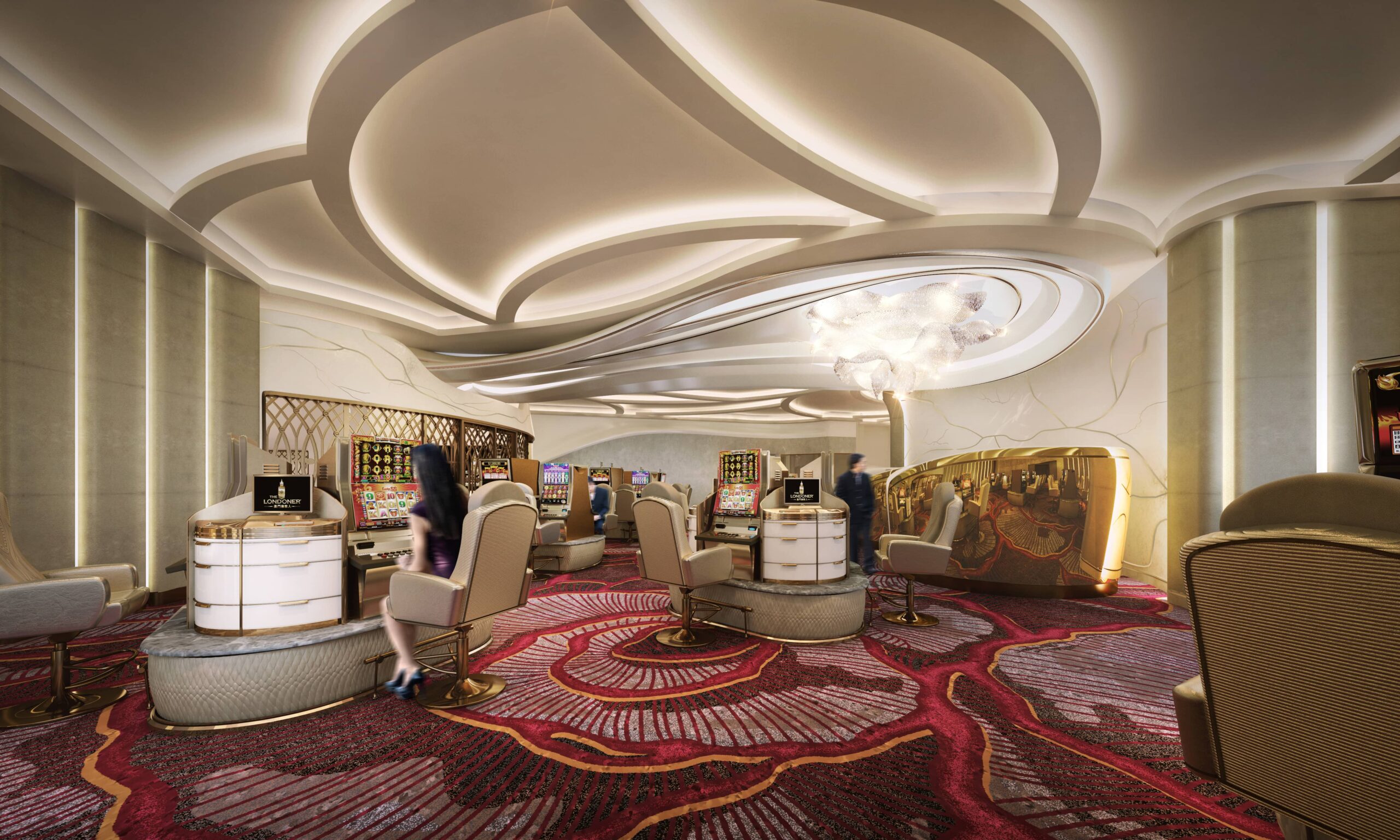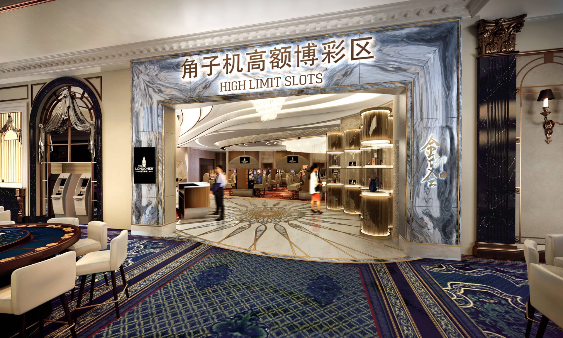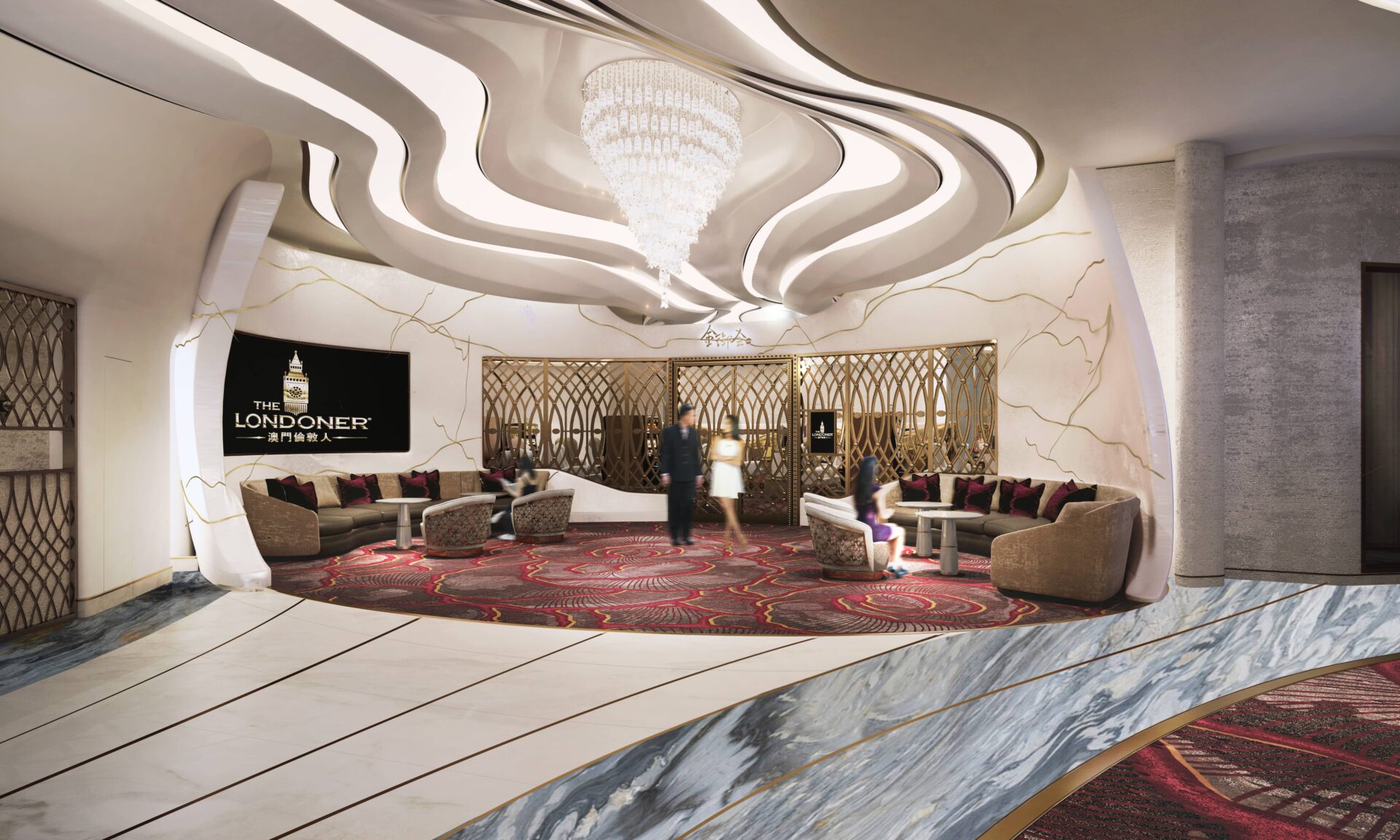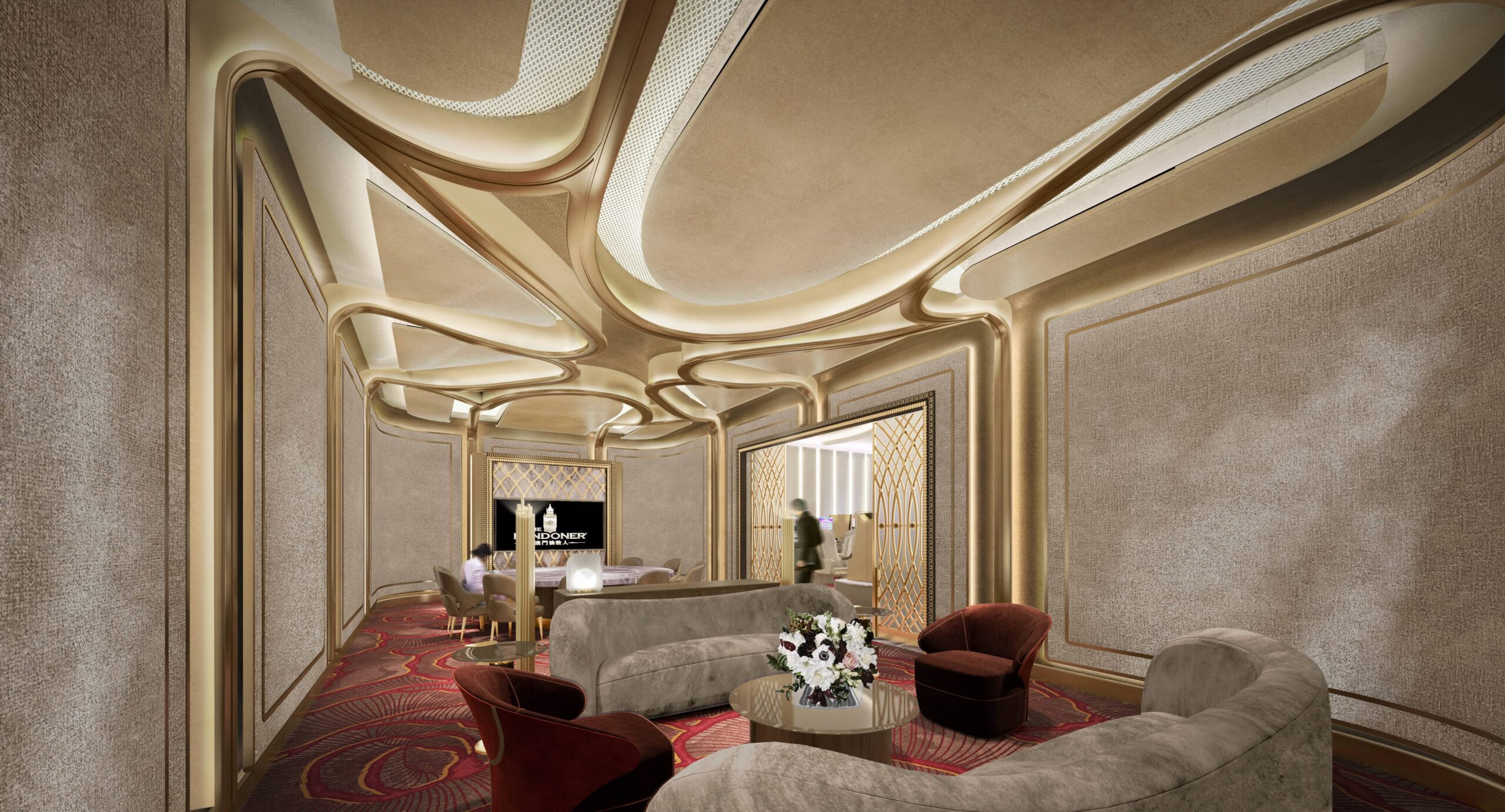 Real marble, fine materials and rich layering characterize an opulent space where each guest is royalty. A blue marble proscenium creates a tantalizing frame for casino patrons and white marble flooring separates the public casino from the exclusive gaming room. The spaces feature curved walls and features in groups of three, Macanese measures that ensure good luck. Marble inlaid with brass, chandeliers and layered details feature throughout. Gaming modules feature leather-upholstered seats, marble podiums and gilt drawers filled with luxury extras. The Apex VIP entrance is barred by brass and glass latticed doors, and its statement entry chandelier is made with layers of tiny rose florets. The Apex lounge stuns with a marble table and gilded ceiling ribs that stretch to the floor with a contiguous backlight.