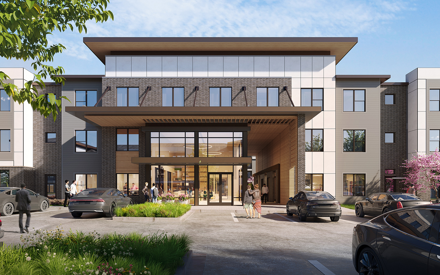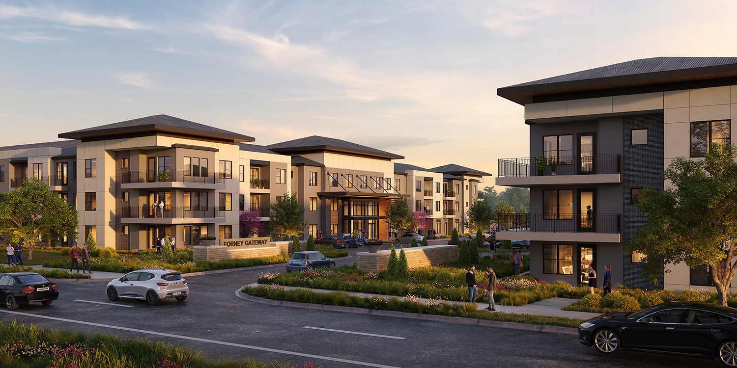 Creating a retreat for residents and sitting adjacent to retail, KTGY’s architects designed Forney Gateway West to appeal to the young professionals seeking resort style living and integrated open space in the growing suburbs of Dallas, Texas. Flanked by two main streets, material and color changes concentrate on the public facing facades while larger moves draw attention to the corners. Warm wood panels accent the entry to the lobby and large expanses of glass create visual connections. The wood paneling continues along an external pathway inviting residents and guests into the open amenity spaces beyond.