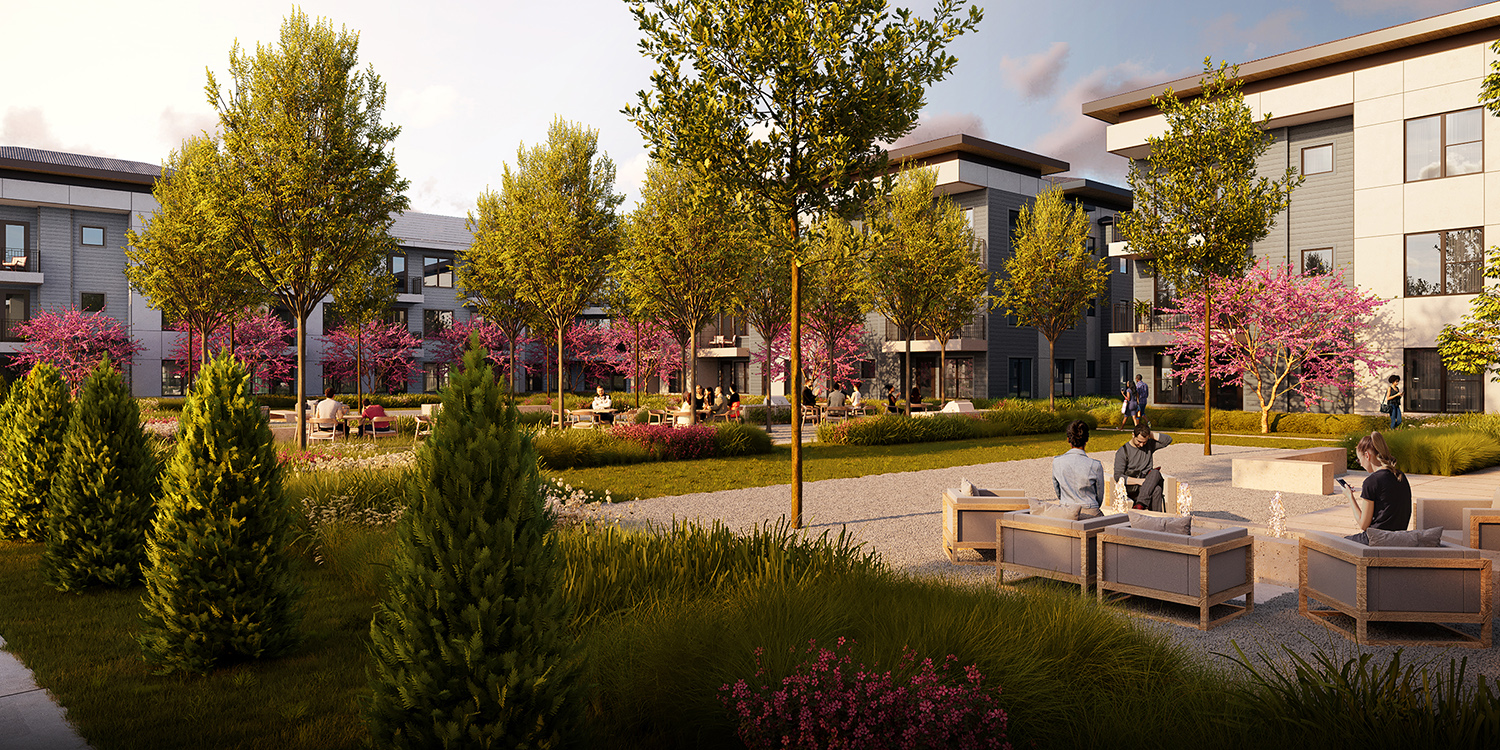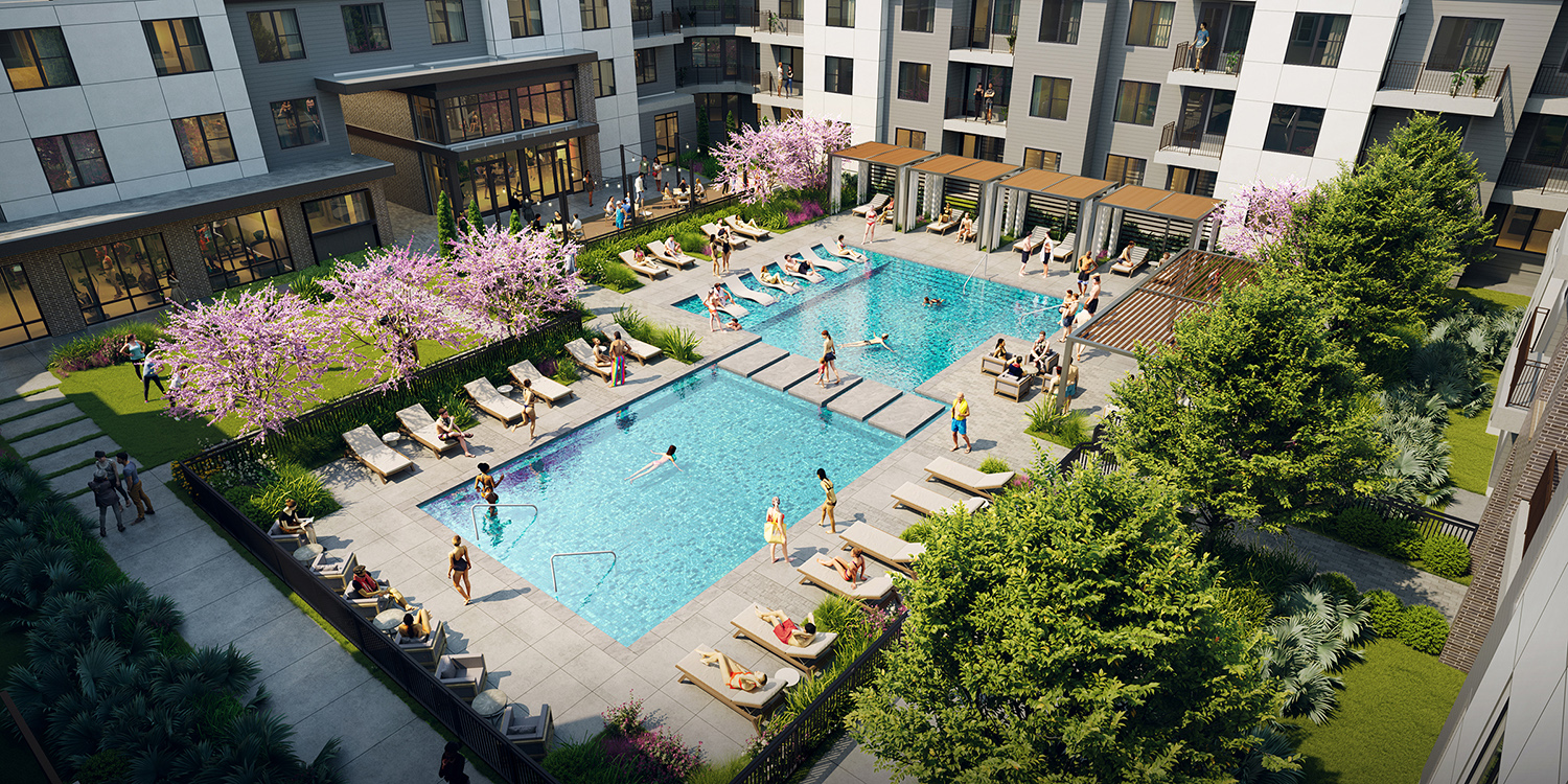 The development is broken down into smaller buildings oriented around pockets in internal green spaces. This allows the buildings to function as privacy screens between the residential retreats and the unlimited development potential beyond. A resort style pool and lounge deck complete with grill stations and a small lawn off the fitness center act as the heart of the community calling residents to gather.