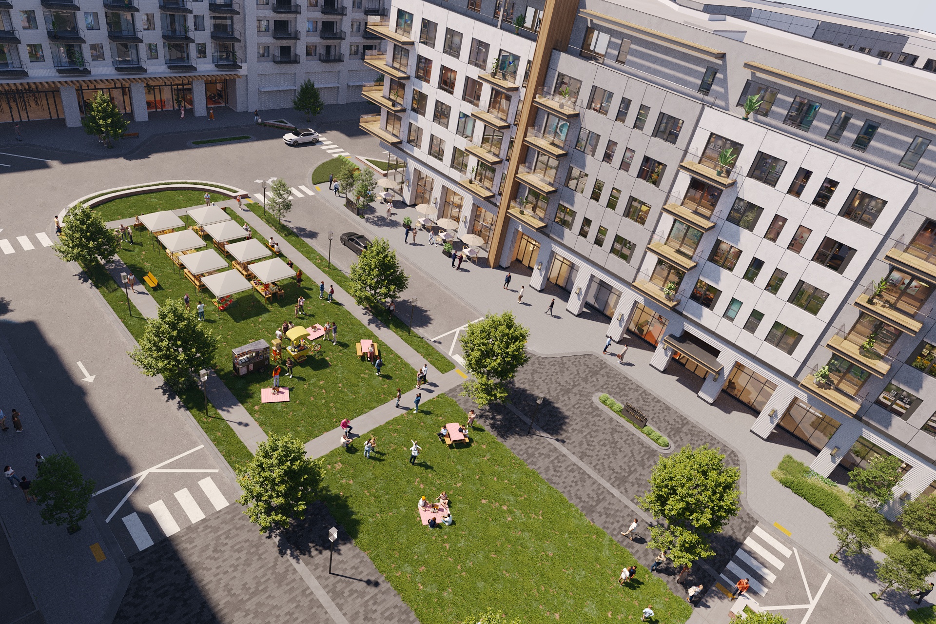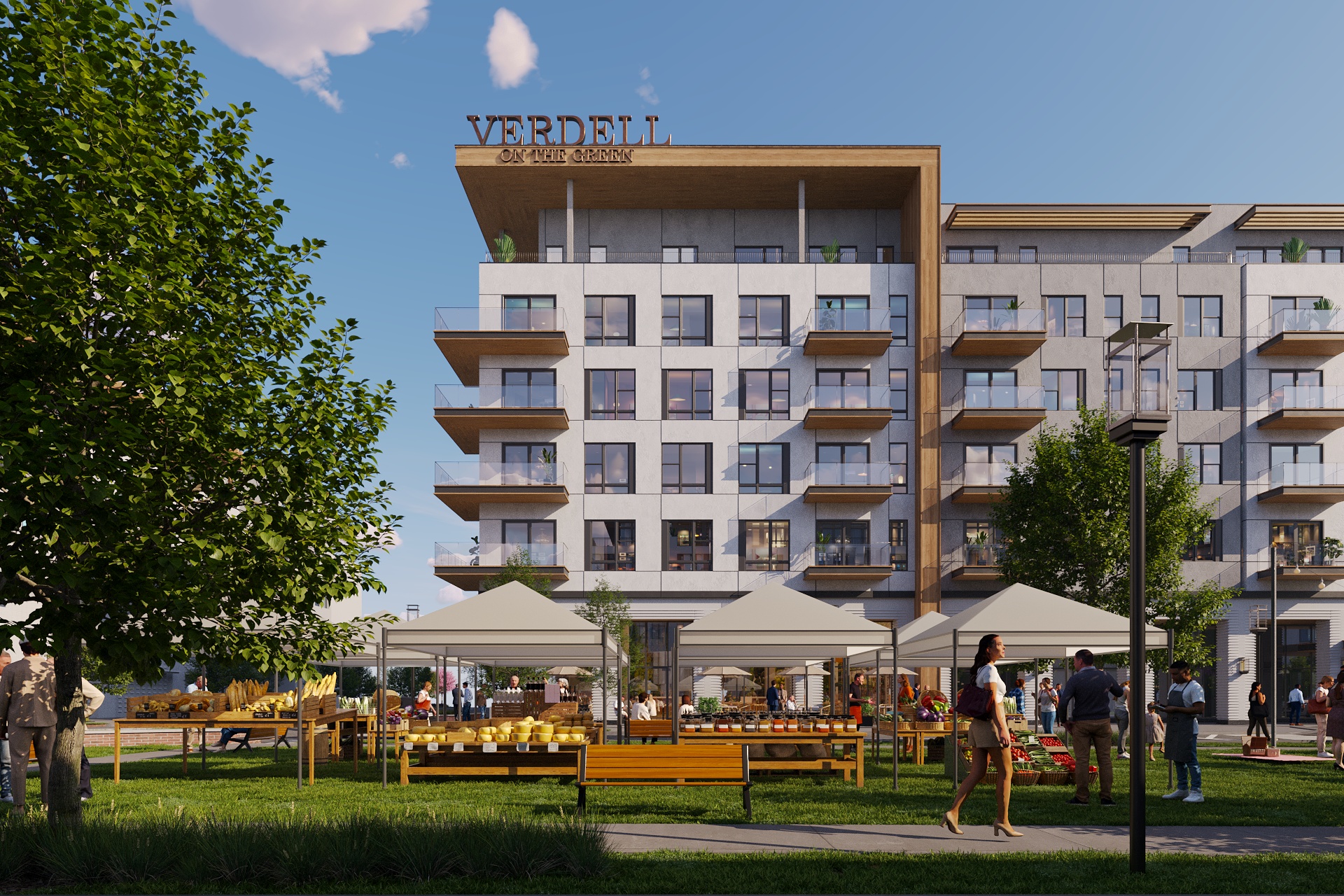 The design centers on the green, with three luxury apartment buildings radiating from this central gathering space. Off-street parking preserves street character and a pedestrian-friendly environment makes residents and visitors feel welcome. KTGY’s brand designers collaborated closely with our architecture team to develop a coherent brand identity that reflects Greendale’s historic designation while positioning the development as a forward-thinking destination. Visual identity captures the essence of small town charm enhanced by modern amenities, creating an authentic connection between the site’s heritage and this contemporary transformation. This integrated approach to urban design and identity development delivers a best-in-class neighborhood that serves as both a community hub and residential haven, ensuring that future generations can continue to enjoy this site.