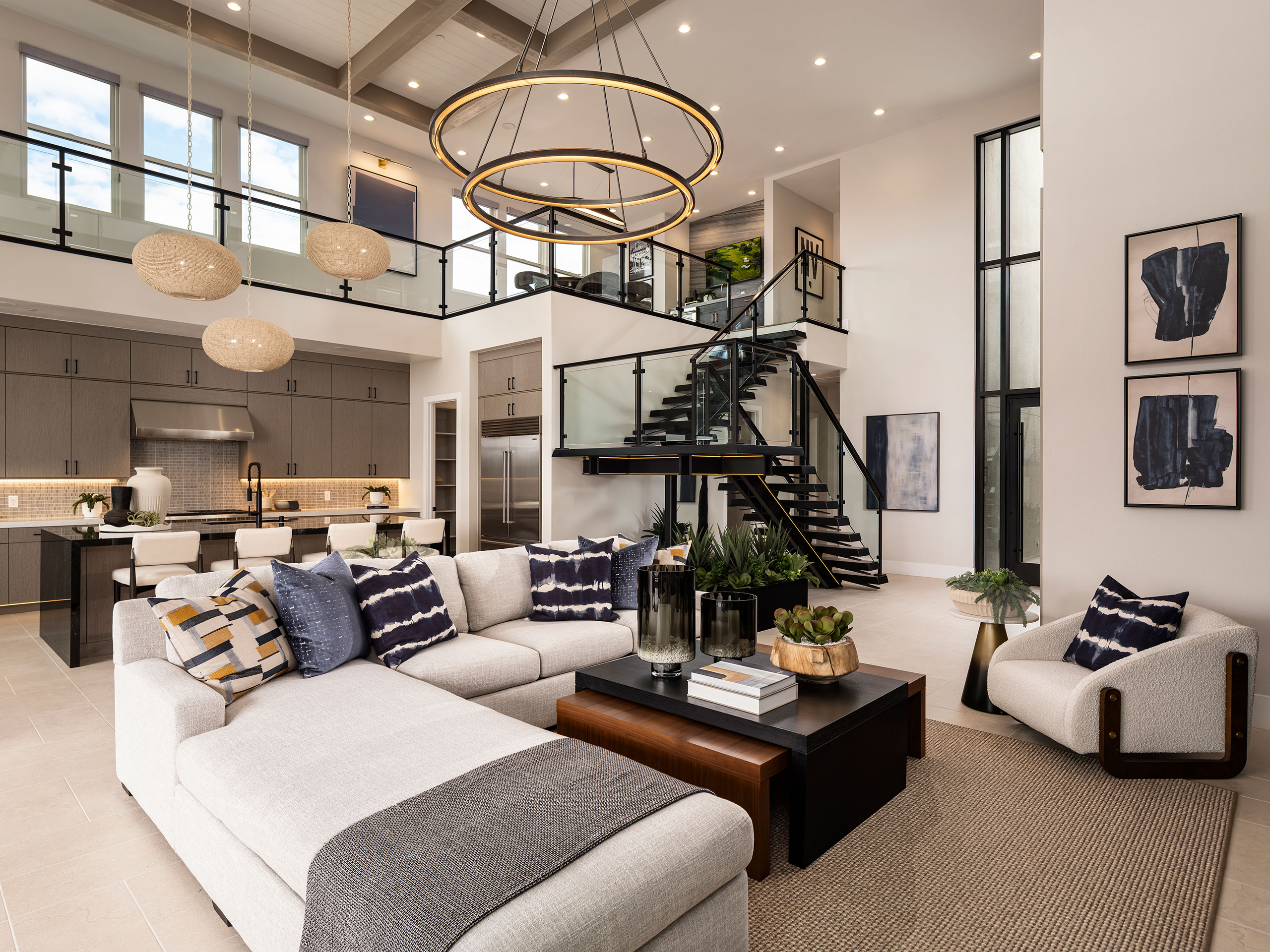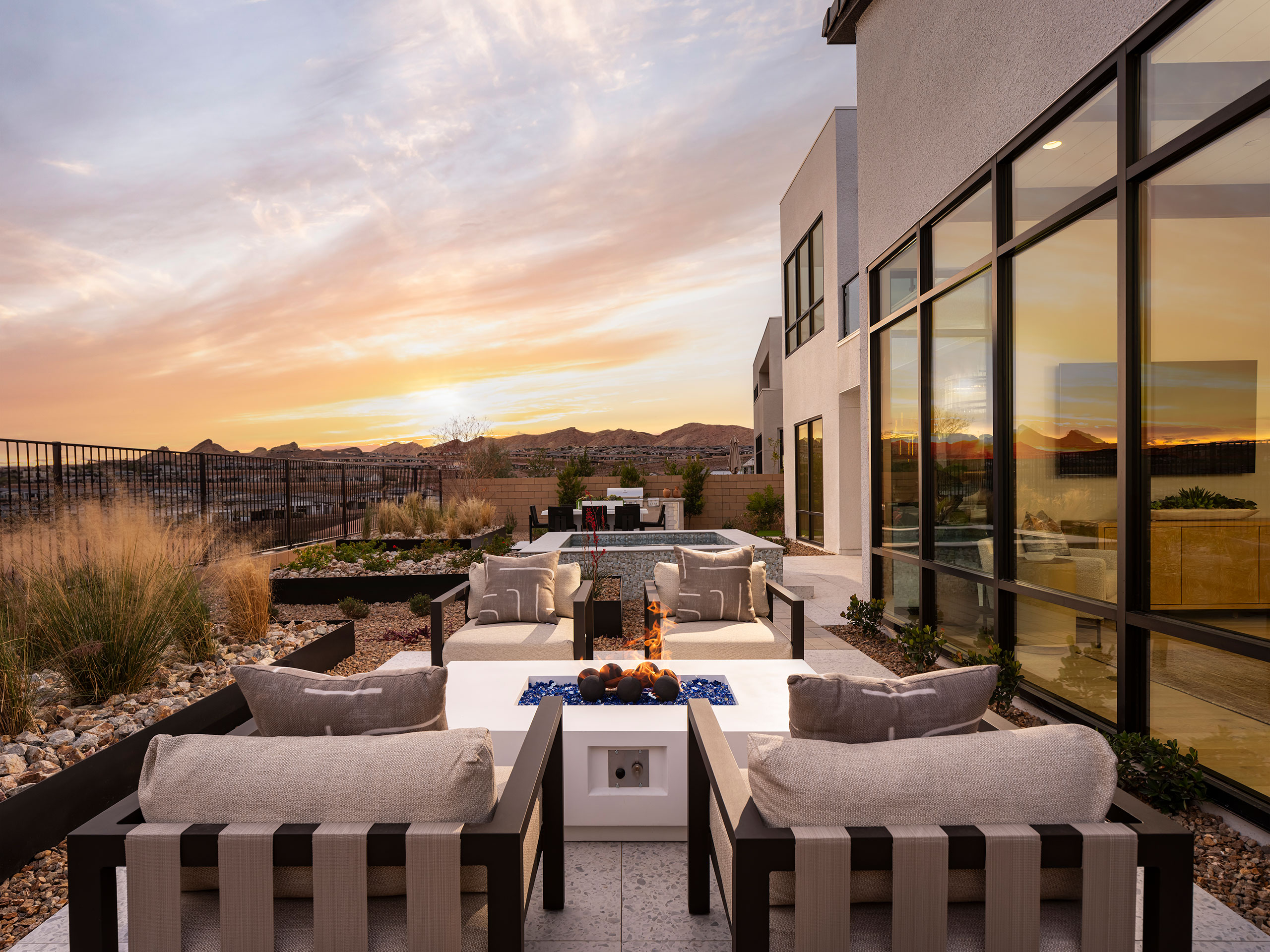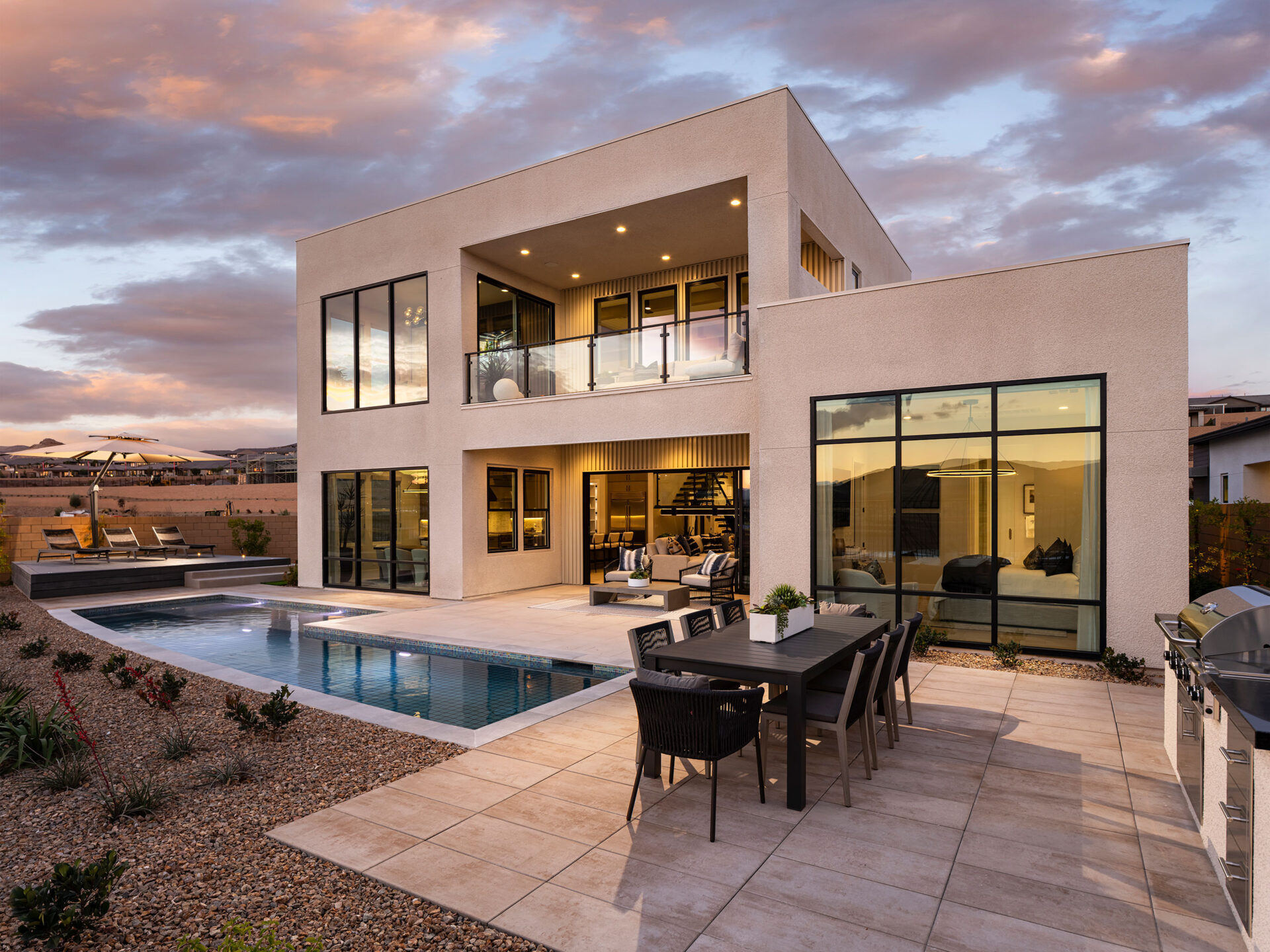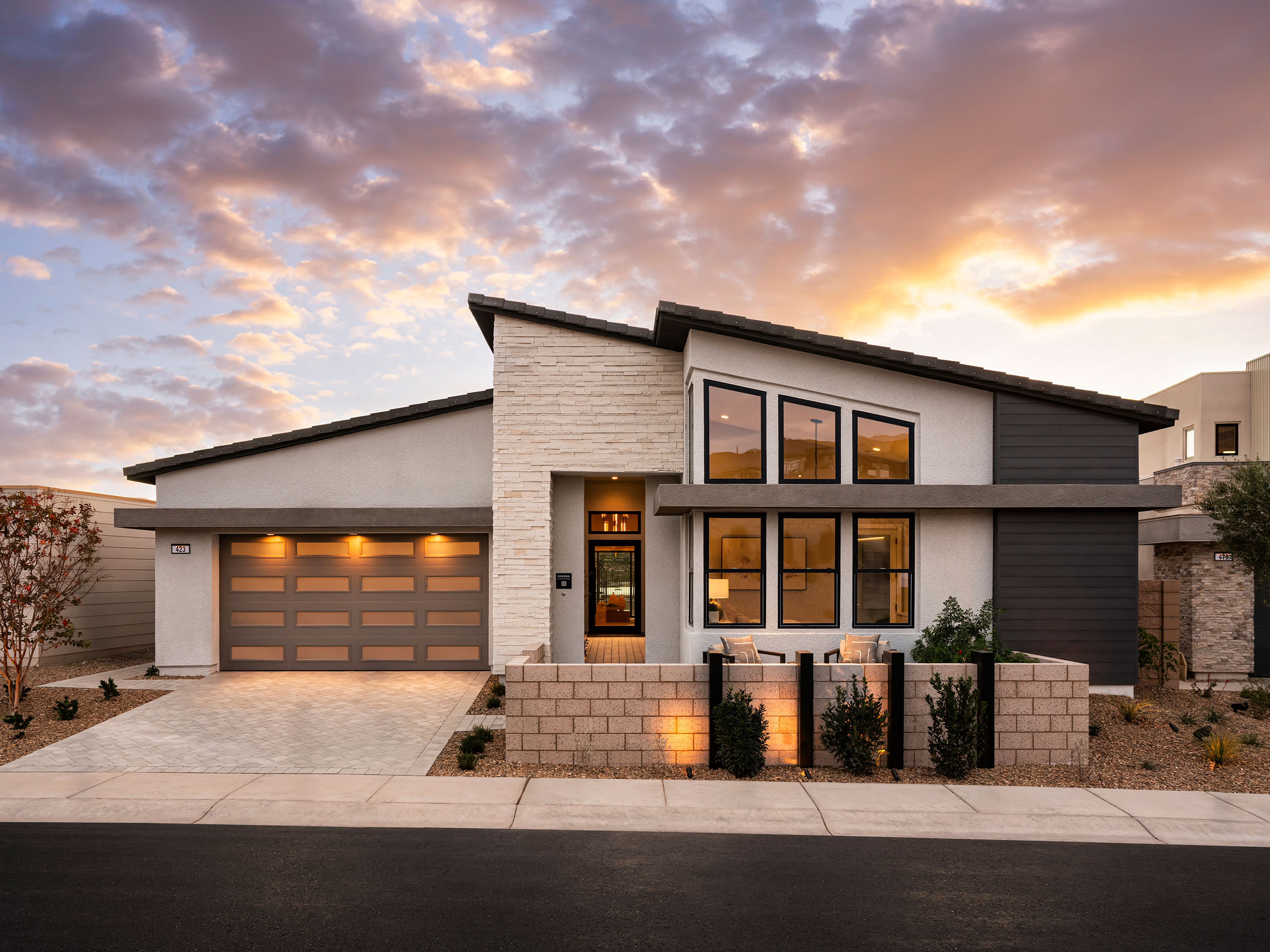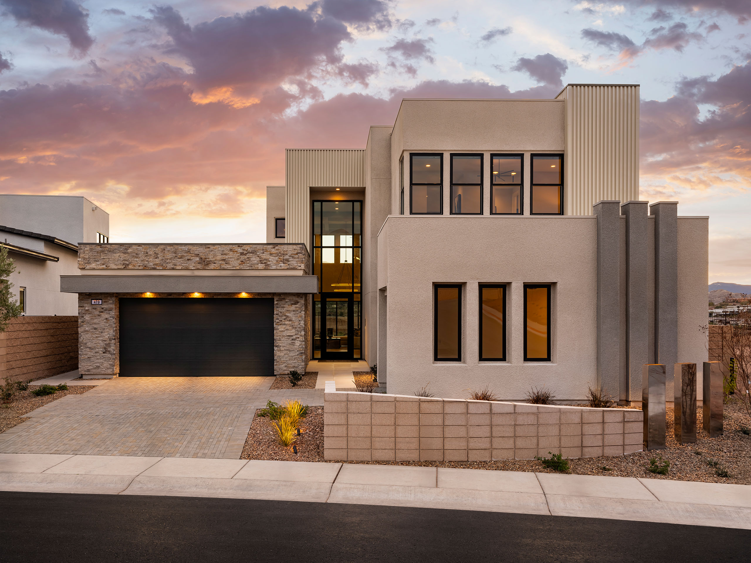 Each design boasts an open concept floorplan, high ceilings and large windows, creating open and light-filled interior spaces perfect for entertaining or relaxing with the family. Incanta Lago is part of a larger, gated community, and much thought has been given to fostering social connections within the home; standard and custom options are designed to accommodate guests and multi-generational living. The three facade styles are expressed in materials appropriate to each aesthetic. Material variations give each home personality, with a palette of ready to use materials combined and recombined in distinctive ways. The cumulative effect of each design move, from the front facades to the floorplans, to the placement of custom features, serves to make home buying and building enjoyable for the new owners, and create an involved but graceful lifestyle on the shore of Lake Las Vegas.