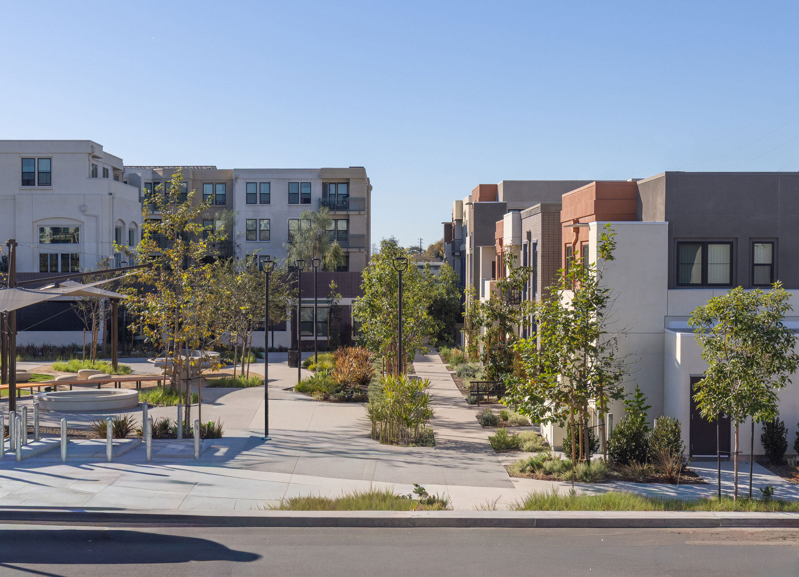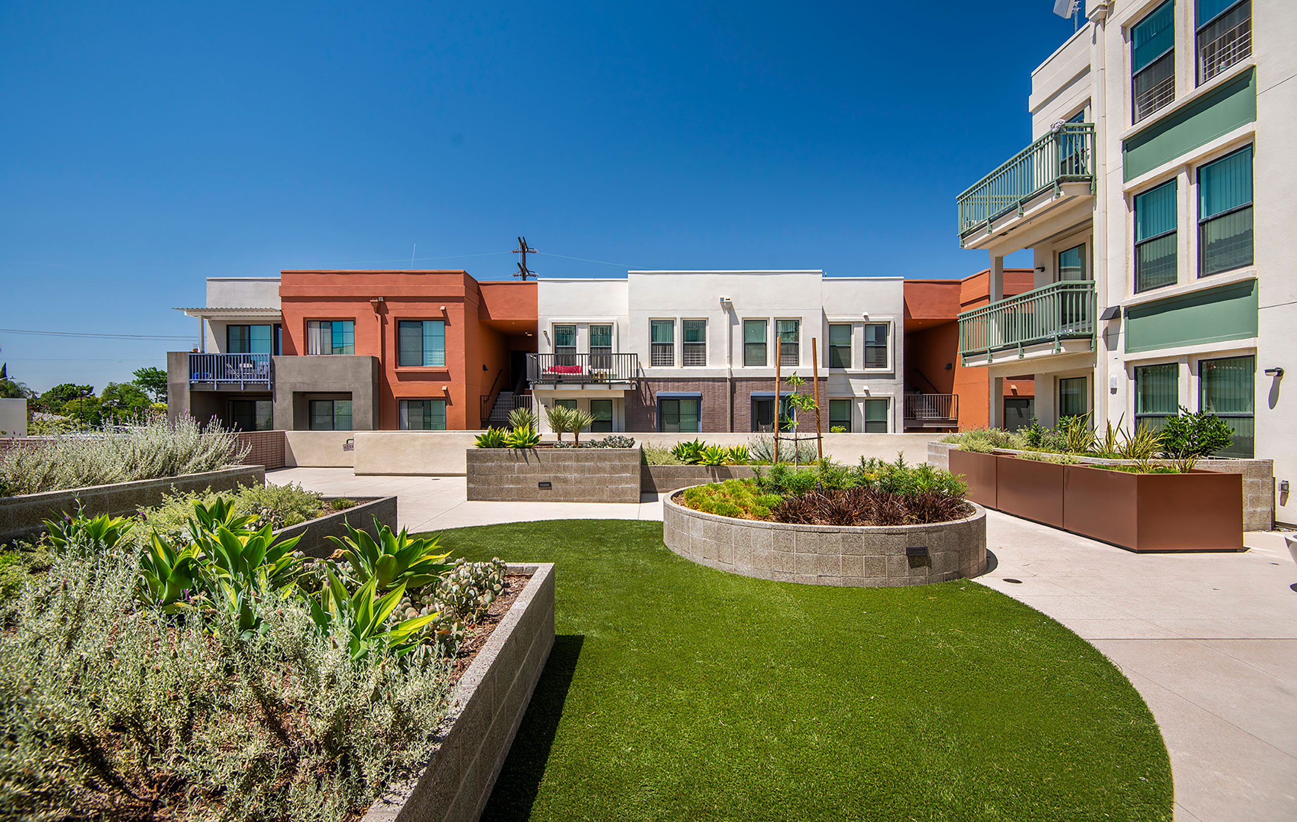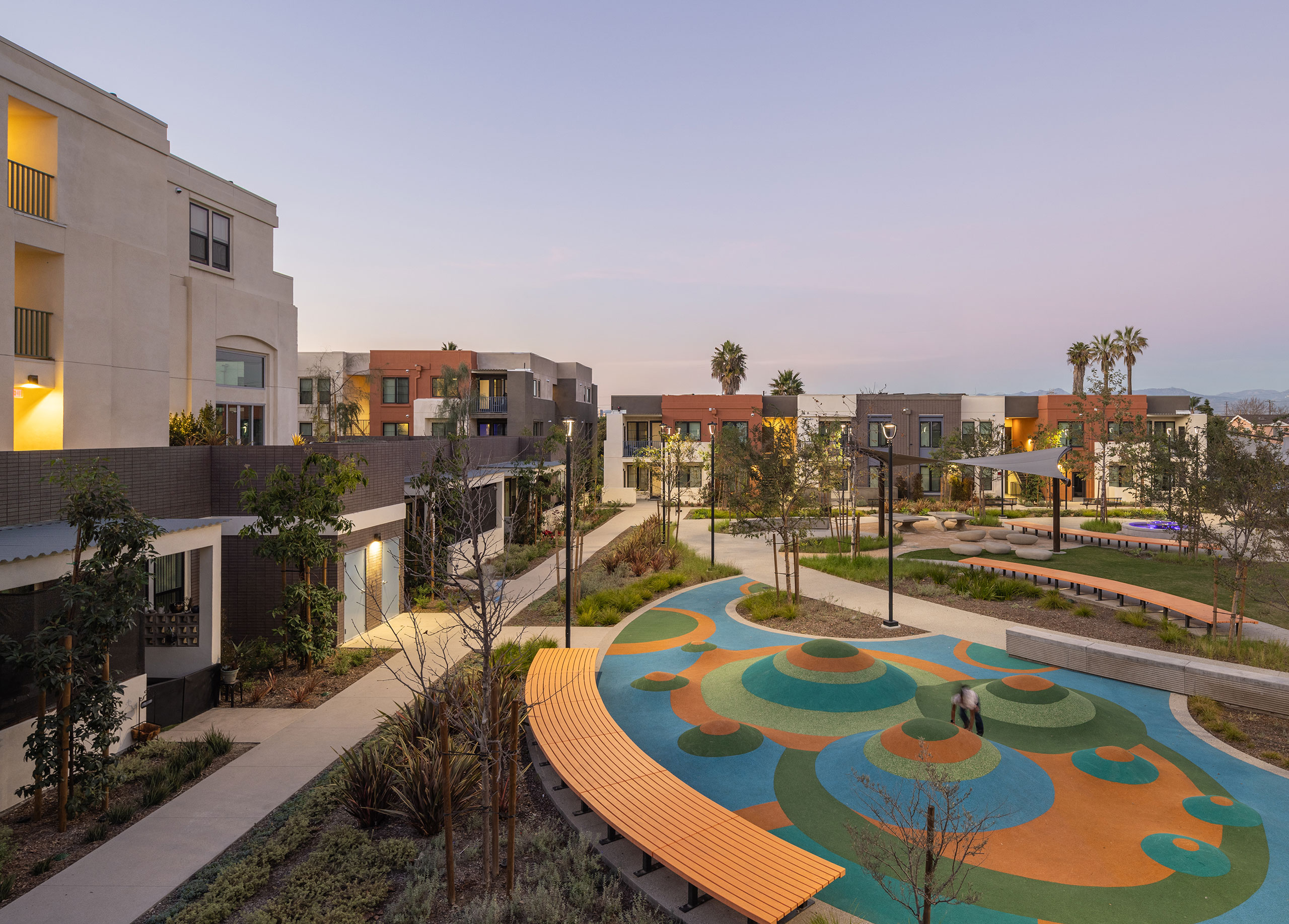 KTGY’S contribution to the urban renewal at Jordan Downs embodies our approach to the design of affordable housing. Our team interpreted an ambitious specific plan with architectural designs that synthesize efficiency and durability with safety and comfort. Centered on a ne w public park, dotted with amenities and intertwined by pedestrian circulation, our design populates two plots with a group of carefully scaled buildings. The site ebbs between podiums and walkups, and this variety creates an organic neighborhood in response to feedback from residents.