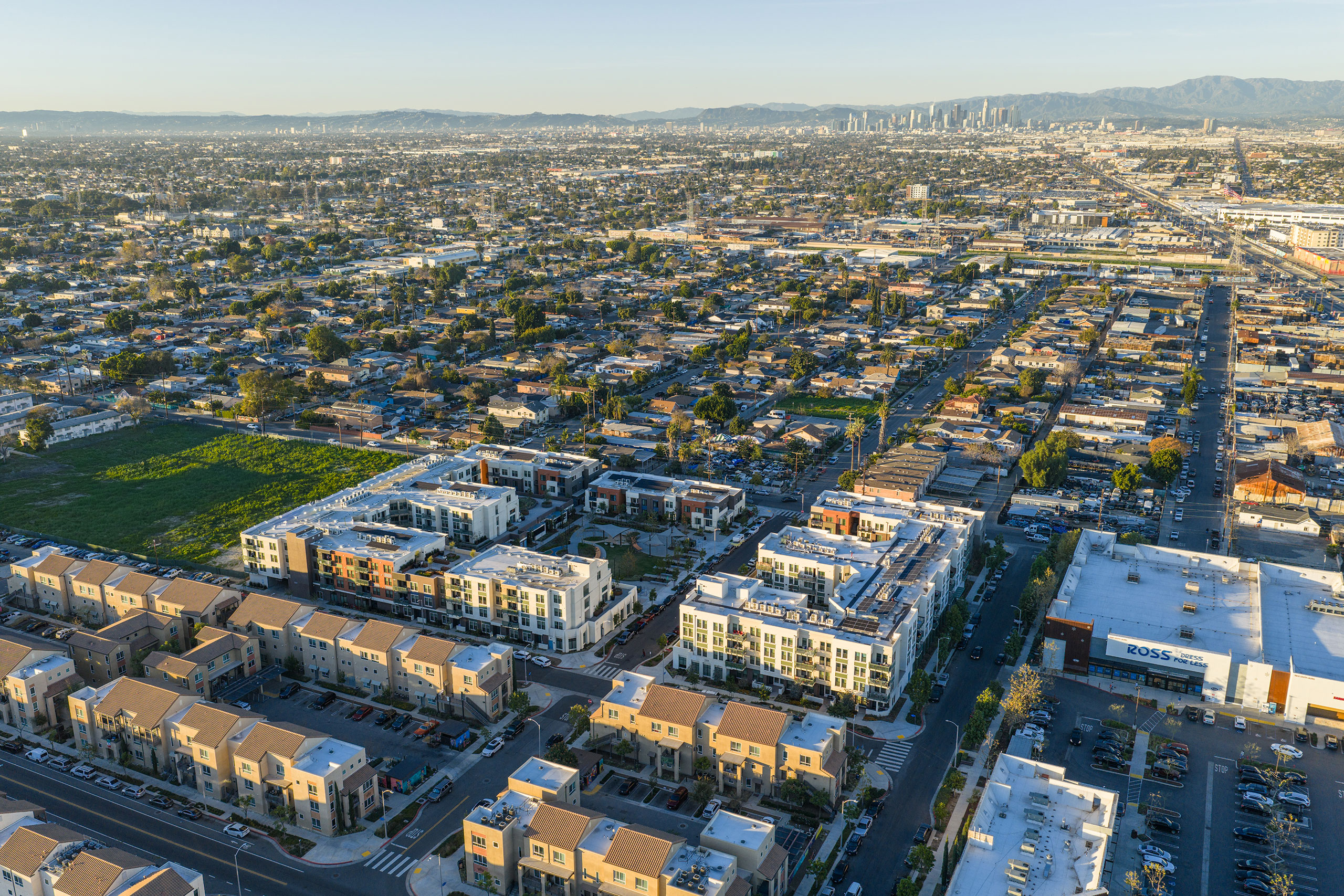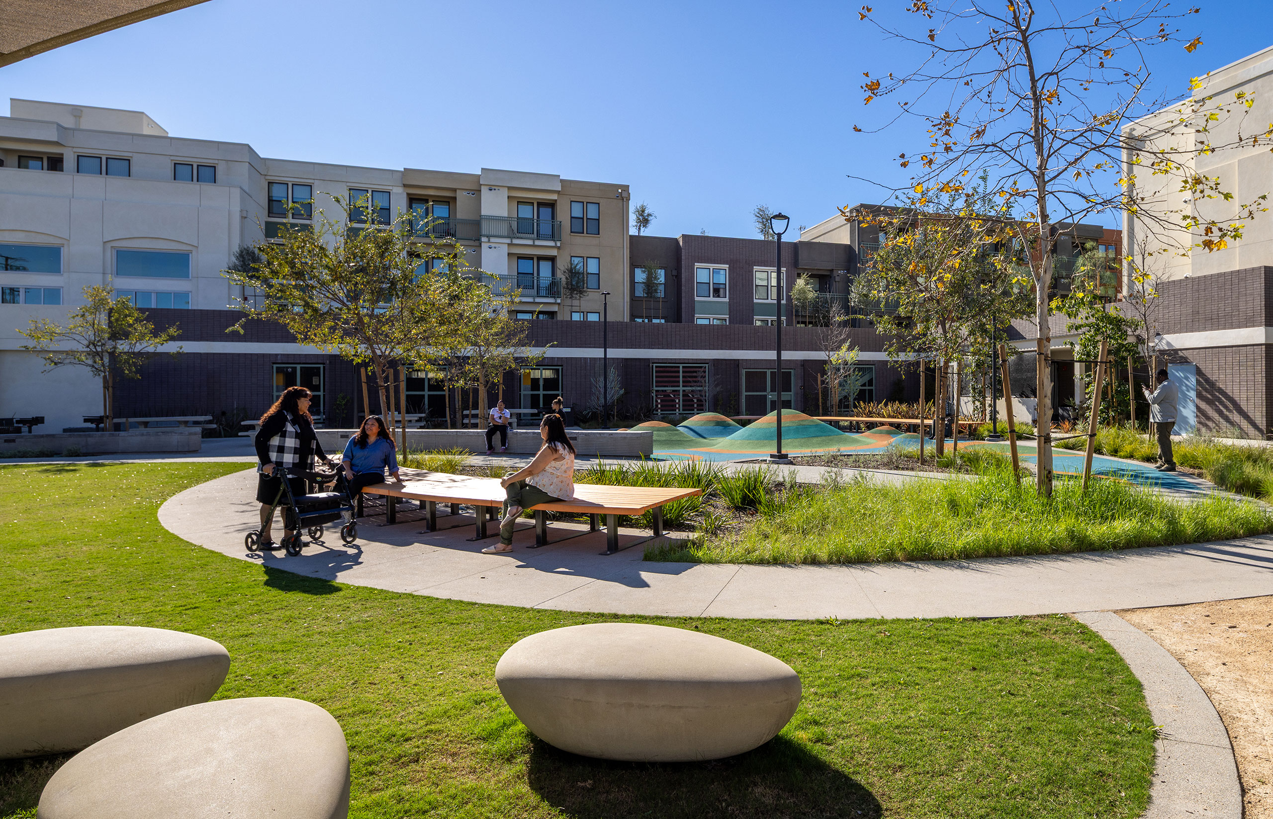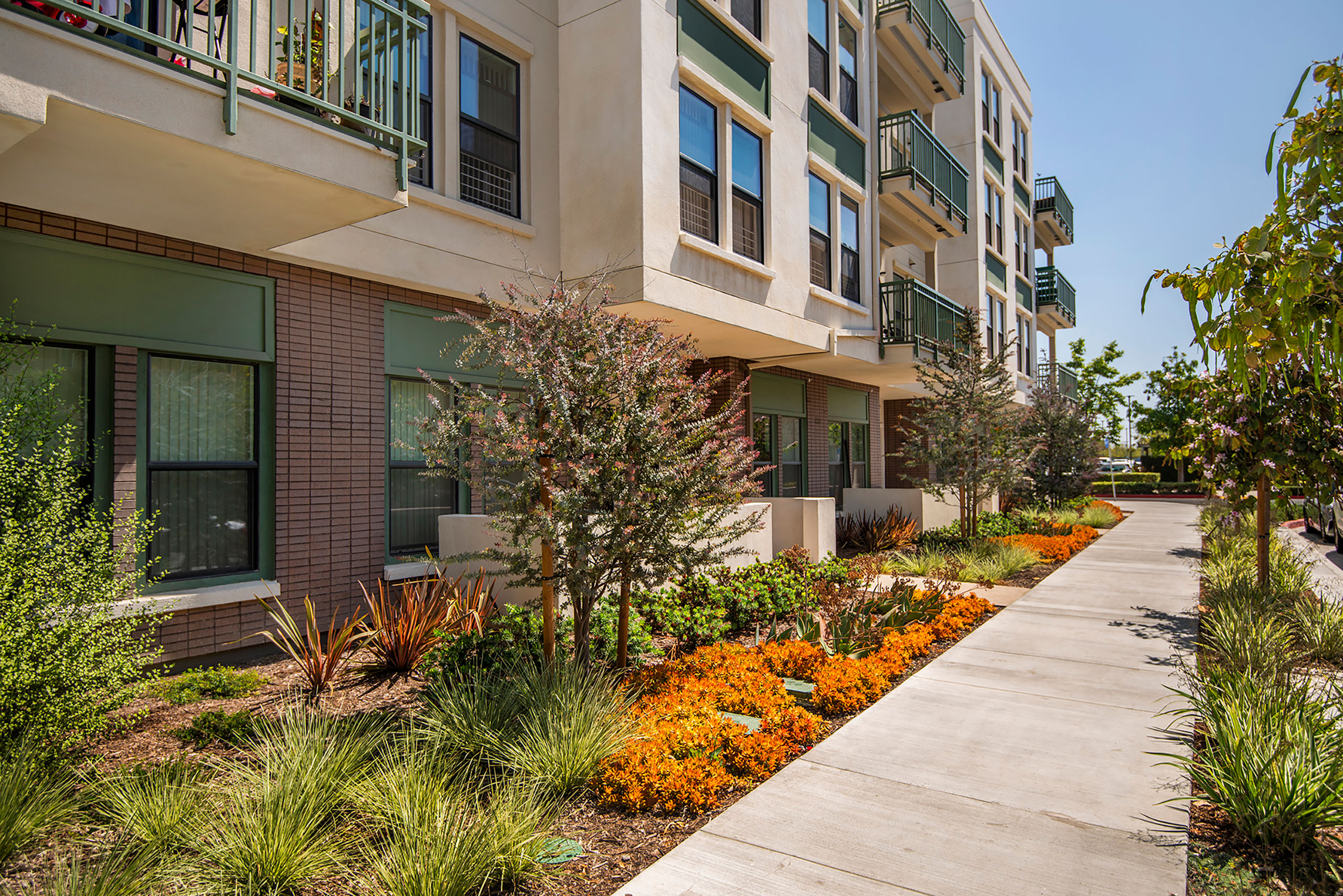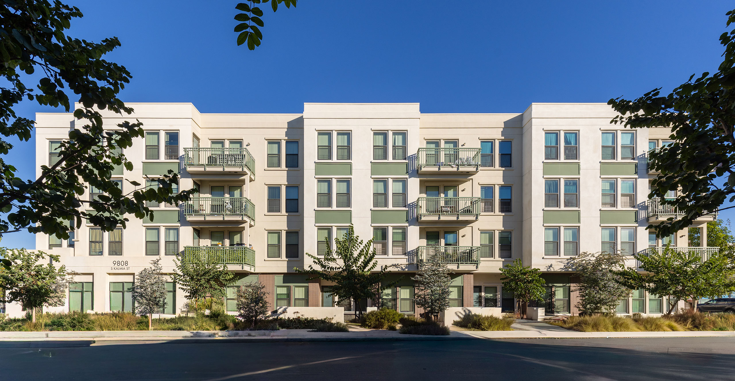 KTGY’S contribution to the urban renewal at Jordan Downs embodies our approach to the design of affordable housing. Our team interpreted an ambitious specific plan with architectural designs that synthesize efficiency and durability with safety and comfort. Centered on a ne w public park, dotted with amenities and intertwined by pedestrian circulation, our design populates two plots with a group of carefully scaled buildings. The site ebbs between podiums and walkups, and this variety creates an organic neighborhood in response to feedback from residents.