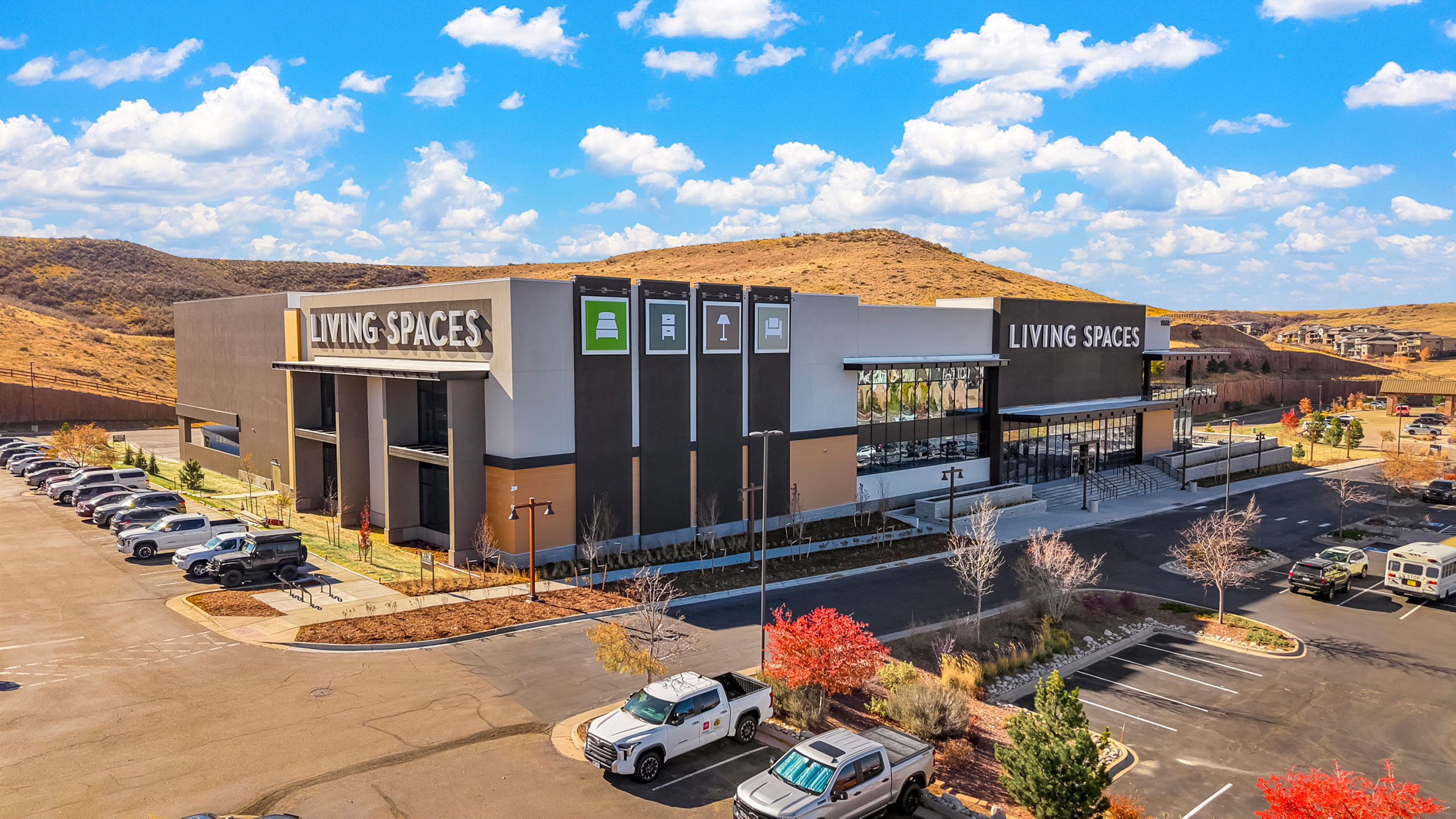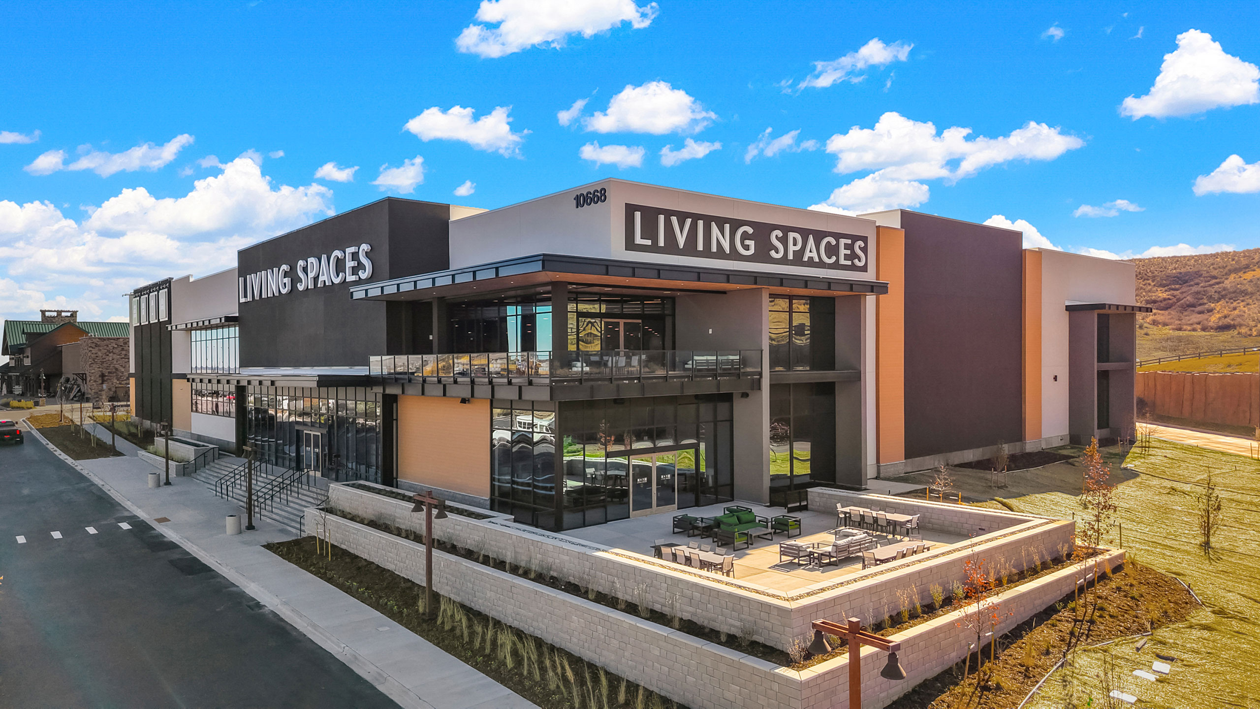 In Lone Tree, Colorado, our retail designers were challenged to articulate a large retail site for the Living Spaces home goods company. The two-story building is built on an undeveloped plot of land between a one-story retail building and a four-story hotel, our building bridges the massing gap between these neighbors. Terracing enhanced by stonework creates tranquil outdoor space with views to the gently sloping landscapes around the site. Designed to fill a physical gap as well as a market niche, this design team brings a large retail footprint down to the human scale with a dynamic facade and varied rooflines.