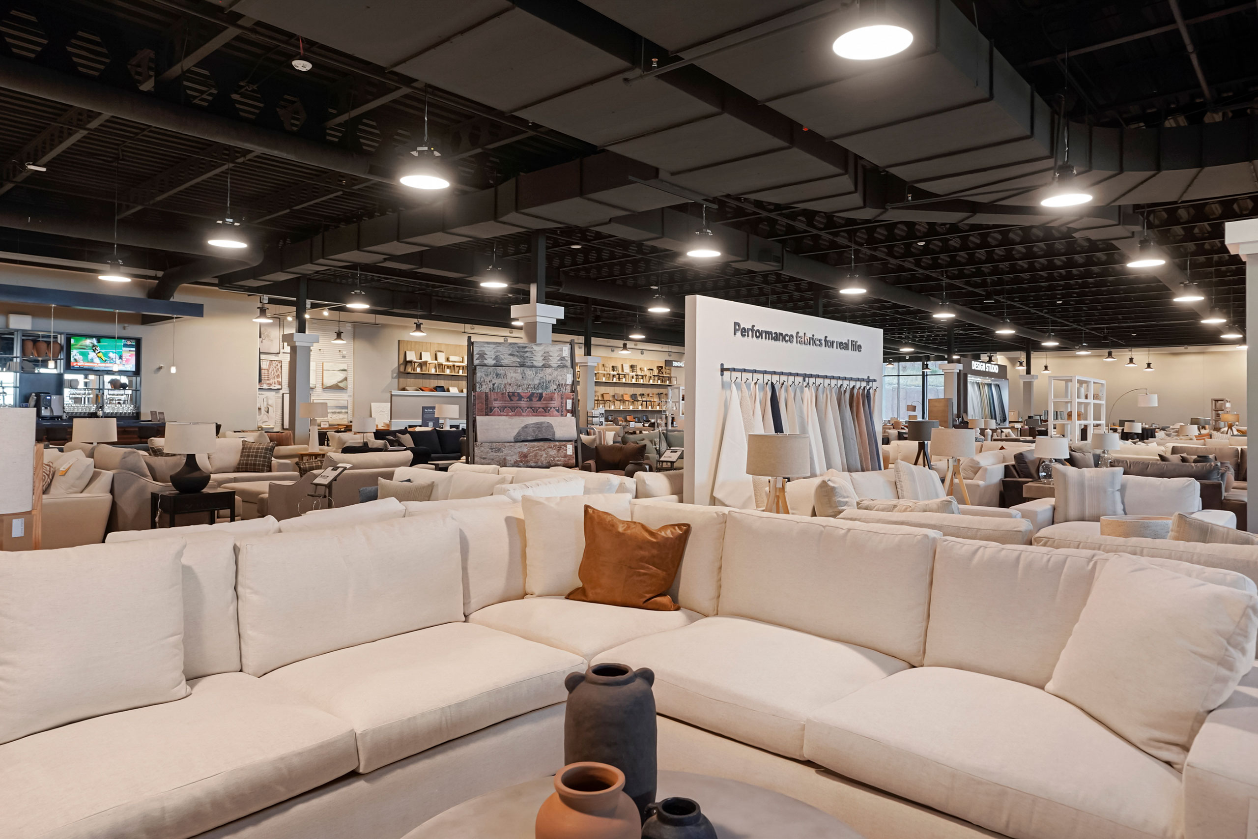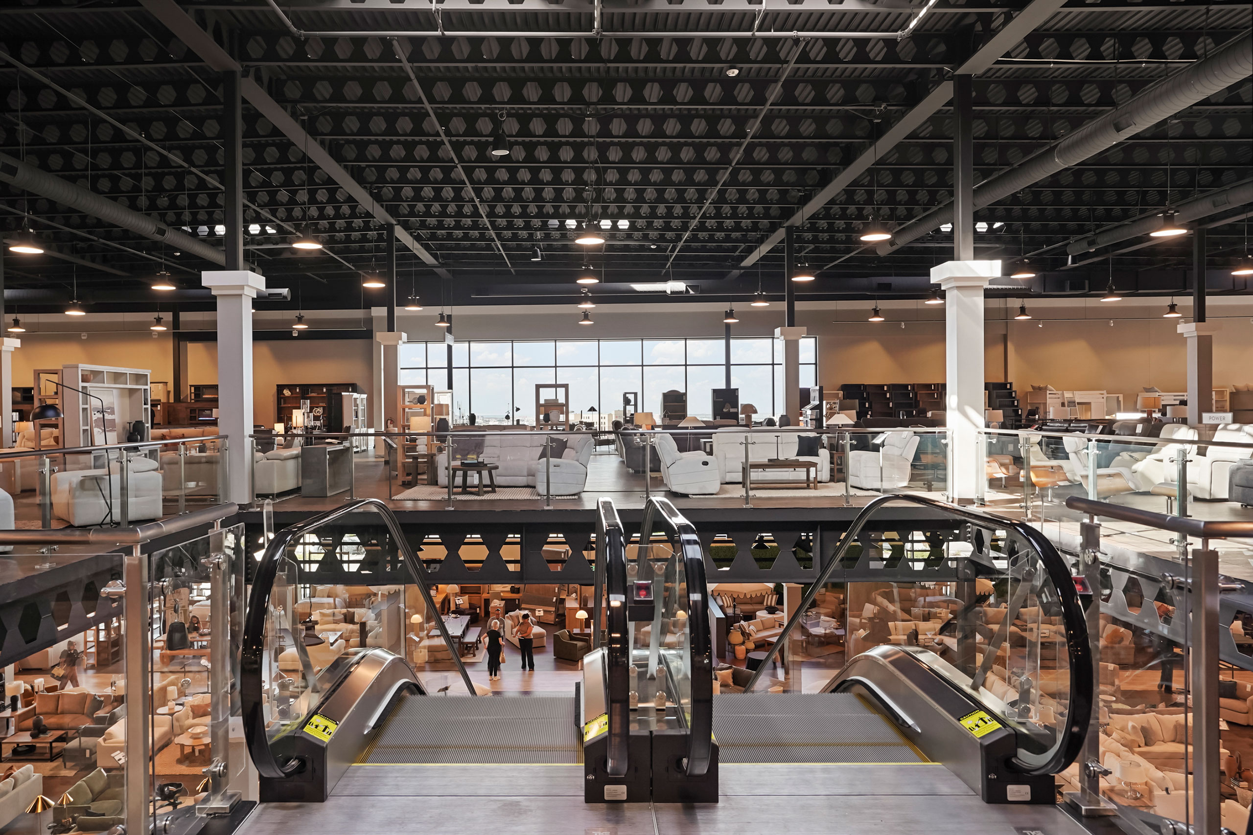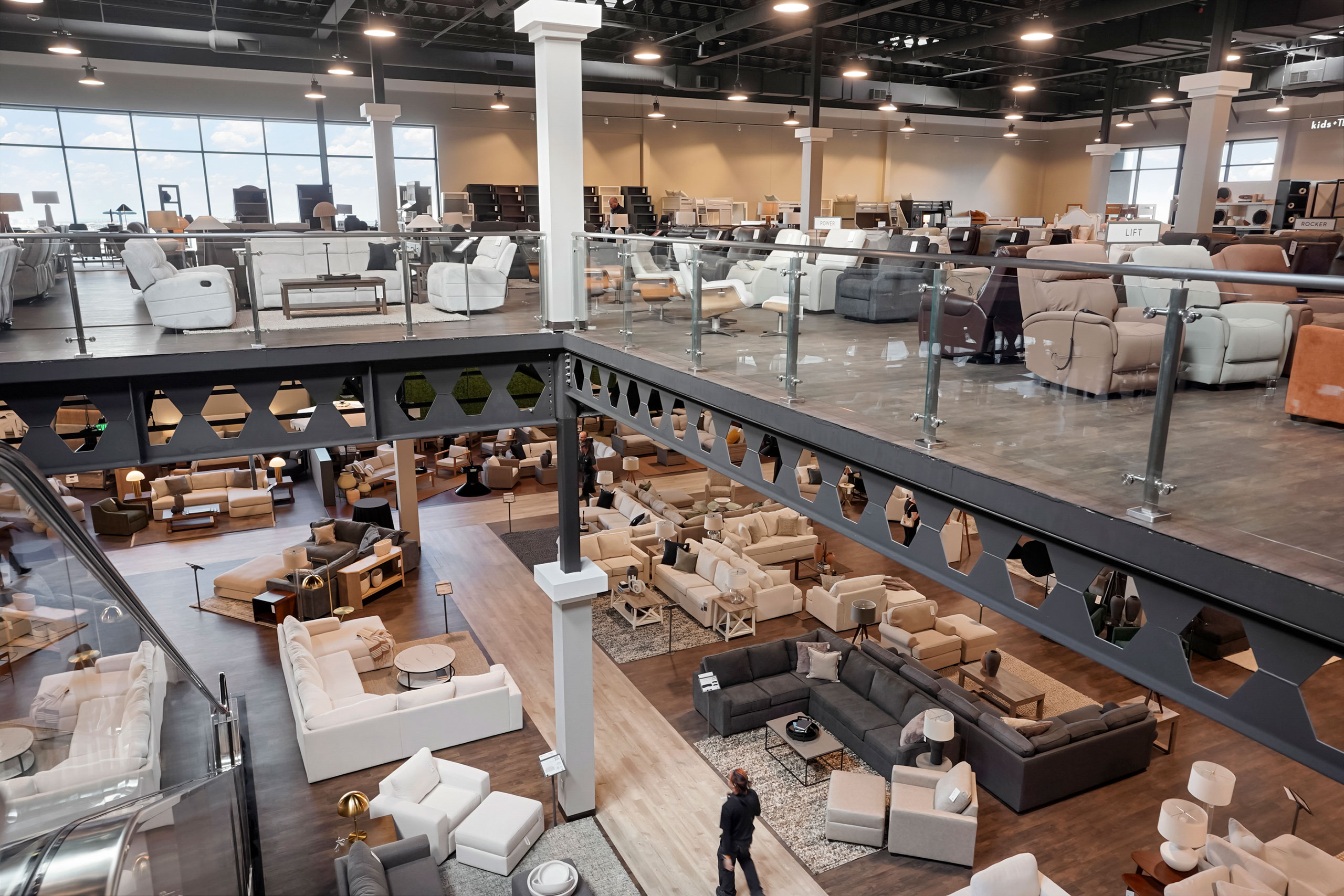 The building has a contemporary and asymmetrical look. Its colors and materiality provide a palette that is respectful of the site while maintaining a distinct Living Spaces identity. The outdoor patio and upper-level balcony are placed on the northwest corner to make a welcoming gesture, where glass and wood veneers warm the atmosphere and create a visual connection for the arriving guests. Long stretches of articulated windows allow for natural light and increased permeability. Massing variations, material and color changes work with the windows to compartmentalize the building, reflecting its interior spaces and addressing the scale of the building to the pedestrian.