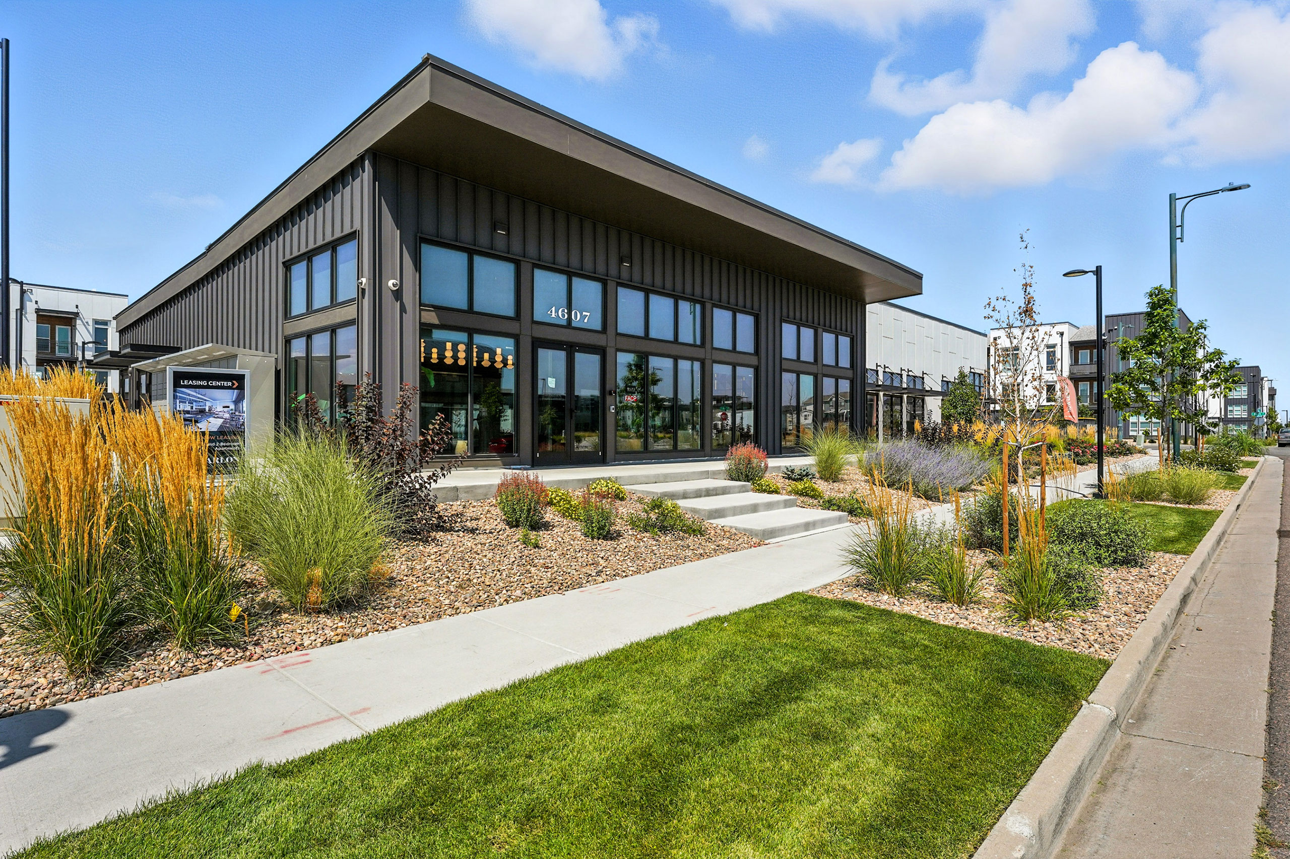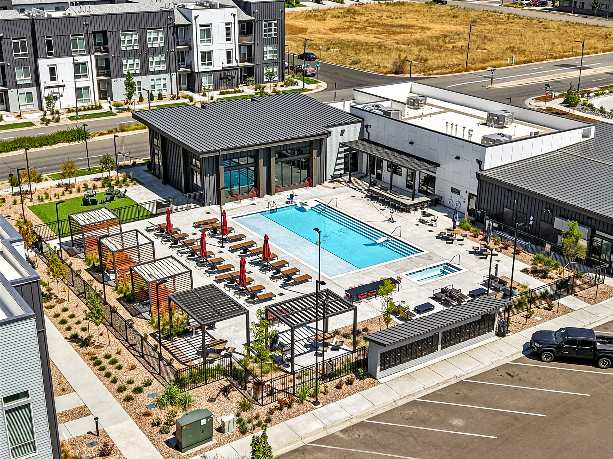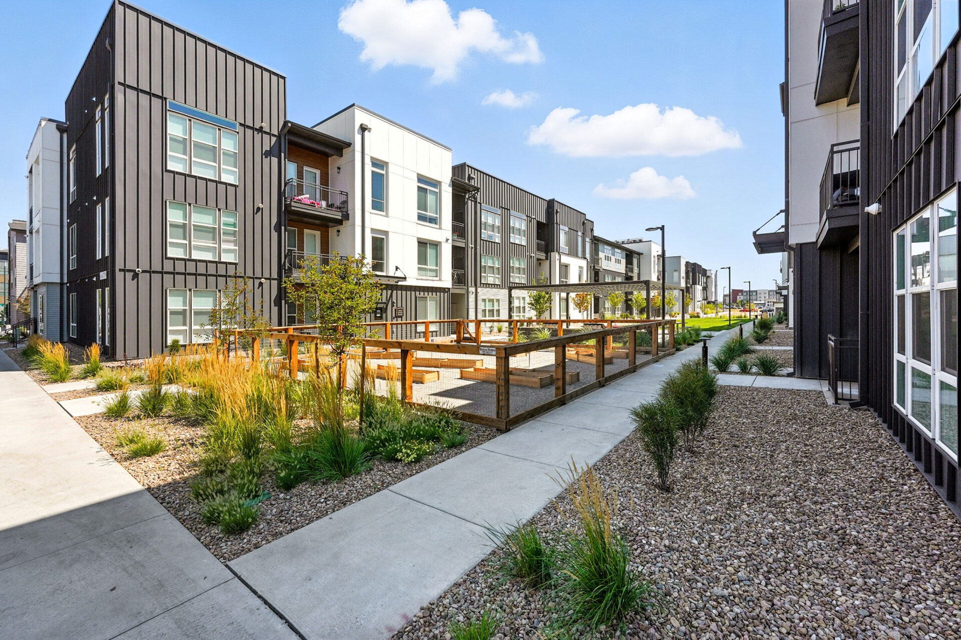 Nestled in the heart of Denver Colorado’s Central Park, Marlon at Central Park provides a combined mixture of 286 one- and two-bedroom units to accommodate residents’ diverse needs. The community’s timeless design seamlessly blends in with the surrounding neighborhood, appealing to young professionals who seek a mix of urban and suburban living. The modern design features a complementary palette of high-contrast materials, including dark standing-seam metal panels and light fiber-cement panels with warm wood tones. The site, divided into North and South parcels by 46th Place, uses open space to provide connections throughout the site with active uses such as paseos, a fitness lawn, hammock grove, community gardens and a dog run. Marlon’s expansive indoor and outdoor amenities allow residents to maximize fitness and wellbeing, featuring an outdoor pool and spa, fitness center with private studios, bike shop, game room, play area, covered outdoor dining area with grills, co-working space and more.