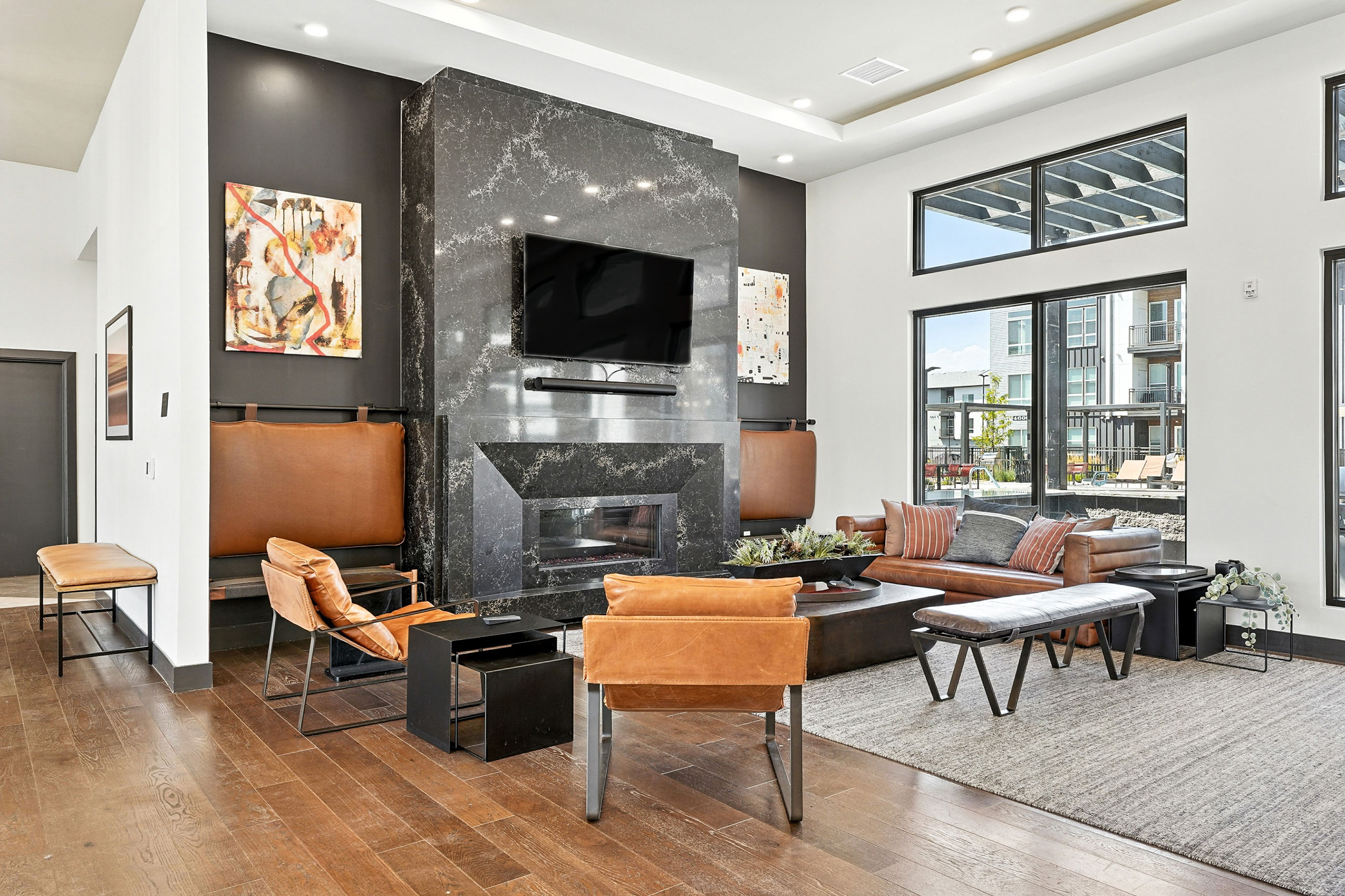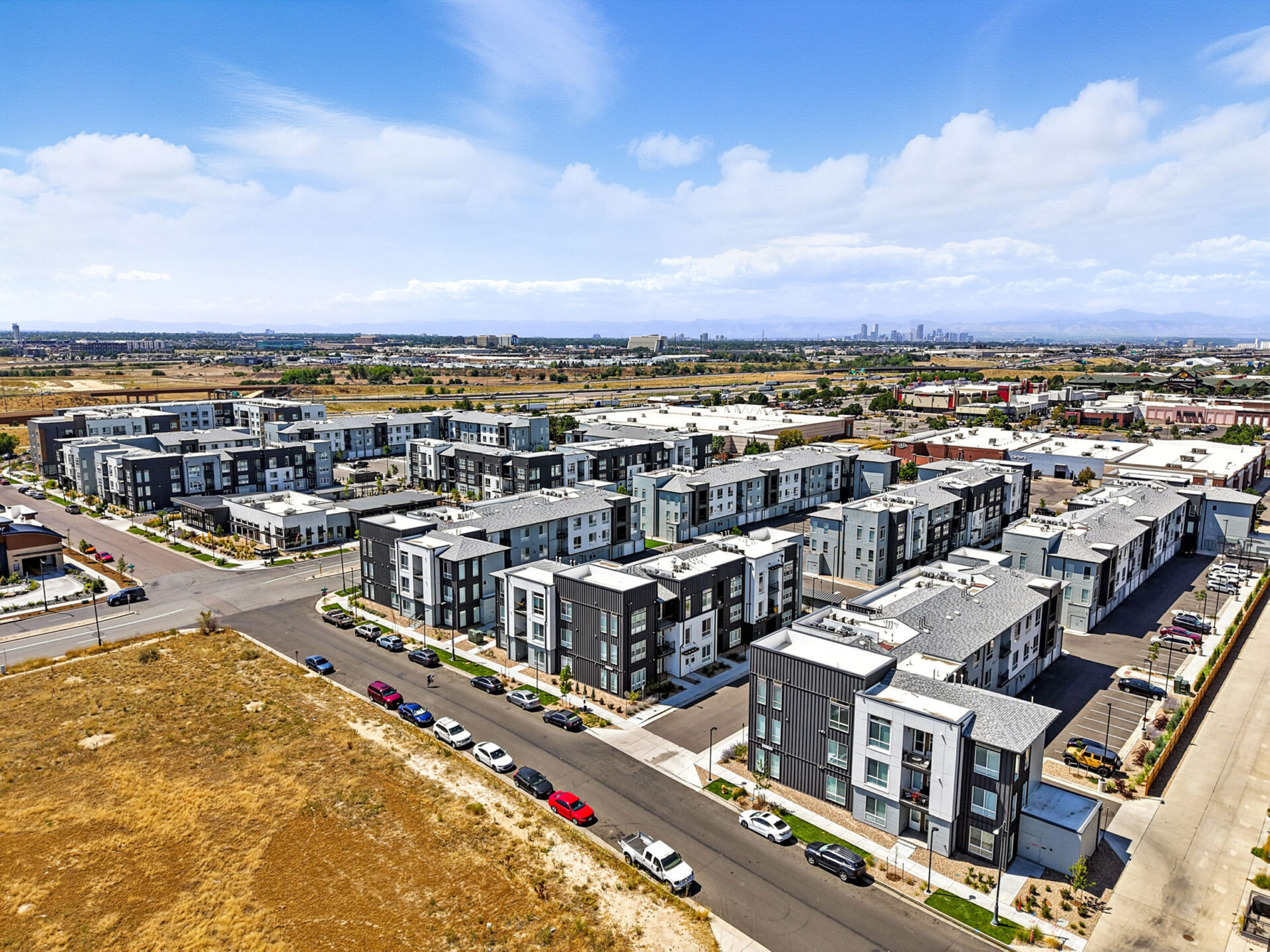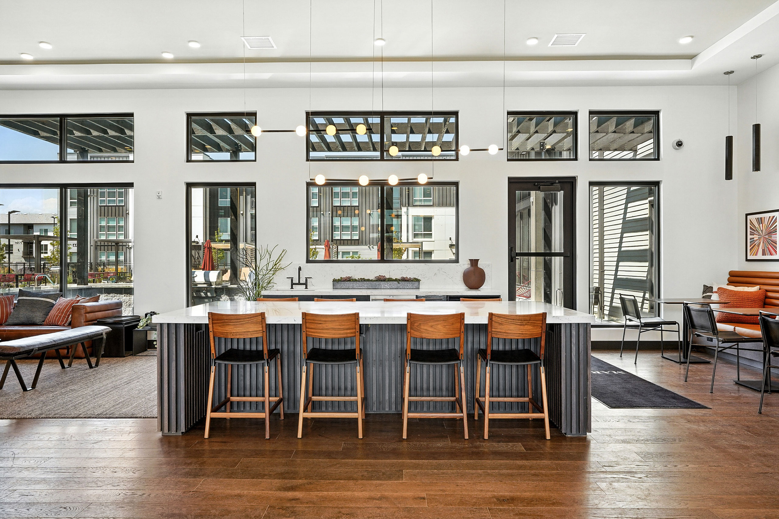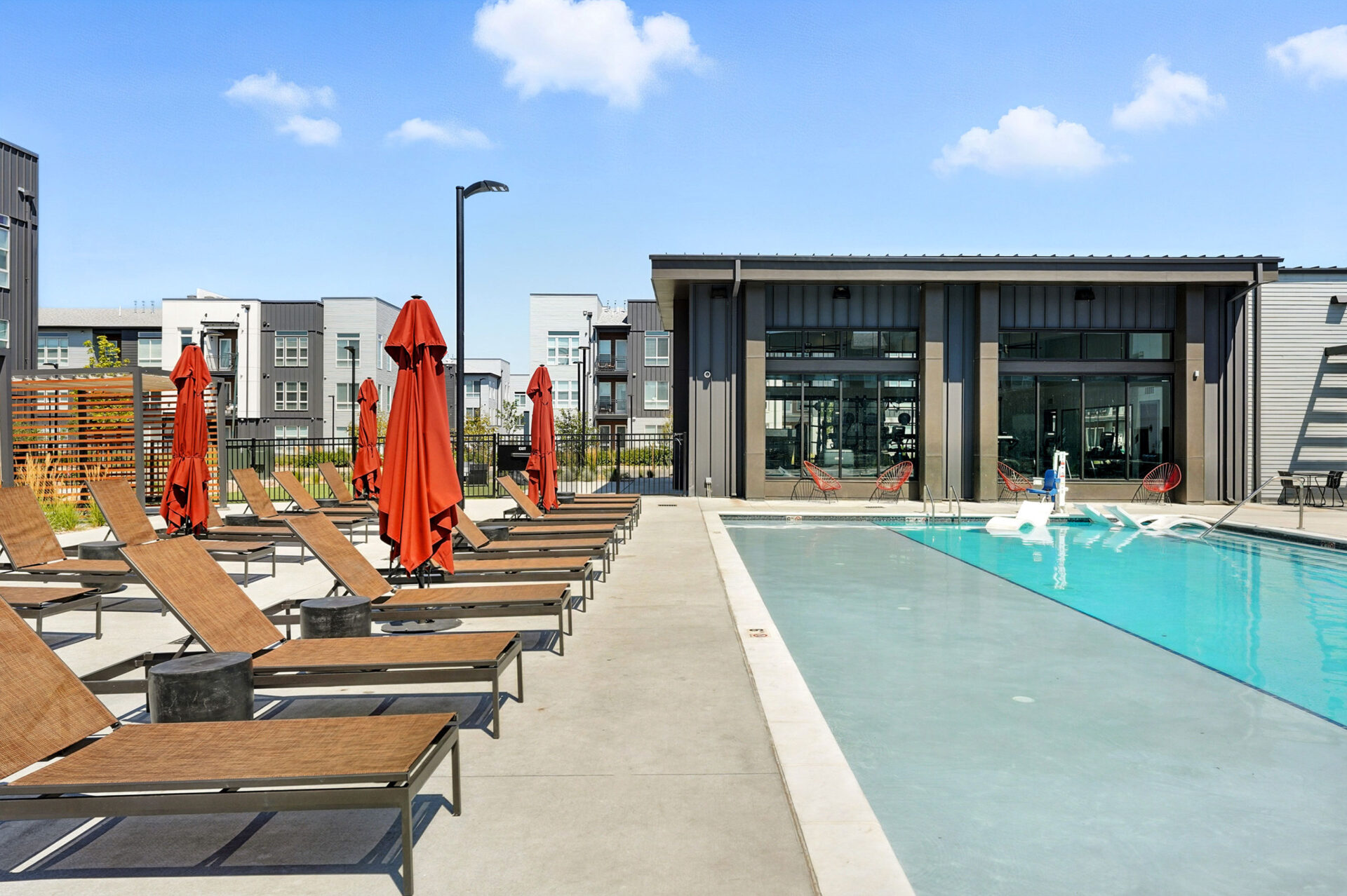Nestled in the heart of Denver Colorado’s Central Park, Marlon at Central Park provides a combined mixture of 286 one- and two-bedroom units to accommodate residents’ diverse needs. The community’s timeless design seamlessly blends in with the surrounding neighborhood, appealing to young professionals who seek a mix of urban and suburban living. The modern design features a complementary palette of high-contrast materials, including dark standing-seam metal panels and light fiber-cement panels with warm wood tones. The site, divided into North and South parcels by 46th Place, uses open space to provide connections throughout the site with active uses such as paseos, a fitness lawn, hammock grove, community gardens and a dog run. Marlon’s expansive indoor and outdoor amenities allow residents to maximize fitness and wellbeing, featuring an outdoor pool and spa, fitness center with private studios, bike shop, game room, play area, covered outdoor dining area with grills, co-working space and more.