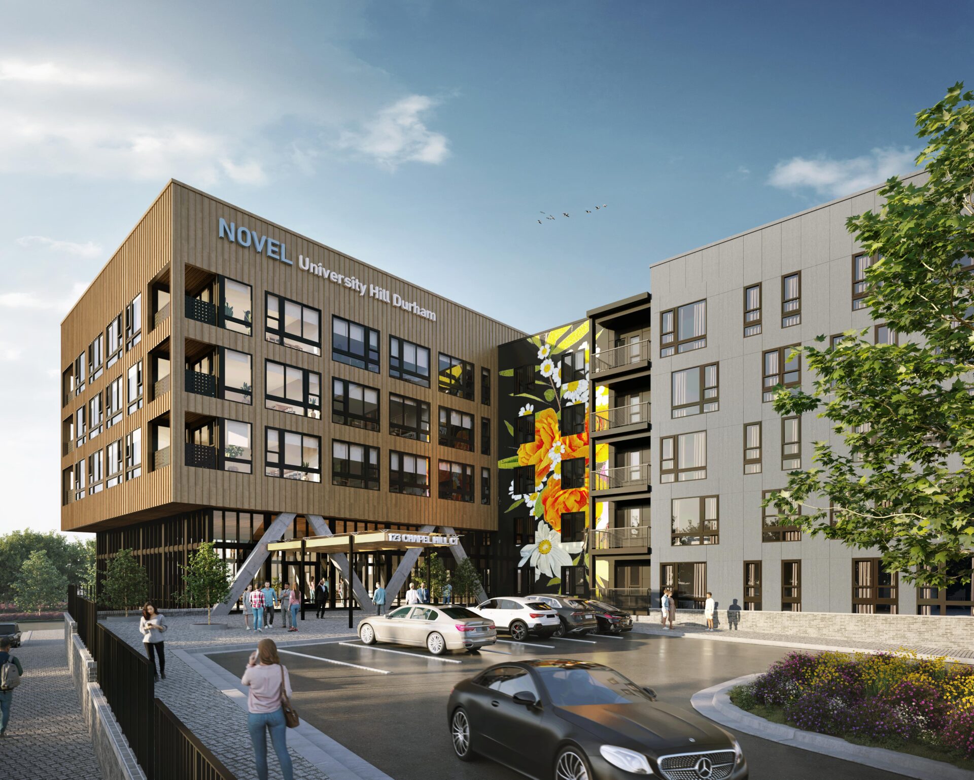 Novel UHill is an energetic multifamily development gracing the center of North Carolina’s Research Triangle in Durham, NC. KTGY’s architectural design fosters a playful community through carefully designed and efficient units, complemented by an amenities program that engages residents with one another and their surroundings. Color and material variations, along with massing delineations and a partnership with the UHill Walls mural program, reinforce the urban village atmosphere. Targeted to the young people attracted to adjacent universities, research and medical facilities, Novel UHill’s design offers something exciting for undergrads, grad students, faculty and professionals making their way in The Triangle.