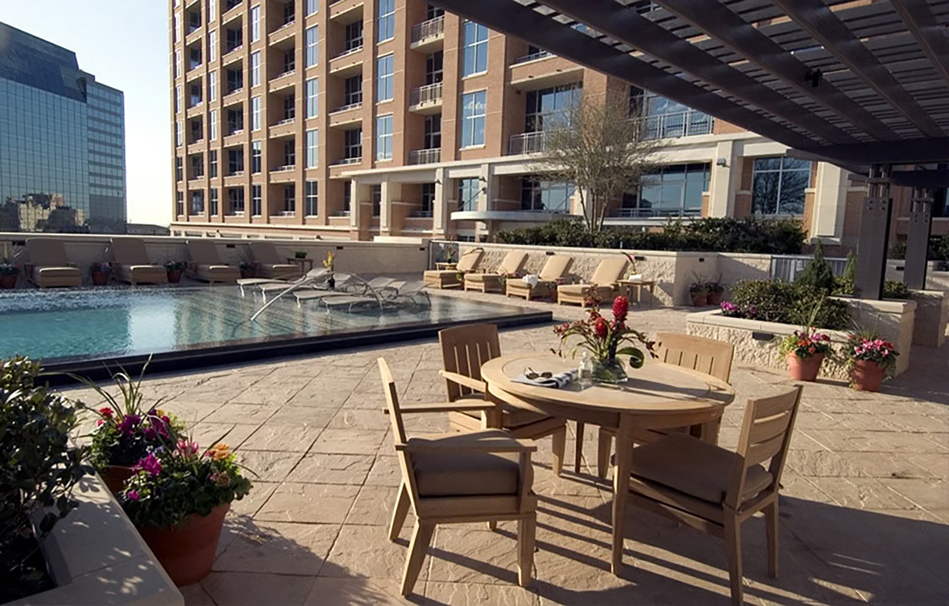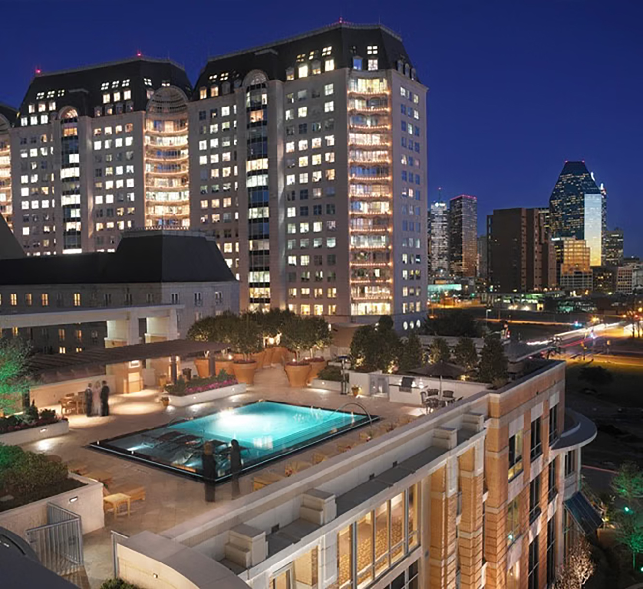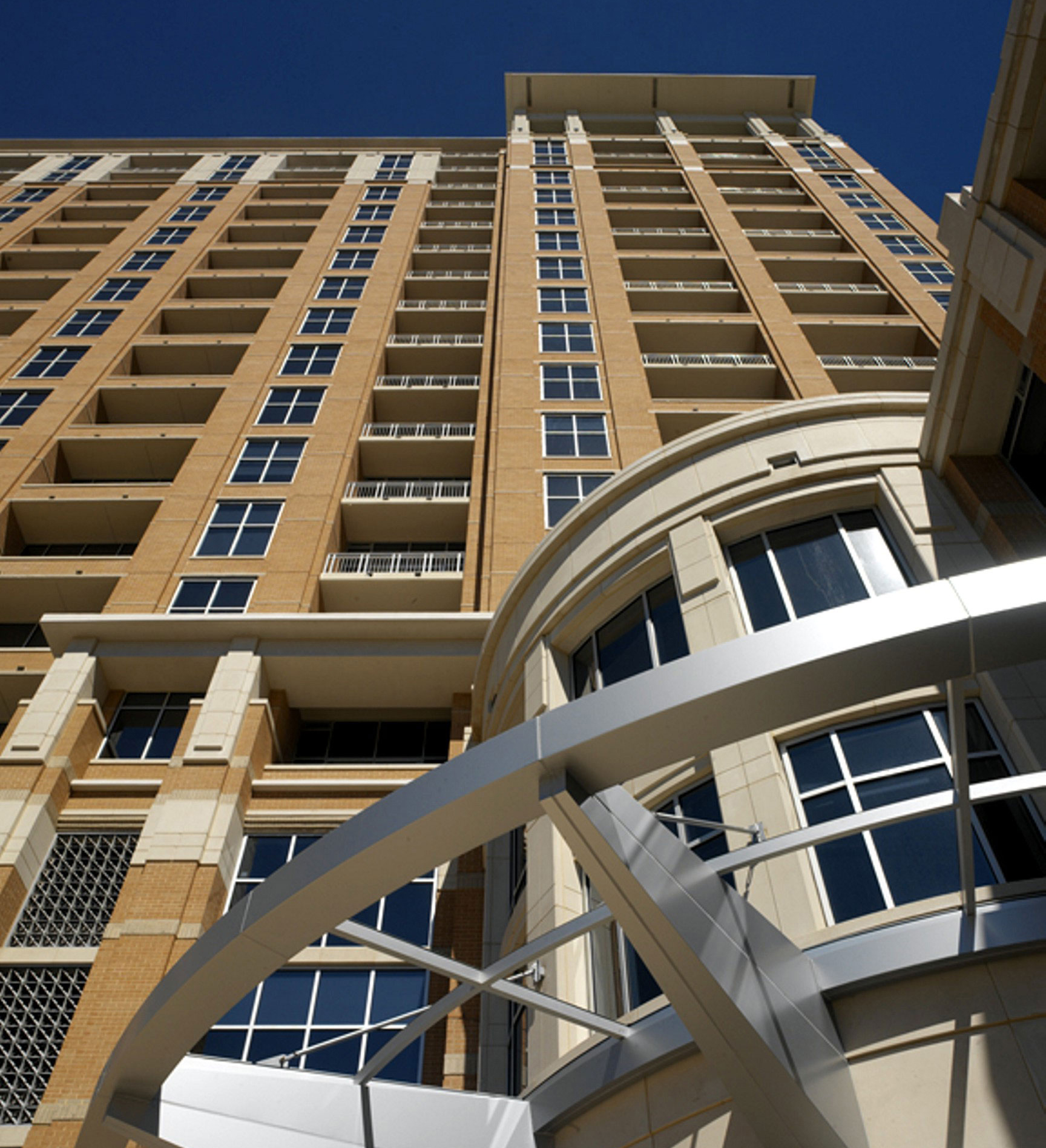 Transitional aesthetic design combines elements of traditional architecture with modern lines and contemporary materials. A pronounced corner element anchors the building on the street and engages it with storefront windows showing the active co-working spaces inside. The site faces Stanley Korshak at The Crescent, and shadow boxes in ground floor windows mirror the famous seasonal displays across the street. Each unit features exquisite finish and generous living space. Among the premium amenities are coworking and conference spaces, a screening room and wine lockers, alongside more expected amenities like the pool deck and fitness club.