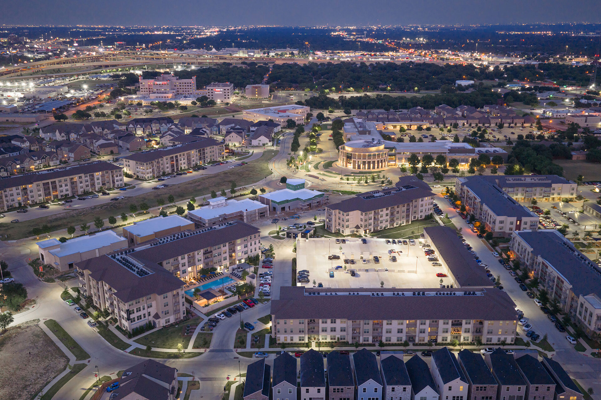 All within a short commute from Fort Worth and Dallas, City Point attracts commuting professionals, young people and new families with a community of residences, offices, retail and restaurants. The Delegate is an aspirational presence near retail and detached single family homes, providing an active but quiet and walkable neighborhood for new residents with a range of apartments and townhomes to serve diverse needs. The amenity-rich buildings create a transition zone, never reaching higher than four stories. To suit commuter demand, surface parking is supplemented by tuck-under garages and a parking structure. High end finishes make each unit a home, and a large courtyard, community room, and 24-hour fitness center make happy residents. Facade designs are clean and contemporary, inspired by the nearby city hall, giving the buildings a stylistic throughline and a visual tie to the surrounding area.
