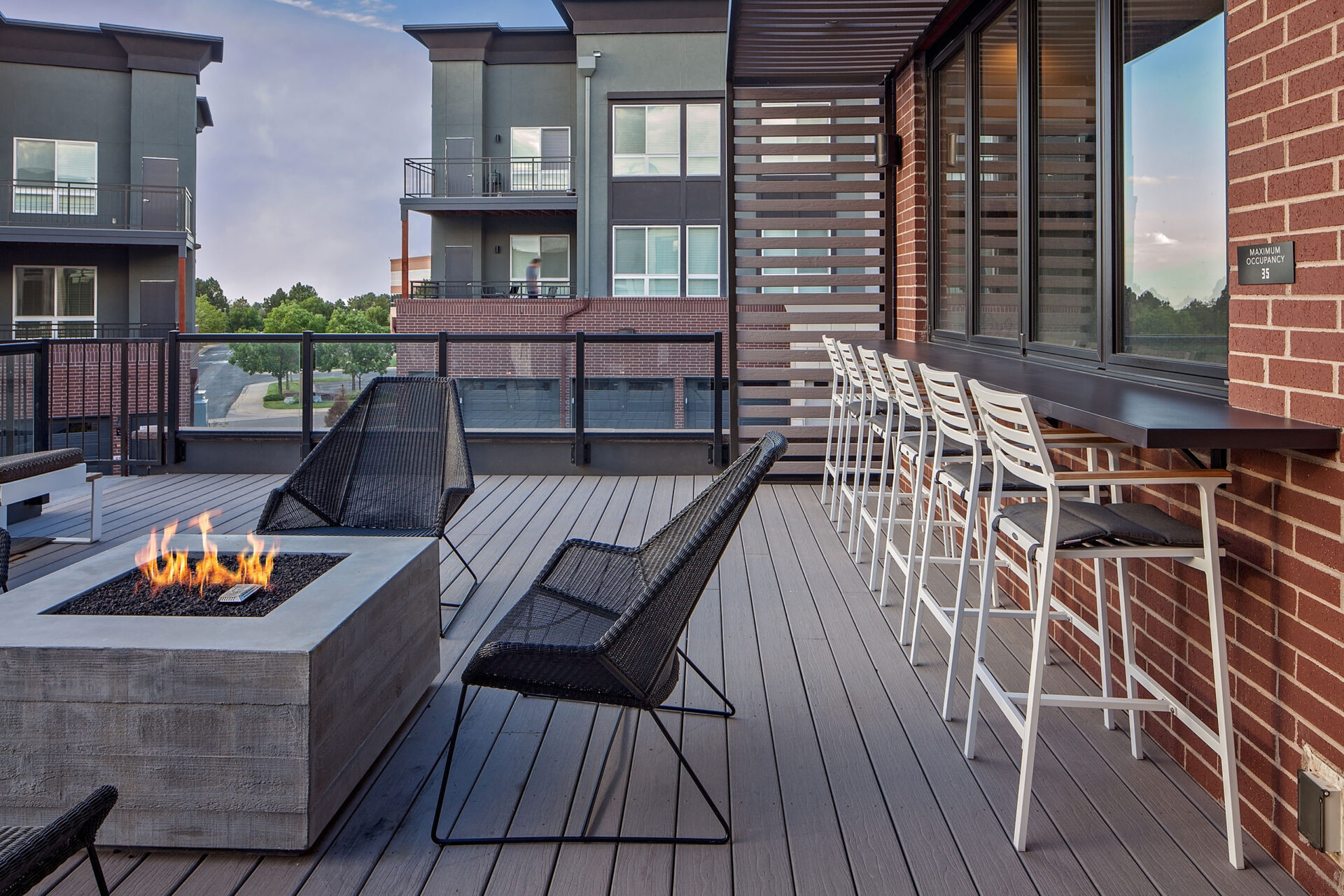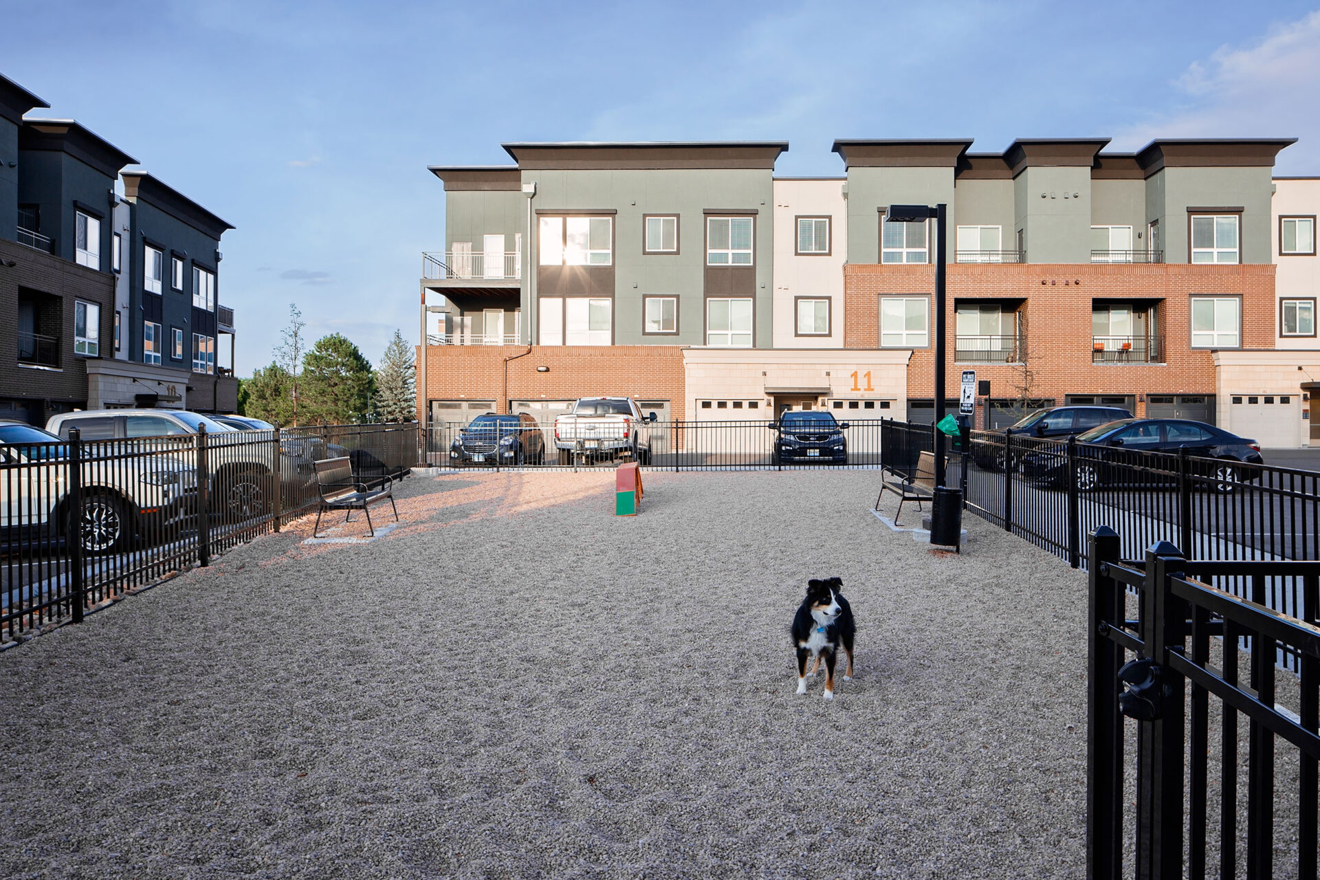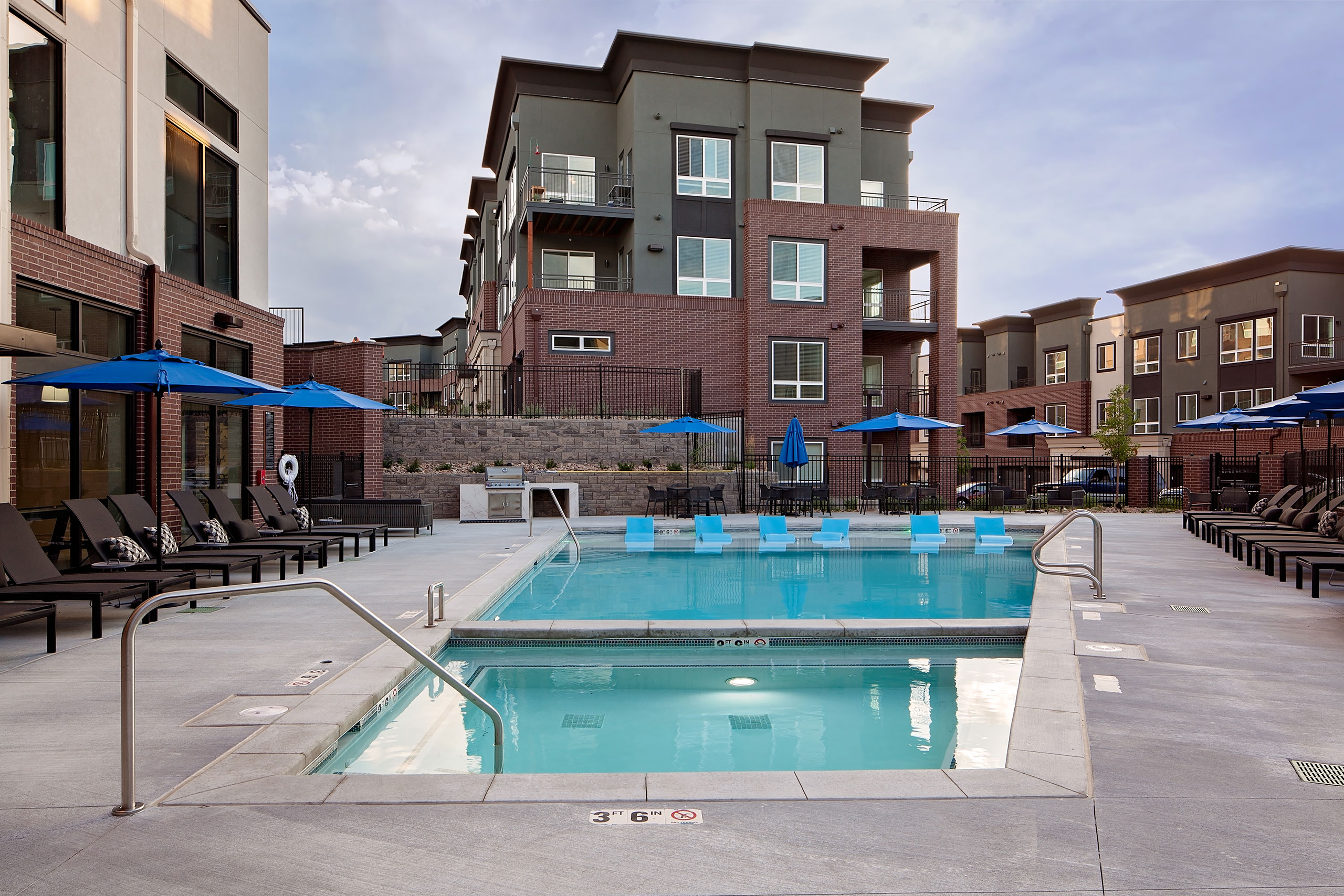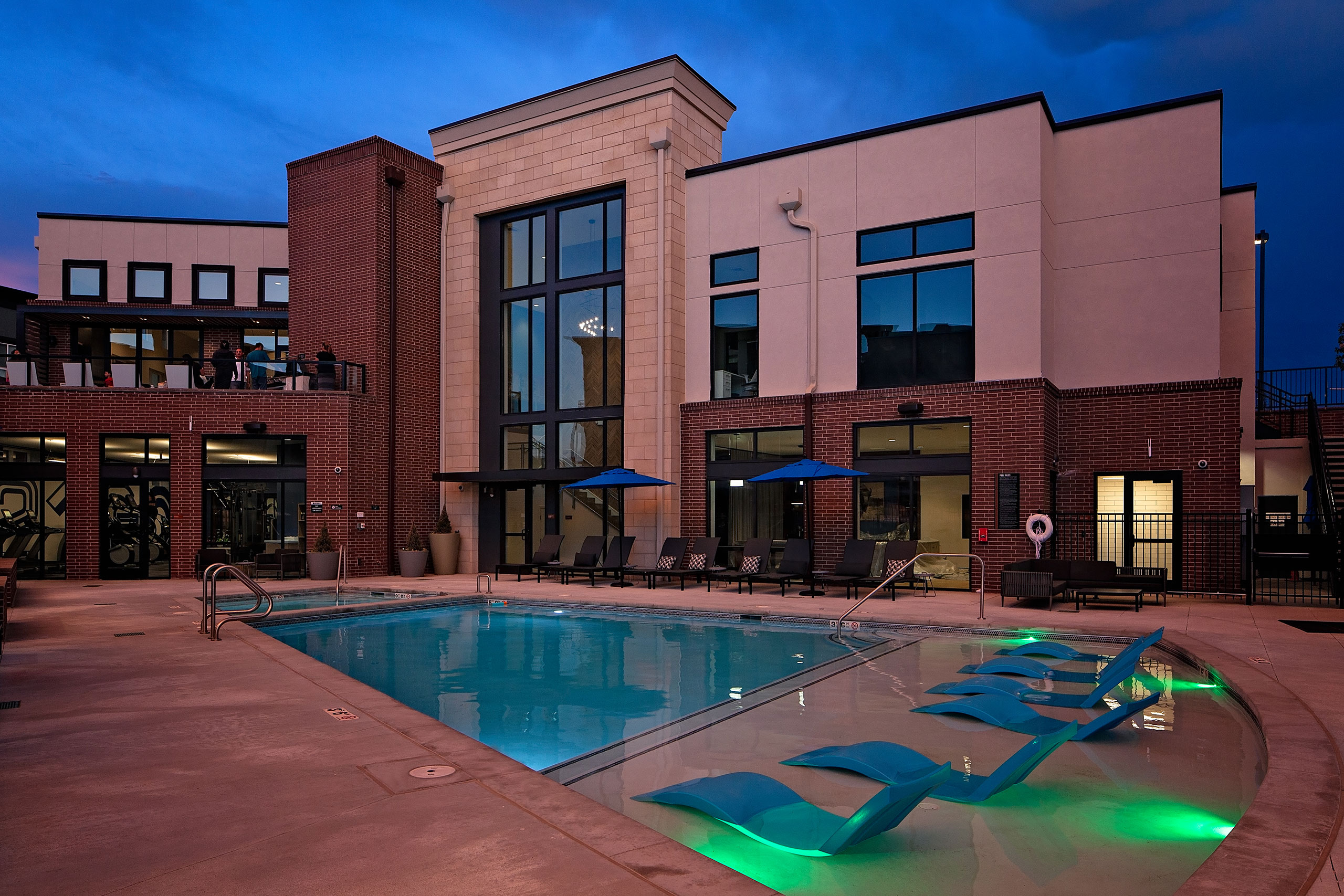 The community comprises 252 apartment units across 11 three- and four-story garden-style buildings, with 156 tuck-under garage spaces. Each building creates a strong corner presence, and along with the stoops and awnings, contributes to the development of a pedestrian-friendly community. The clubhouse and amenities are provided in a separate two-story building with a walkout to a luxury pool deck. Additional community amenities include a community kitchen, indoor and outdoor lounge spaces, fitness area, dog wash, leasing offices and centrally-located mailboxes.