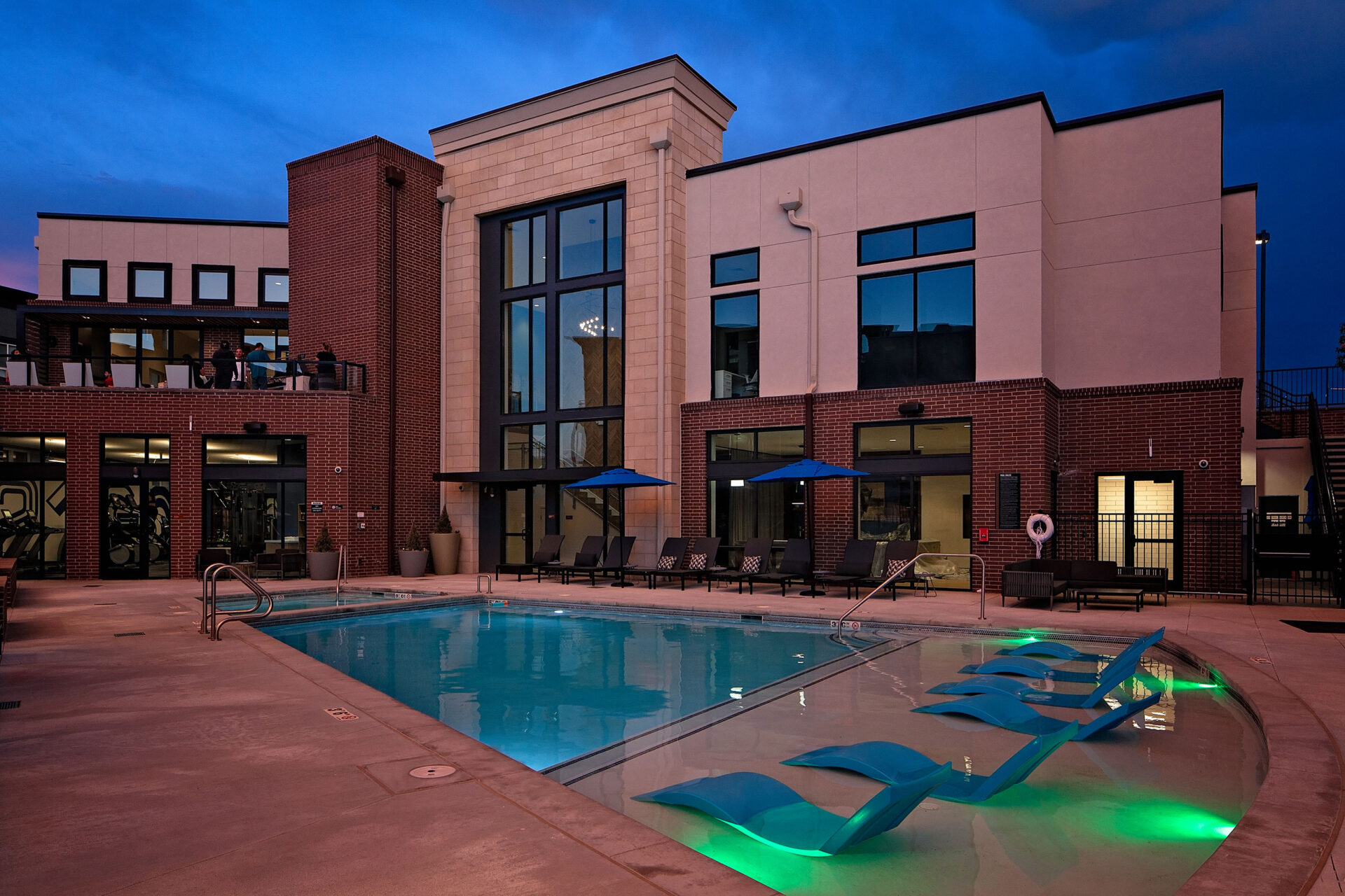 Located in Douglas County in a zoned Planned Development, the designers oriented the residential buildings in a pie-shaped configuration with large windows and balconies in each unit to convey a great sense of openness highlighted by western views to the Inverness and the front range beyond. Responding to a 50-foot drop-off in elevation from the southeast to the northwest corners of the site, the master plan divides the development into three major components, tiered vertically to connect the residential buildings to the north and northeast entries, as well as the south shared access. The thoughtful design respects the streetscape, providing a variety of buildings along the street while minimizing views of parking fields.