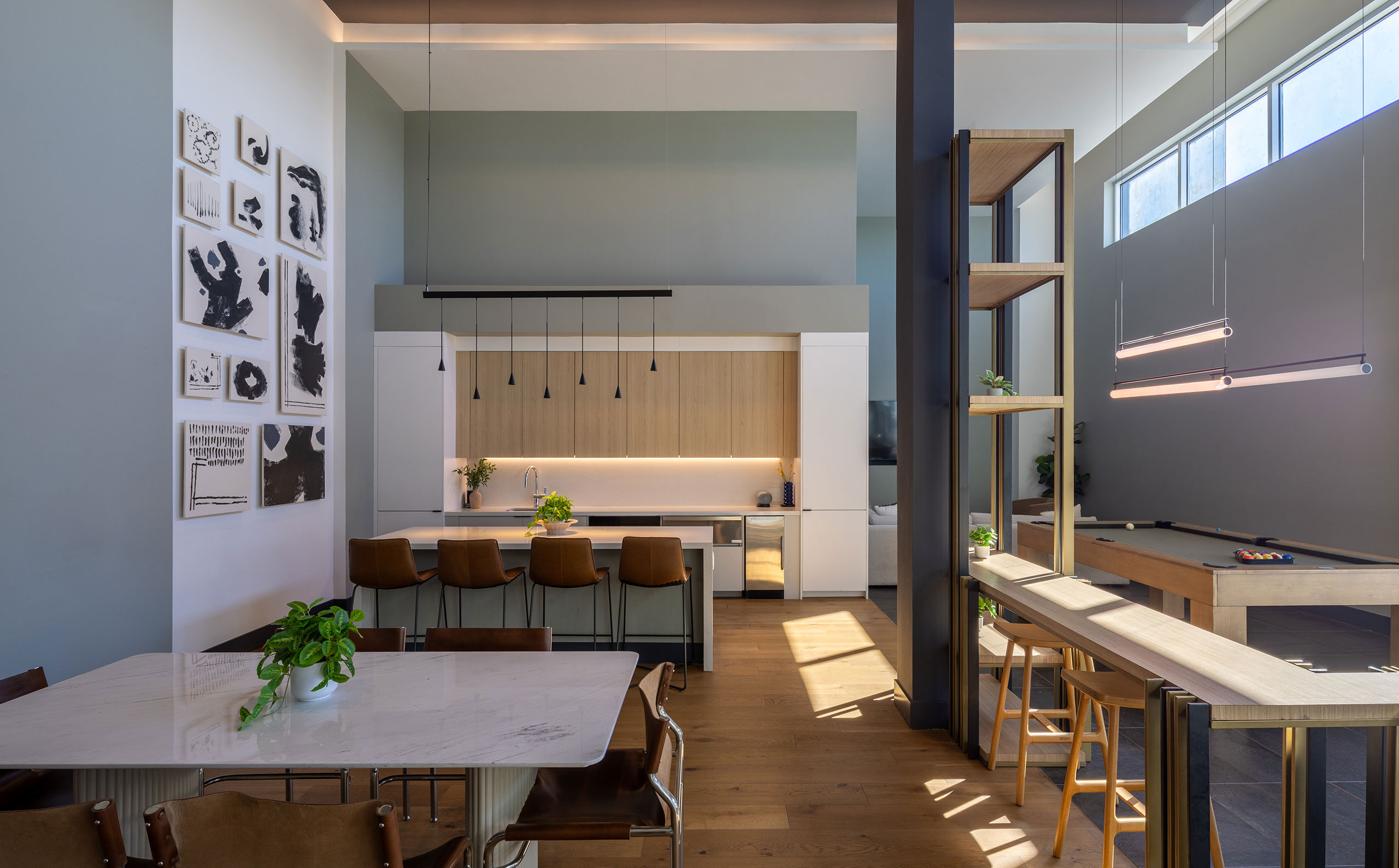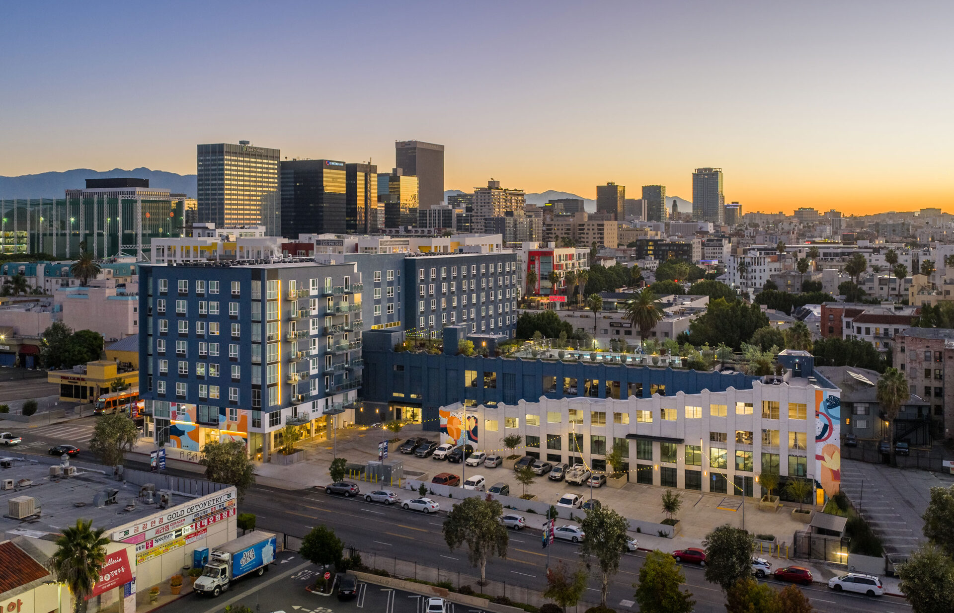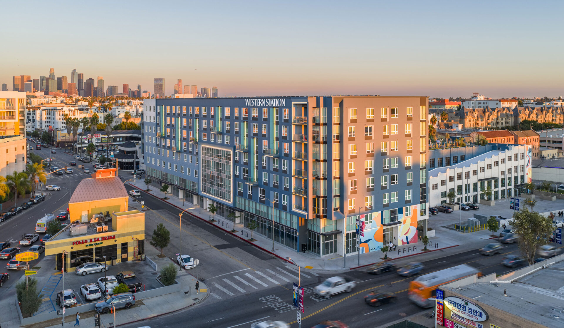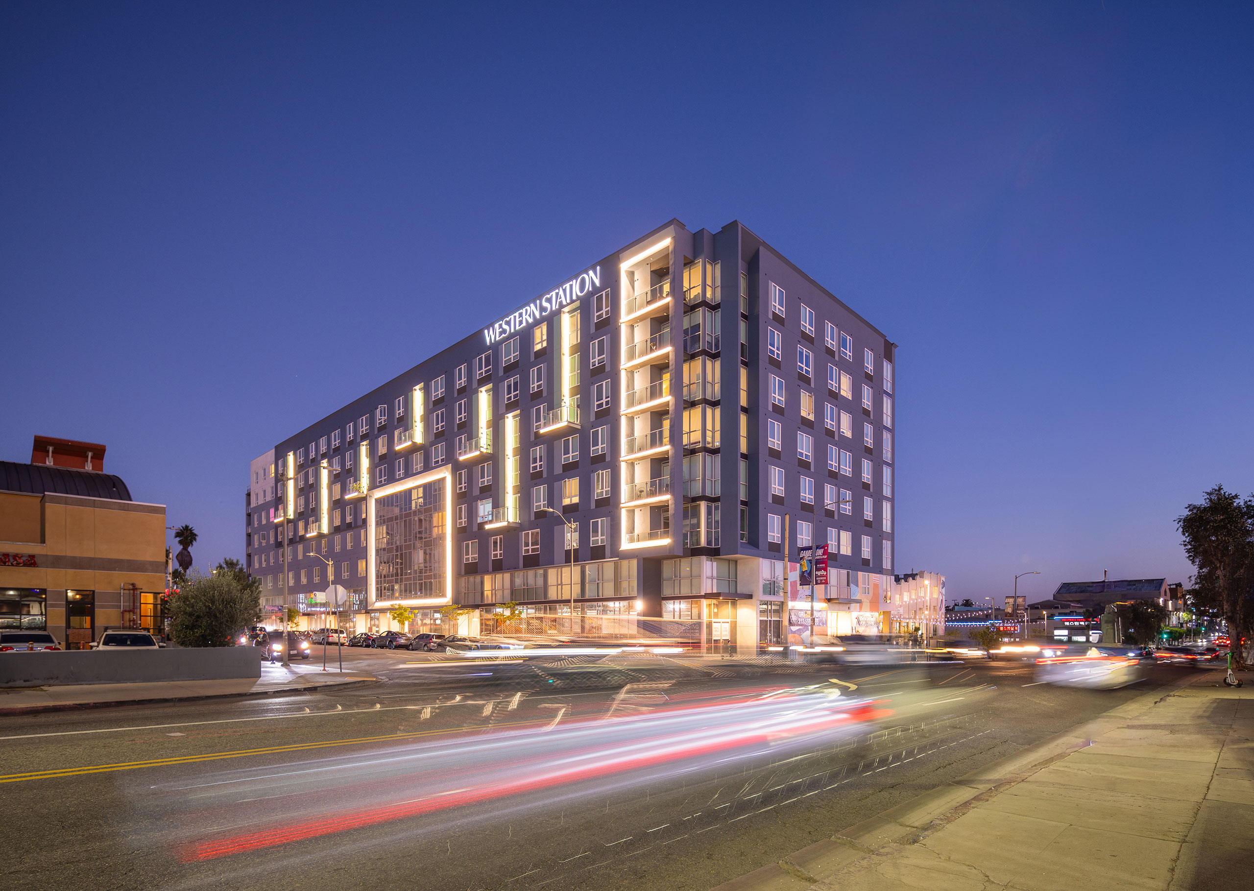 Western Station’s architecture takes its cues from the culturally rich surroundings of the city of Los Angeles. The adjacent 1930’s parking garage is incorporated into the design. The top level is planned for residential amenities and will connect to the residential community via pedestrian bridge. The additional levels will remain and provide parking for residents, as well as community serving retail. Two blocks from the iconic Wiltern theater, architects selected a color palette that referenced the historic property. The contemporary design is expressed through the bold horizontal blue slate massing; staggered windows and fenestration elements help break-up the otherwise smooth façade. Several corner balconies suspended within a large “lantern-like” element framed with clean lines protrude out from the North façade further emphasizing the community’s architectural style. Western Station meets the qualifications for Tier 3 Transit Oriented Communities due to its proximity to metro stops allowing for ten percent of its total units to be allocated as ELI affordable and a higher density per unit. Small urban studios and micro-units laid out in a long bar embrace the dense community plan, that includes the 23 units of affordable apartments. Western Station offers housing that meets the needs of varying levels of income without compromising quality of living.