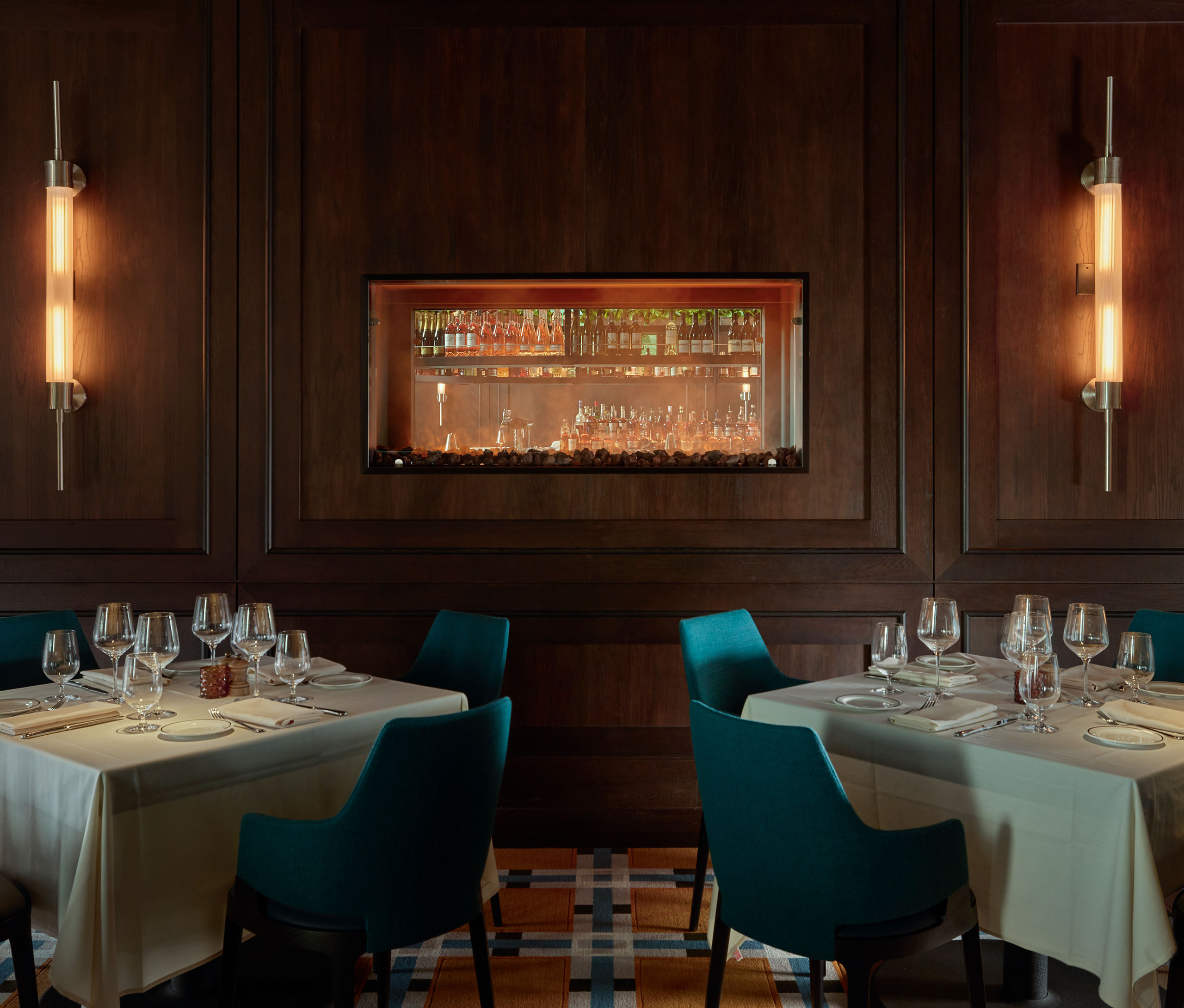 The interior design encompasses a variety of seating areas, offering guests unique dining experiences. The main dining room has subdued lighting, luxurious velvet drapery and dark wood paneling, with elevated booths, backlit whiskey lockers and a two-sided open fireplace, to create a more intimate and formal setting.