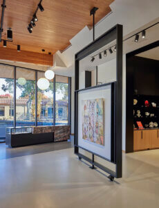 KTGY’s interior designers’ vision leaned into the natural surroundings and took full advantage of the CLT by embracing the warmth of the material and the wide interior spans it creates. Mindful of the specific requirements of a gallery space, the designers brought forward something new to match the innovative approach the architecture team had taken. Custom shelving and rotating walls accommodate a myriad of art and adjust the flow of gallery visitors, creating a flexible yet unified space.