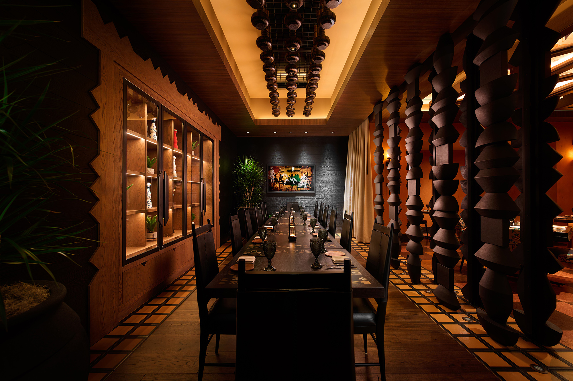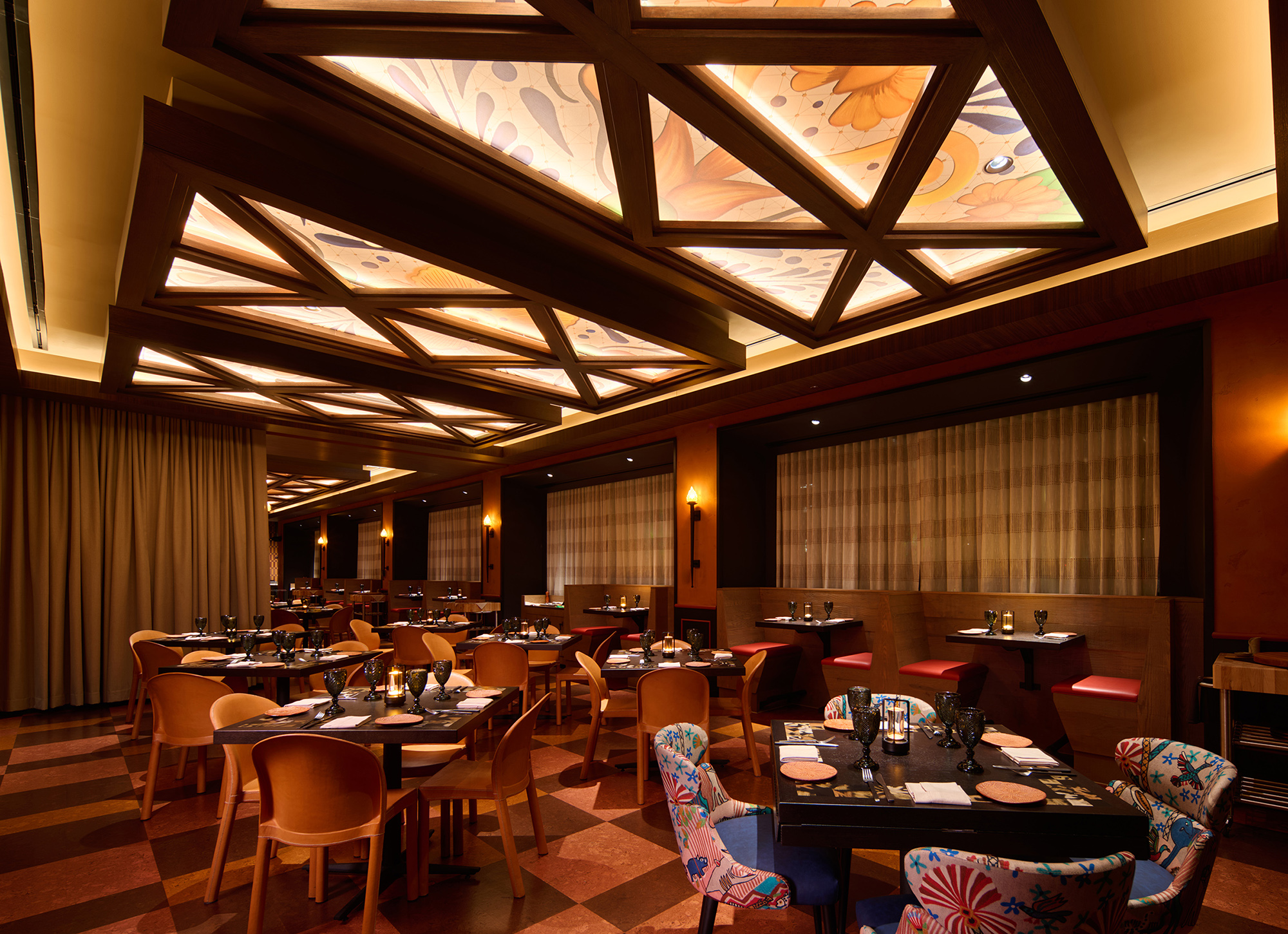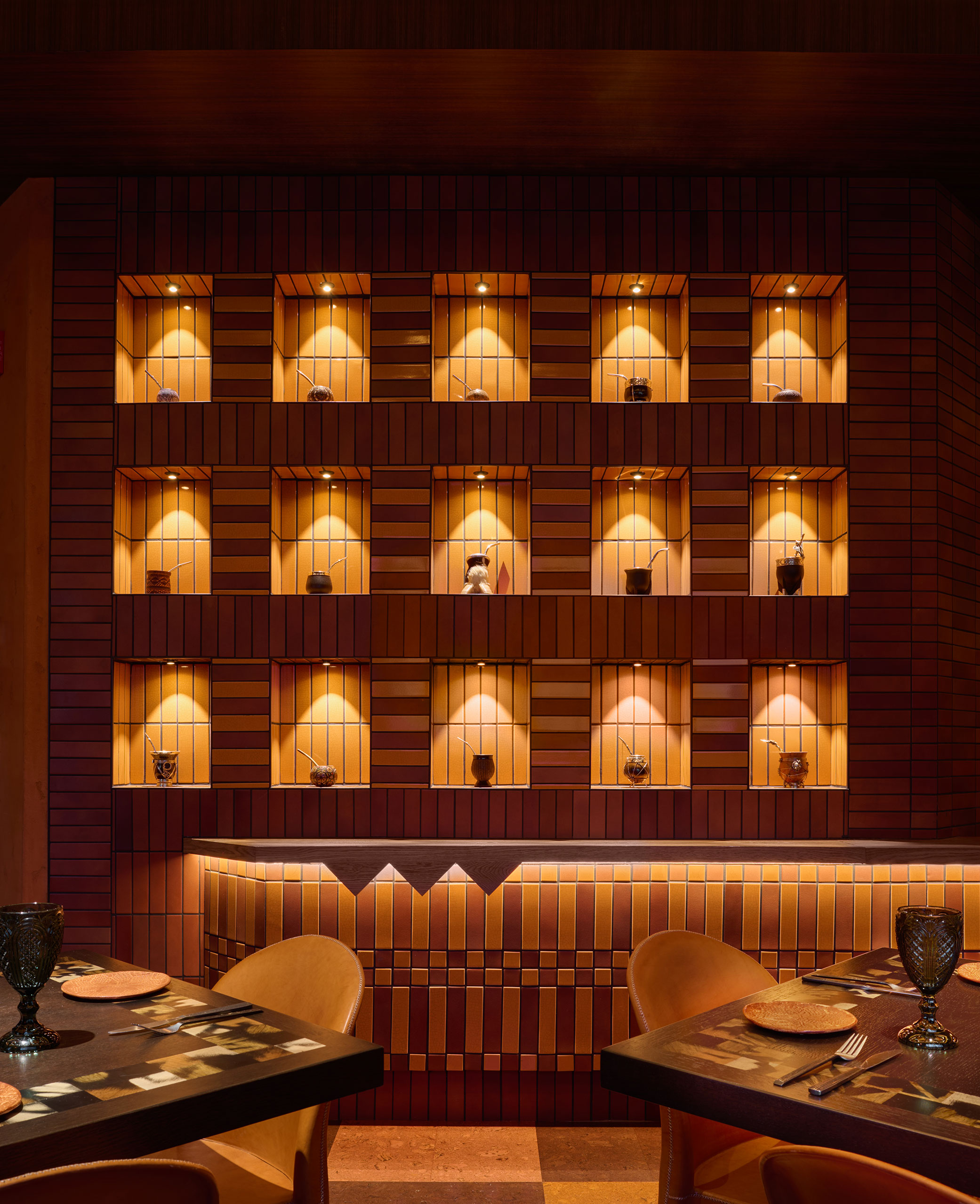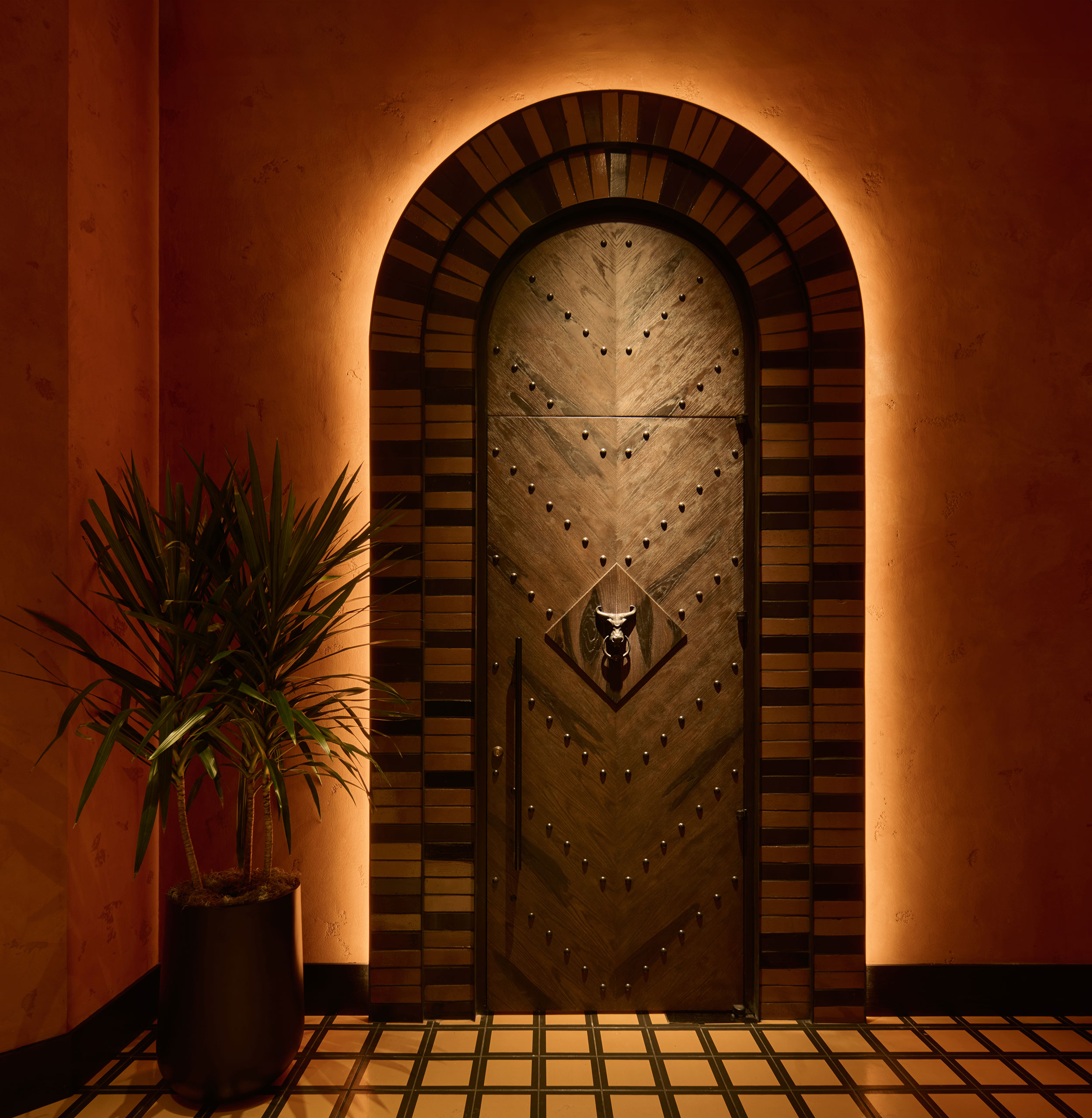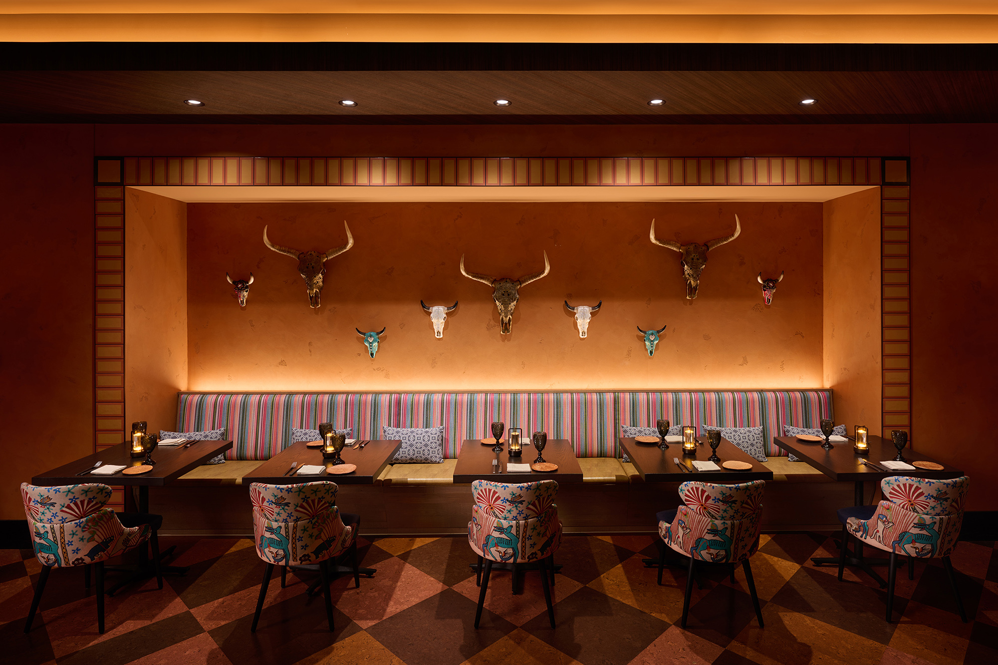 The designers created opportunity in a slim, L-shaped renovation space by creating a new entry vestibule off the hotel lobby. This makes a striking new activation for the lobby, drawing guests through a brick arch and monumental wood plank doors, leading to the host station and vestibule. To the north, the main cocktail bar and lounge is a relaxed space underlined by a large liquor display with internally lit shelves. The south end introduces the main dining area, private dining room and live-fire and ceviche bar. The bull and vaquero motif found in wall art and finish gives the restaurant a slight rustic edge, while patterns, tiles and textures root the design in a refined sense of Latin-American craftmanship.